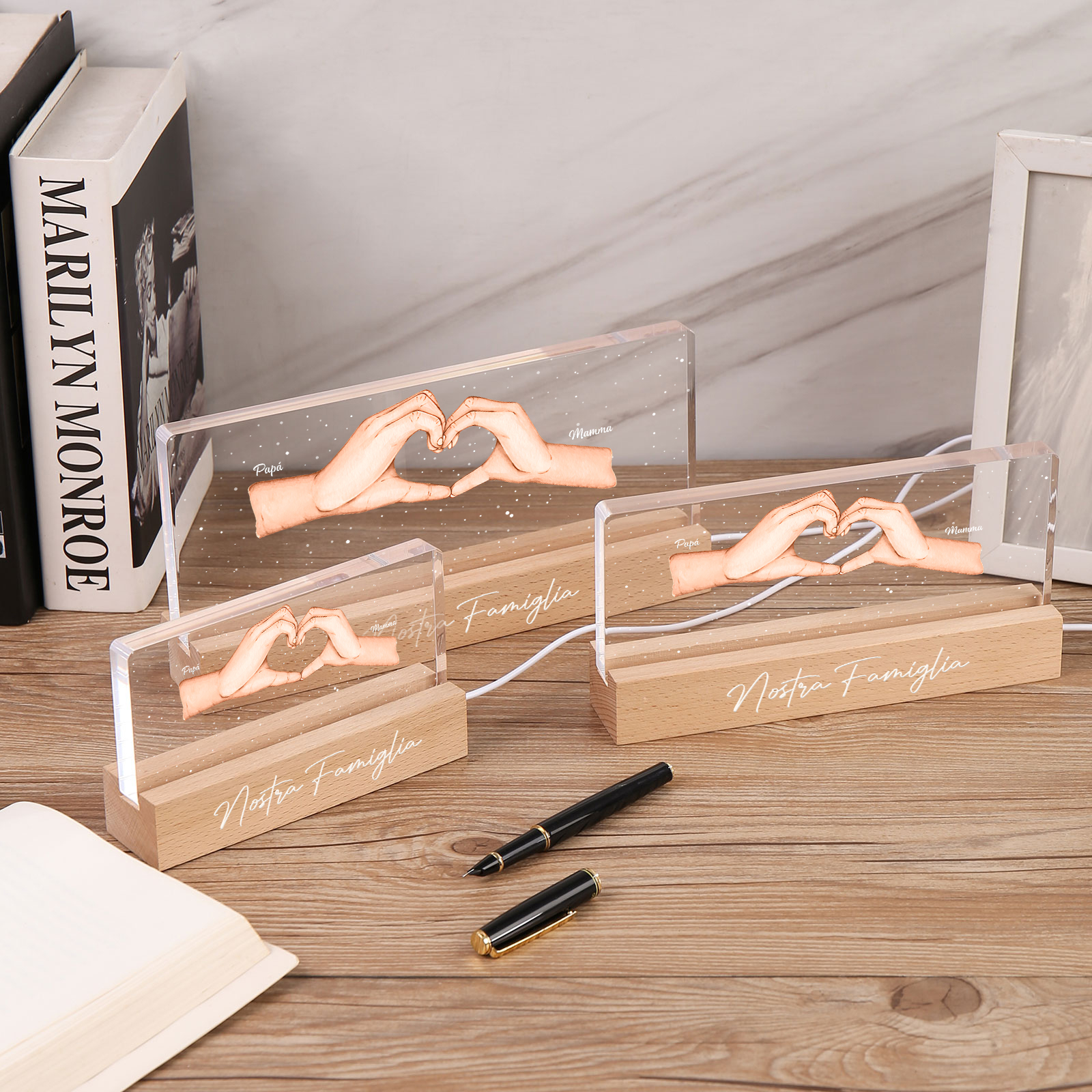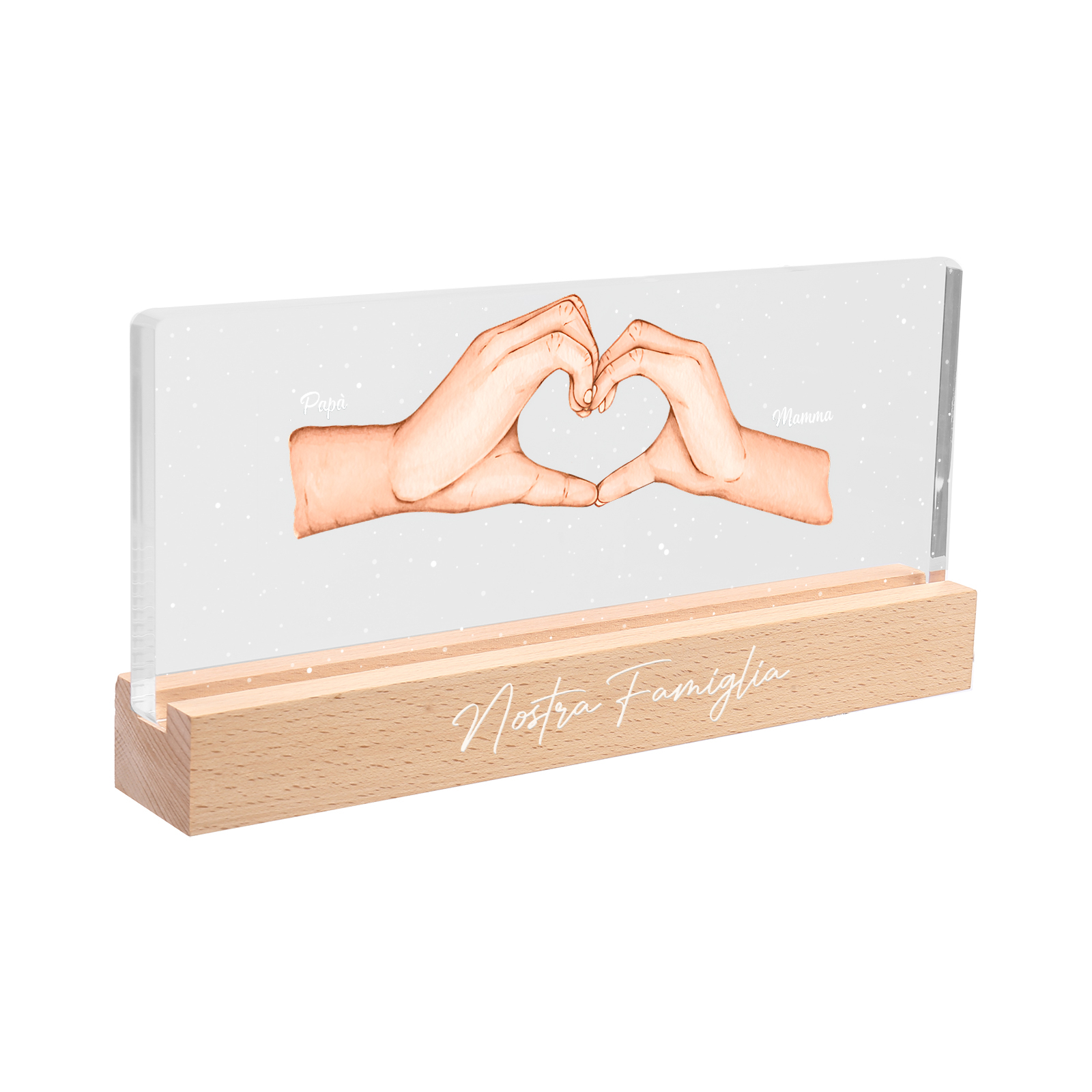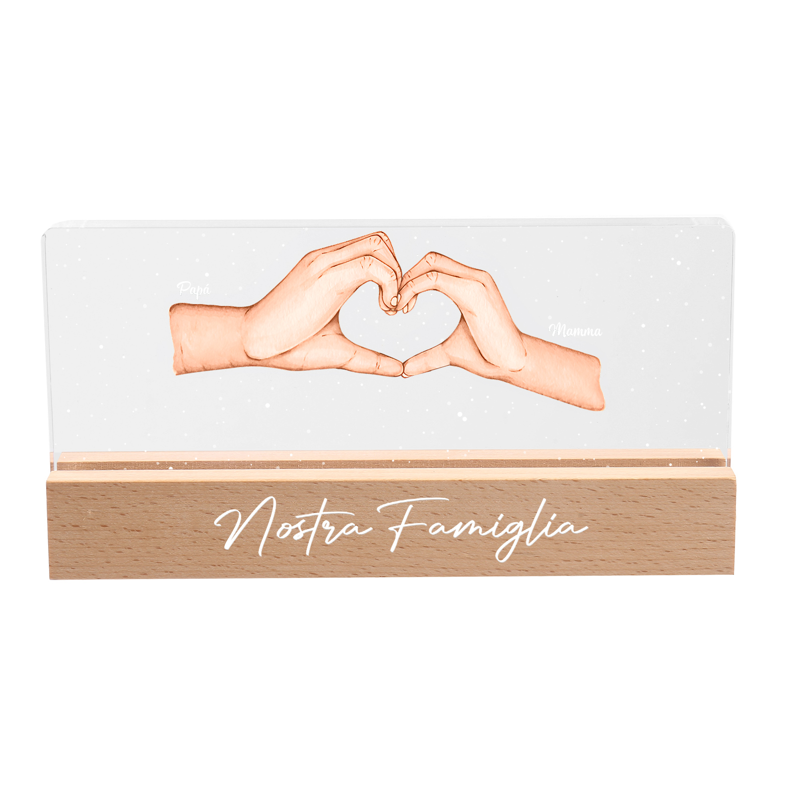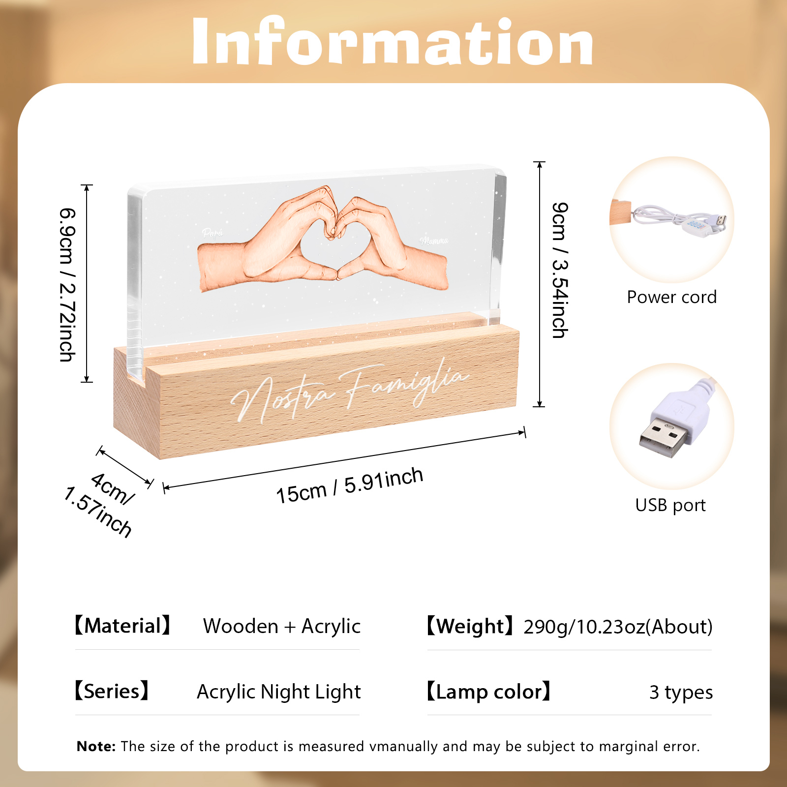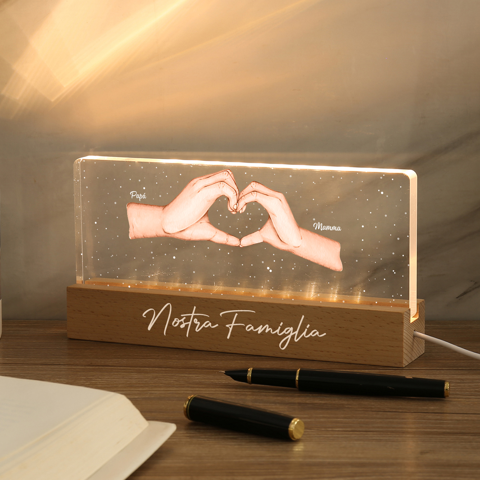 Lampada mano e mano a cuore a tre colori con 2 nomi e 1 testo personalizzati per famiglia