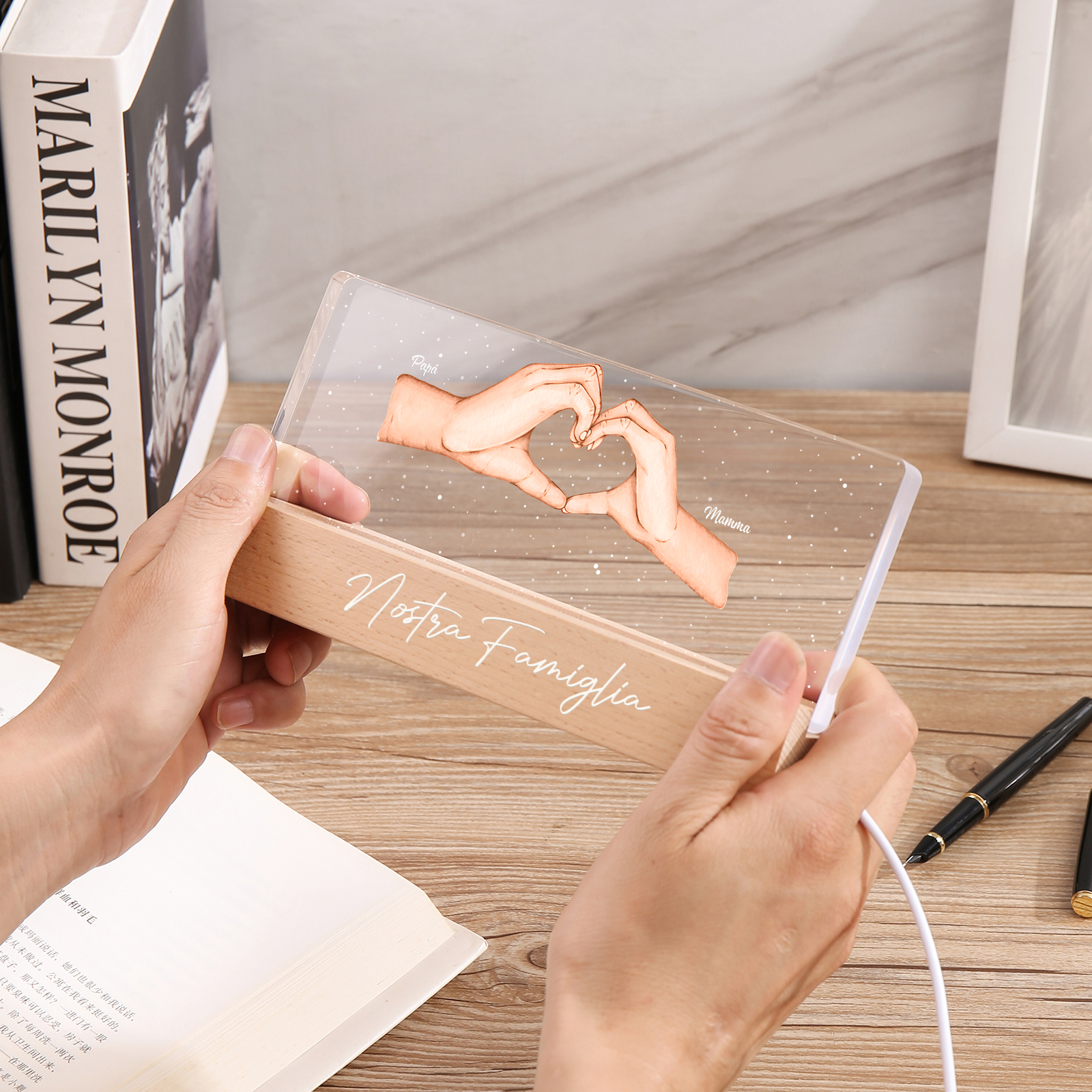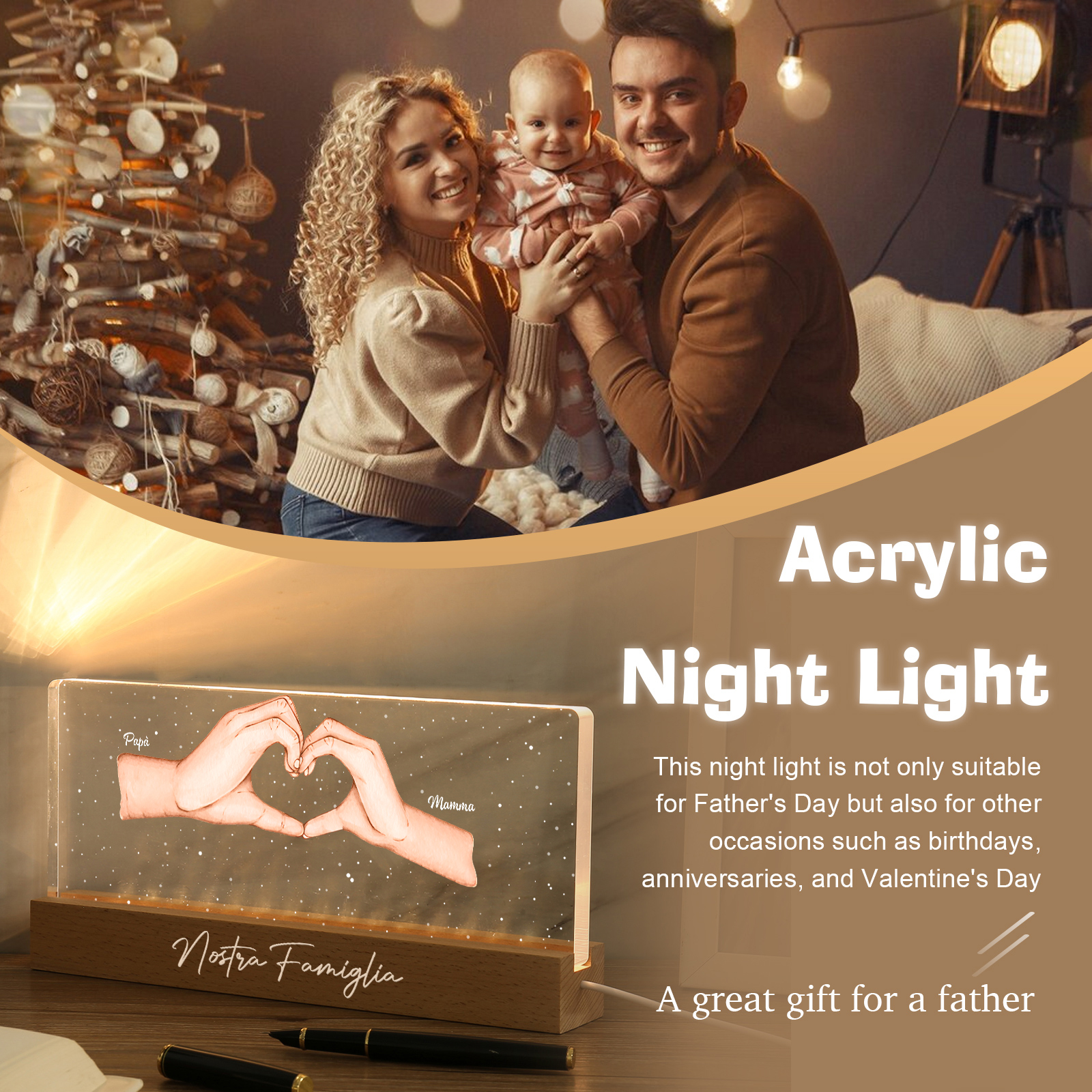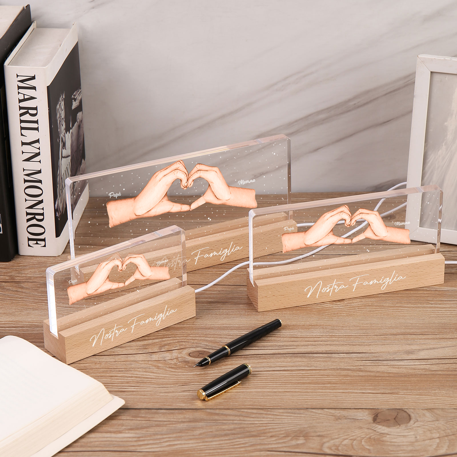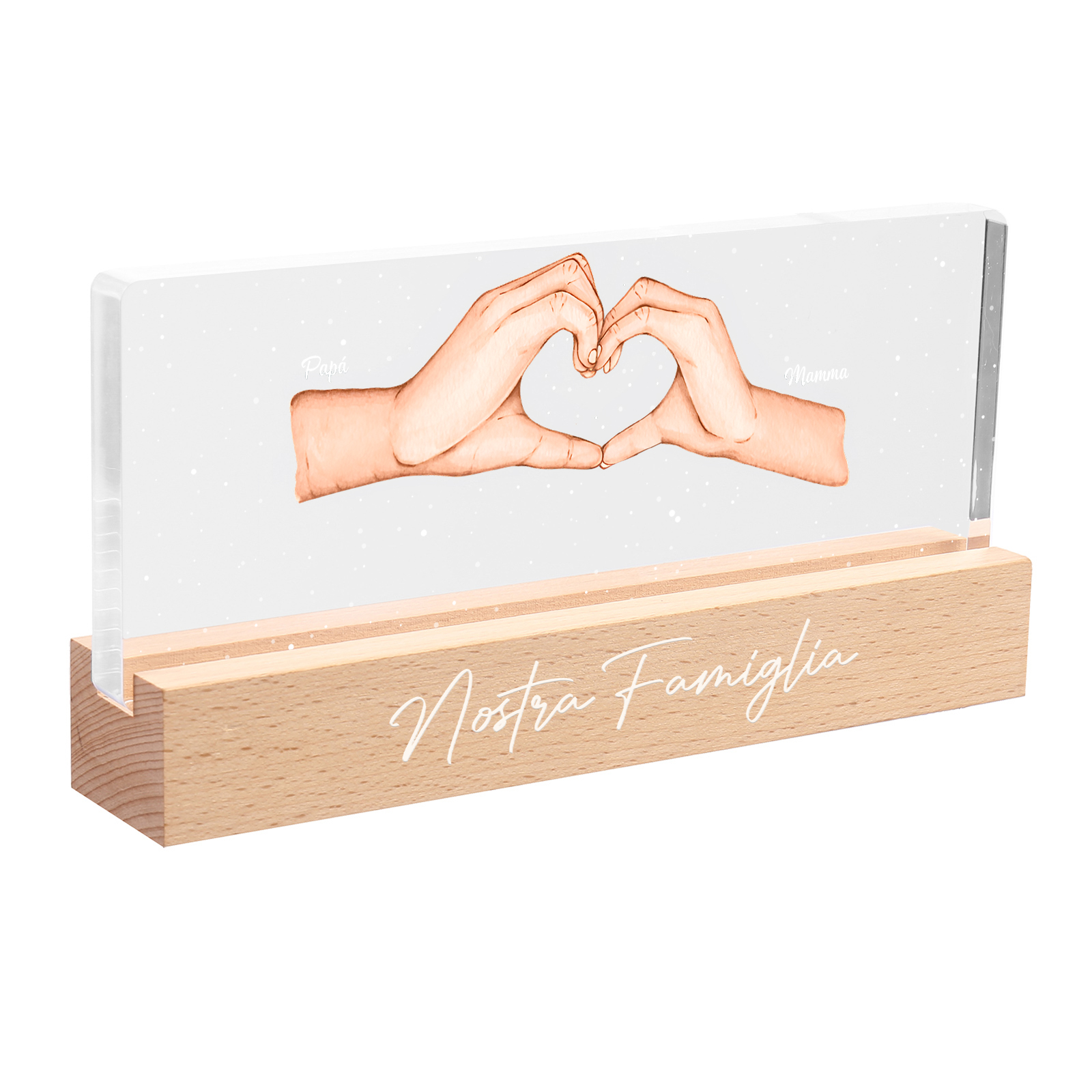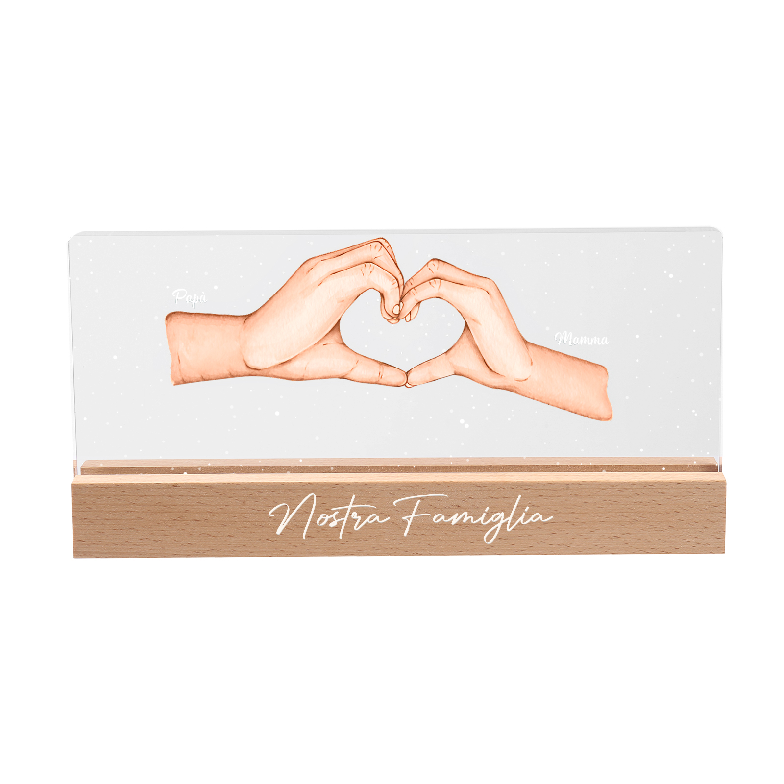 Lampada mano e mano a cuore a tre colori con 2 nomi e 1 testo personalizzati per famiglia