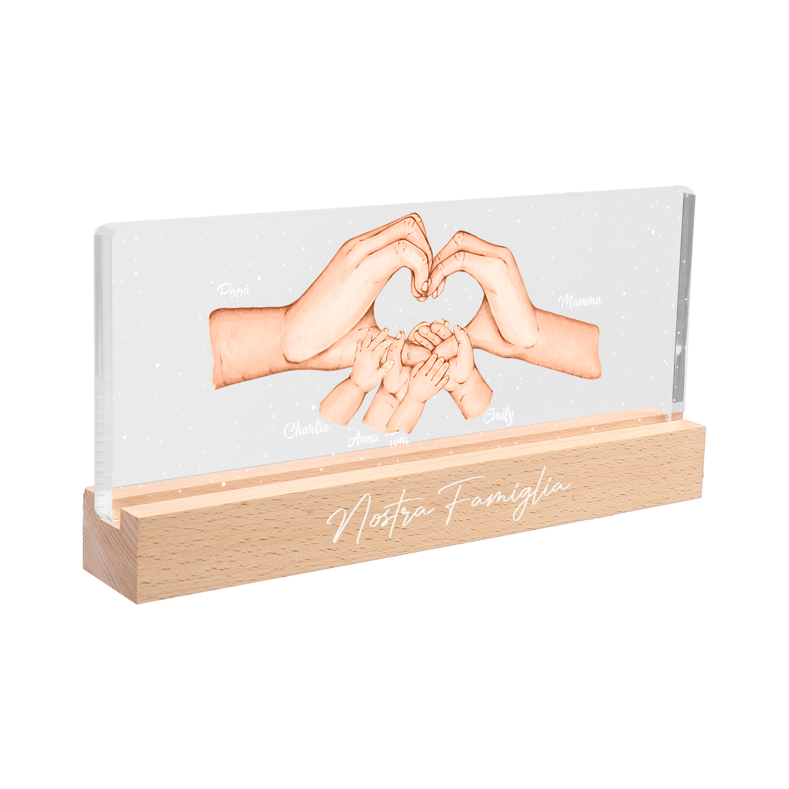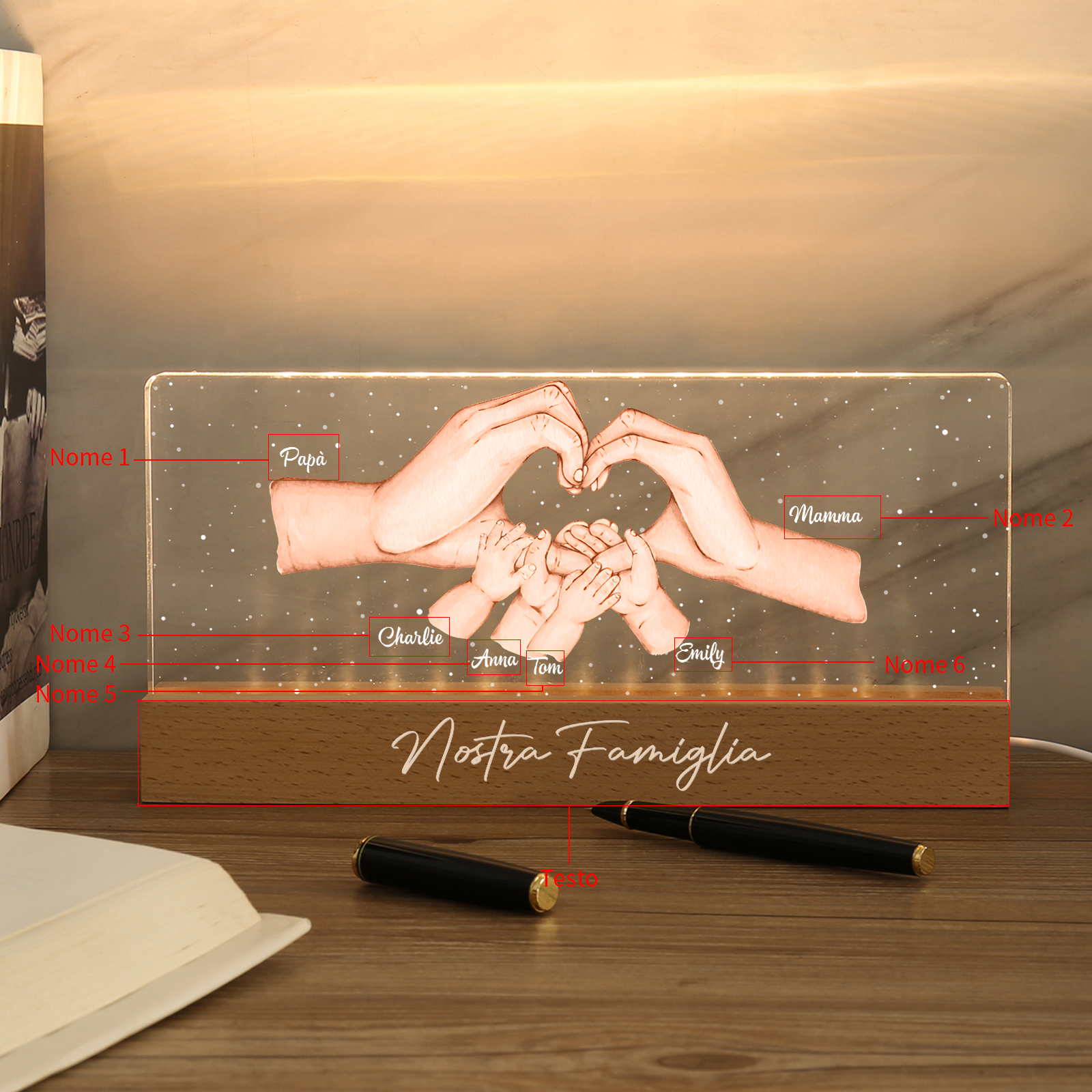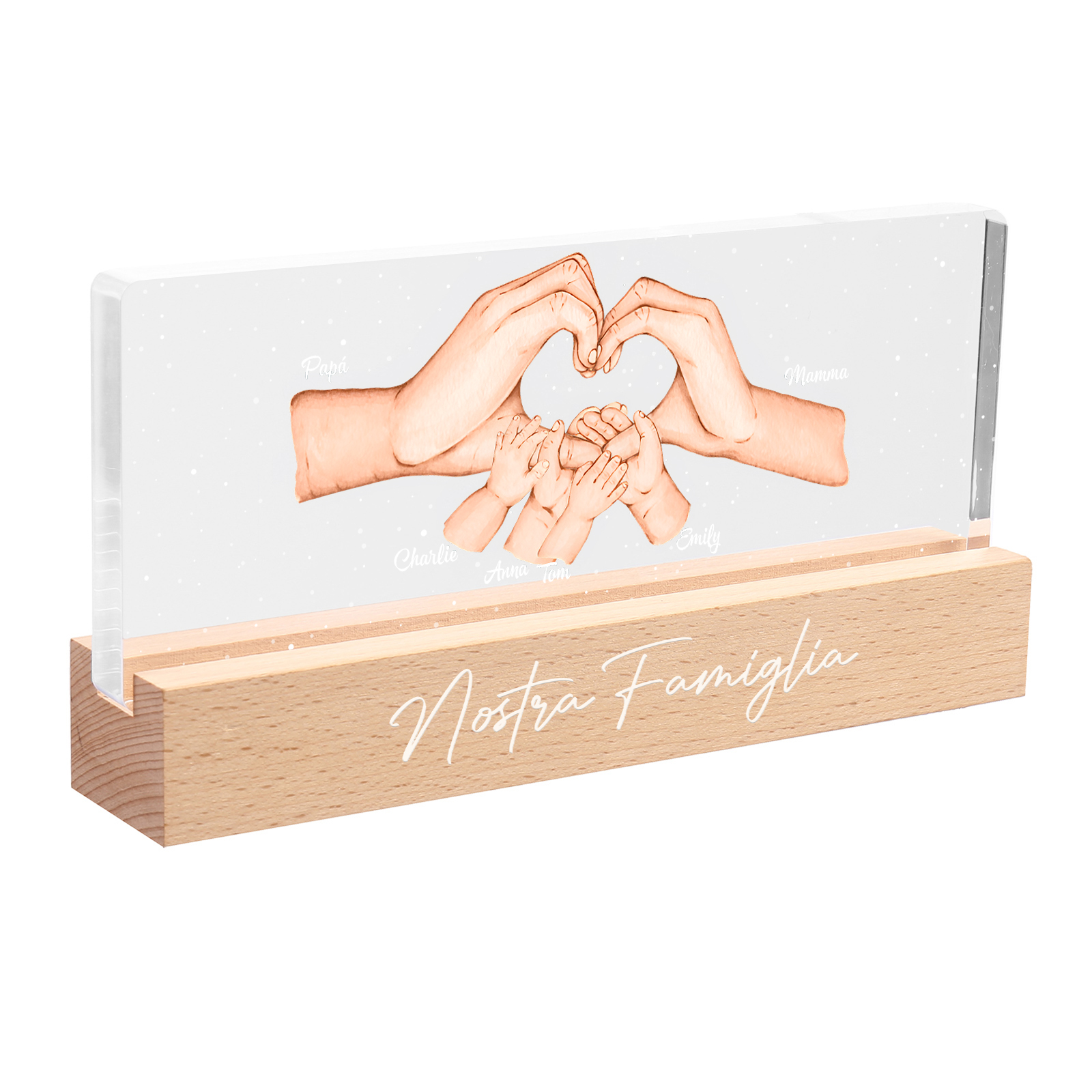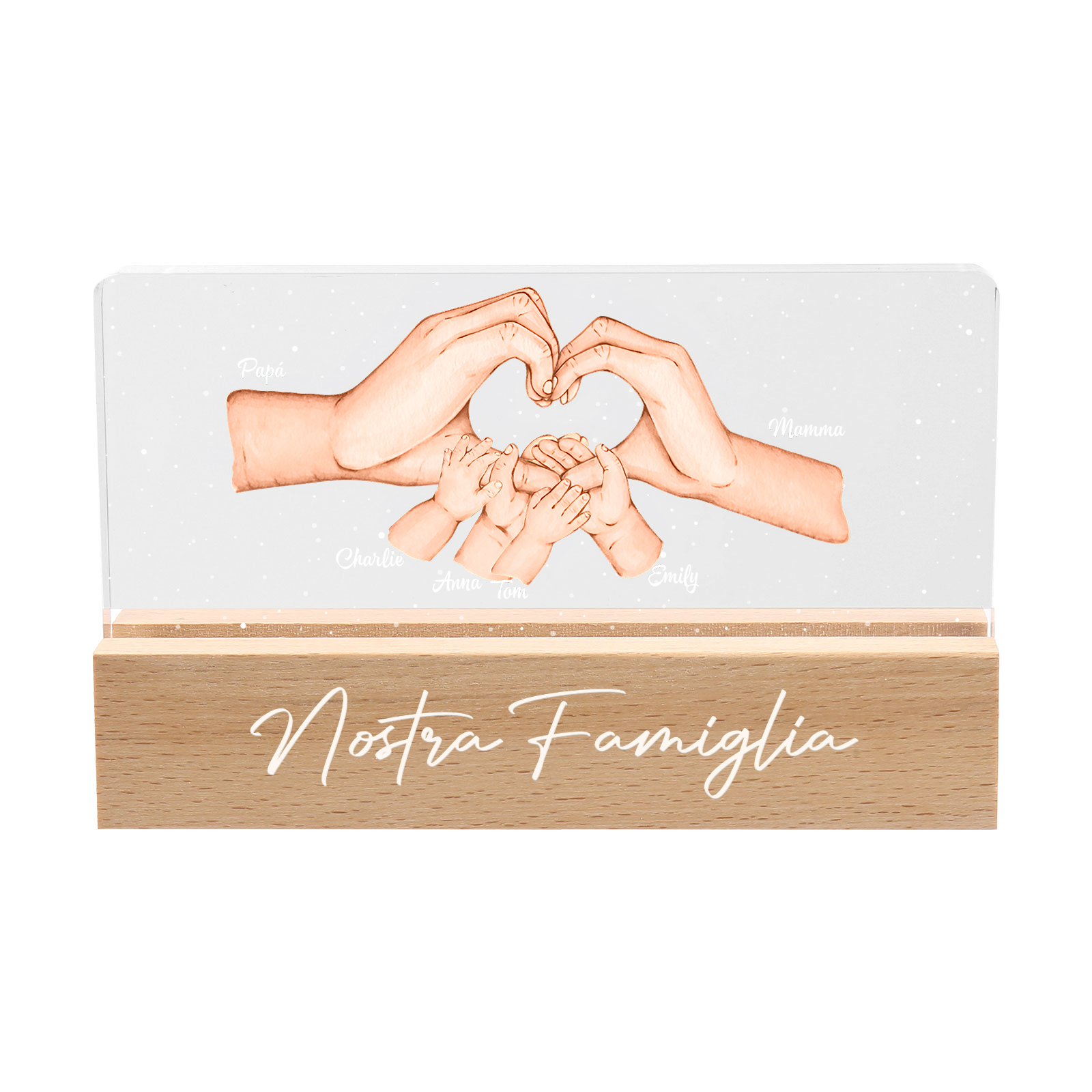Lampada a tre colori con mano e mano a cuore con 6 nomi e 1 testo personalizzati per famiglia