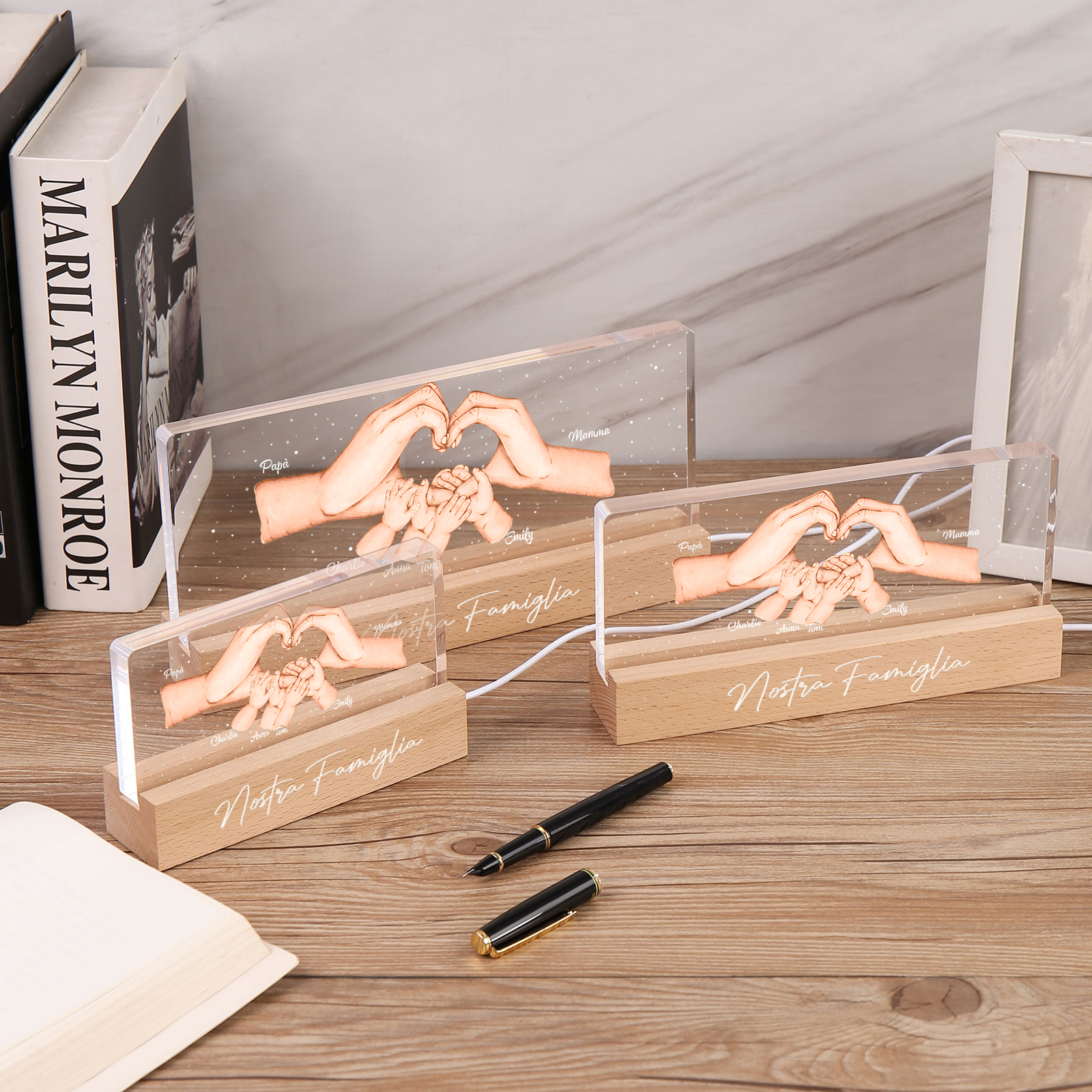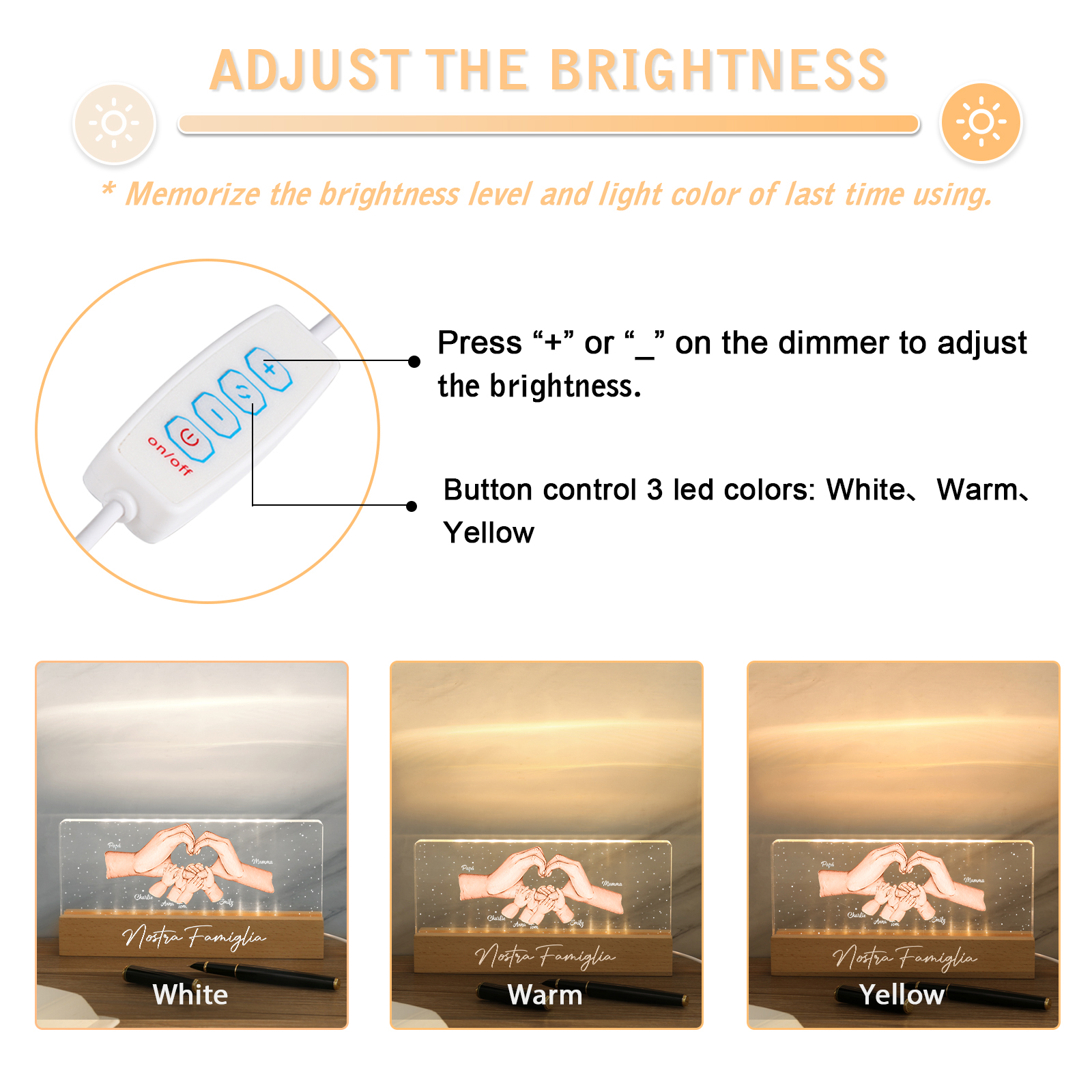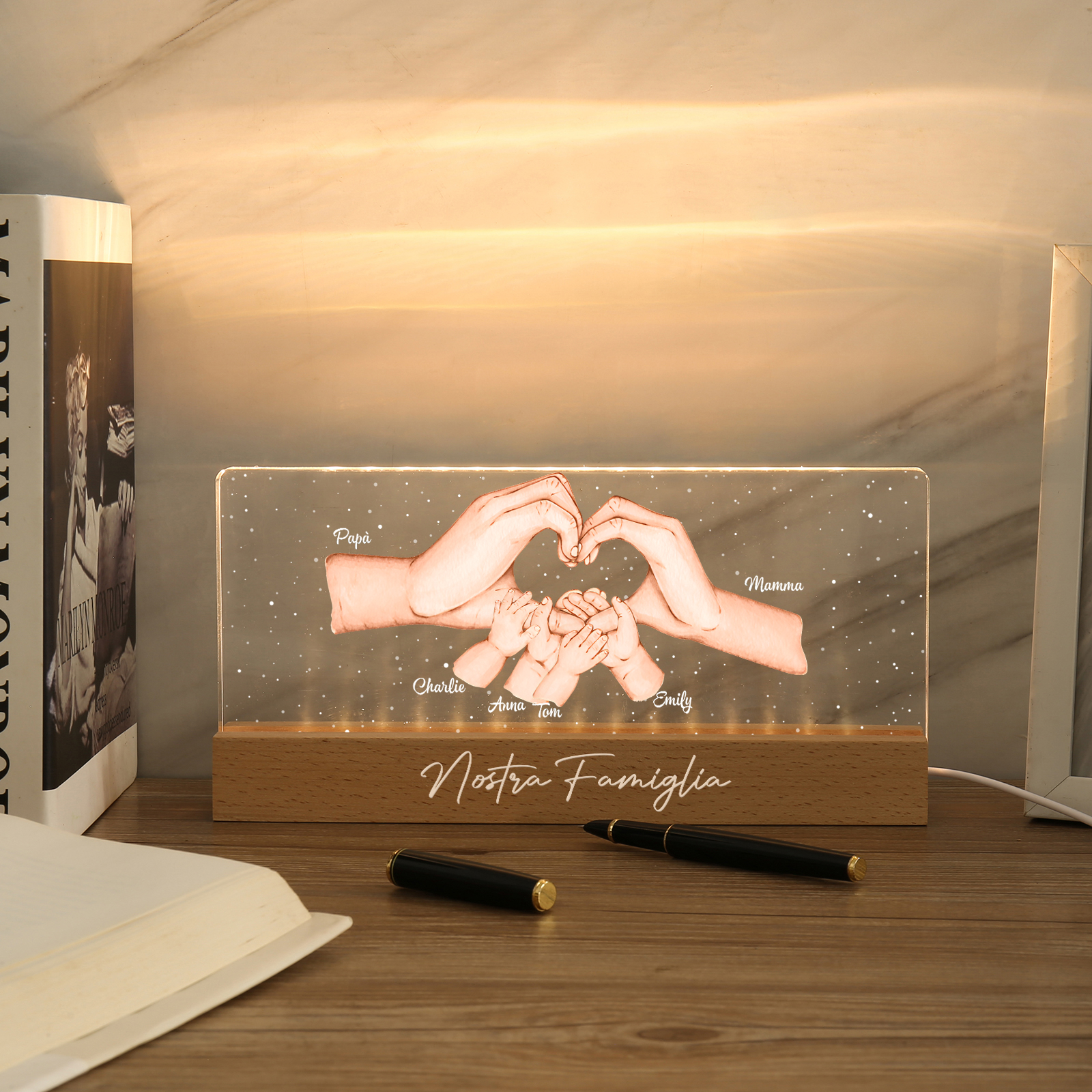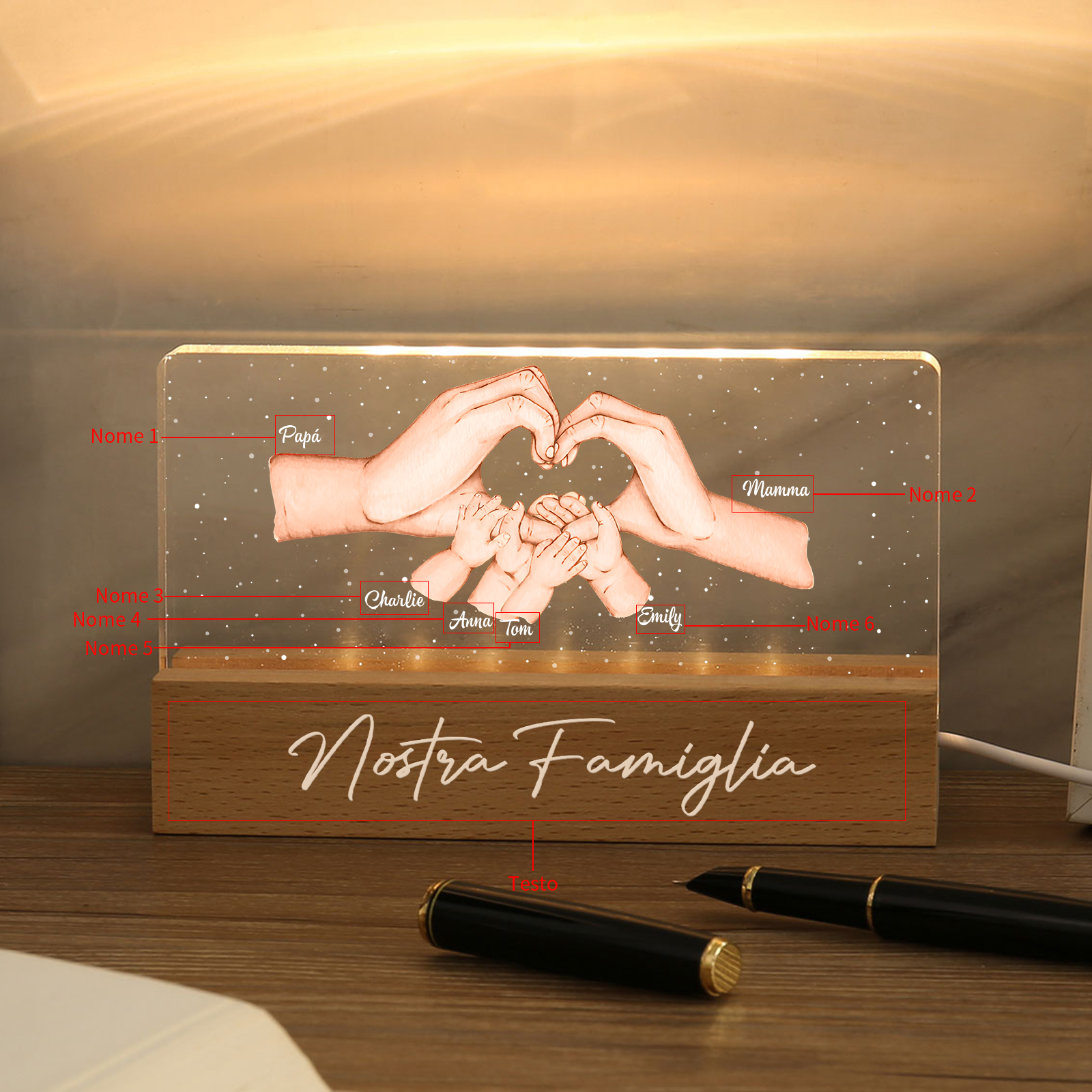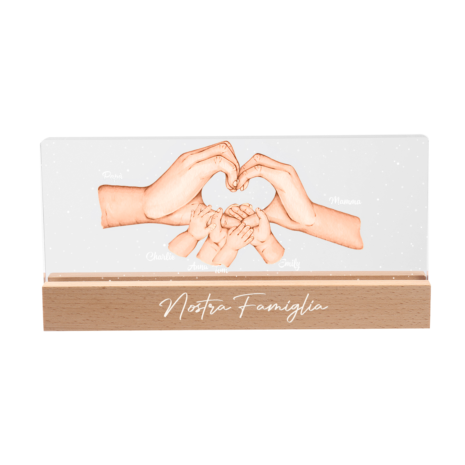 Lampada a tre colori con mano e mano a cuore con 6 nomi e 1 testo personalizzati per famiglia