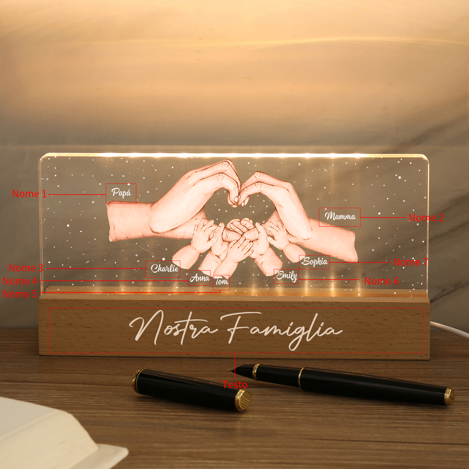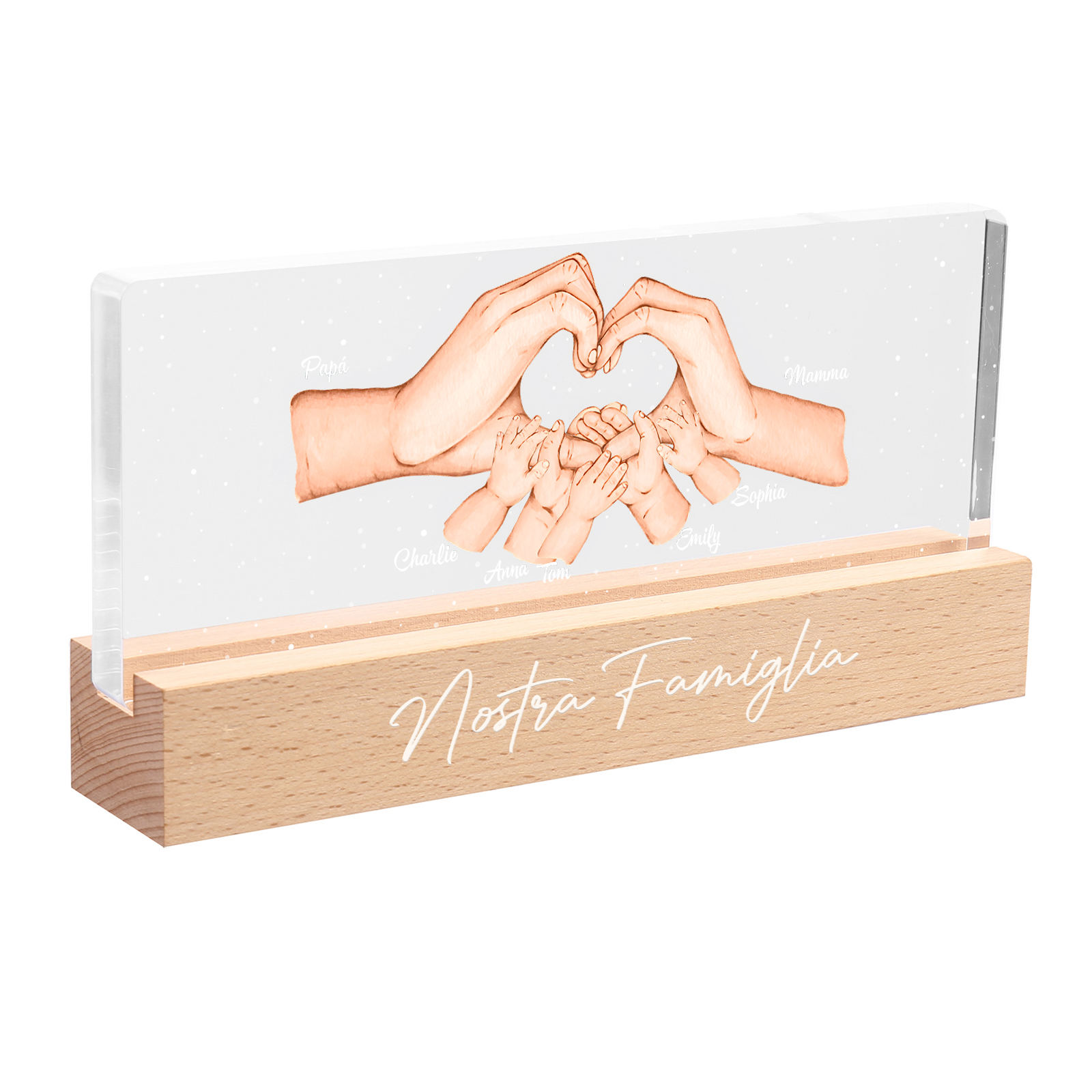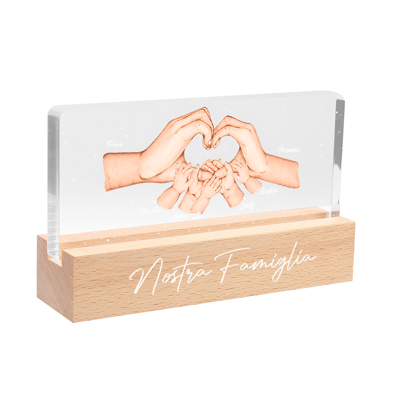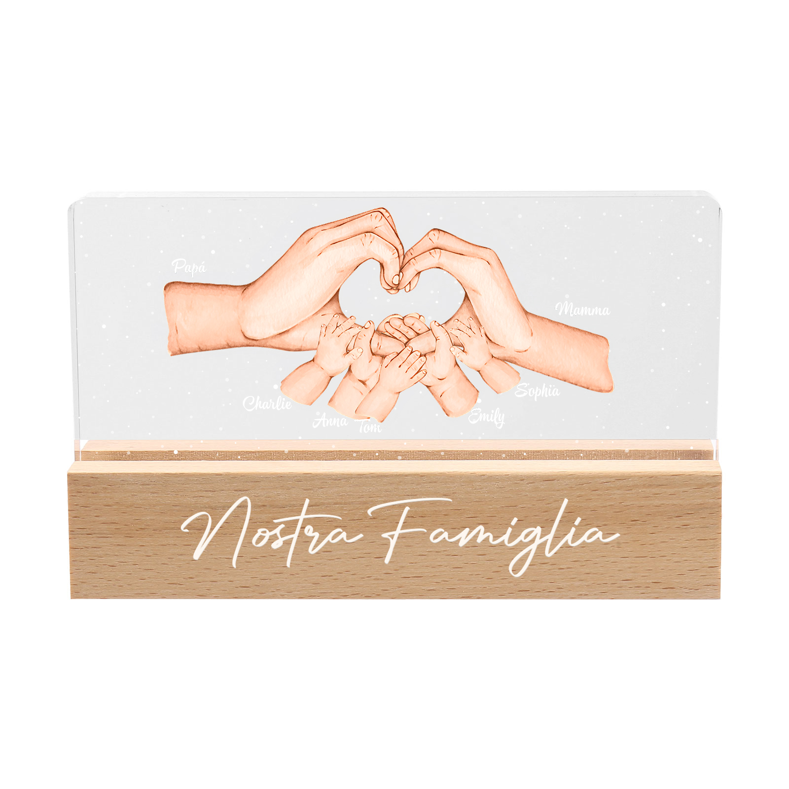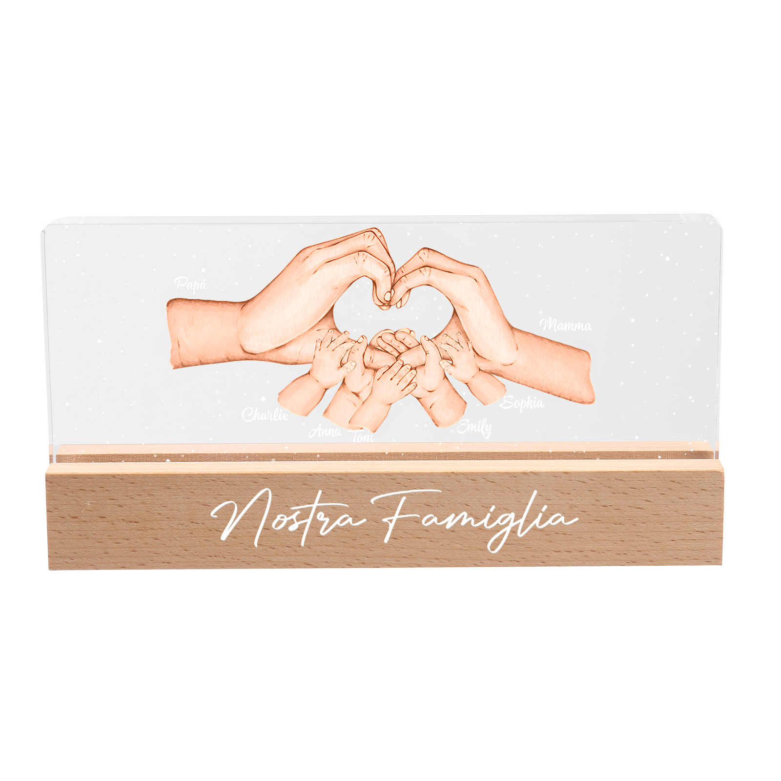 Lampada a tre colori con mano e mano a cuore con 7 nomi e 1 testo personalizzati per famiglia