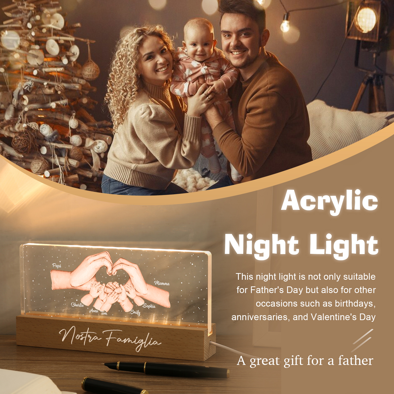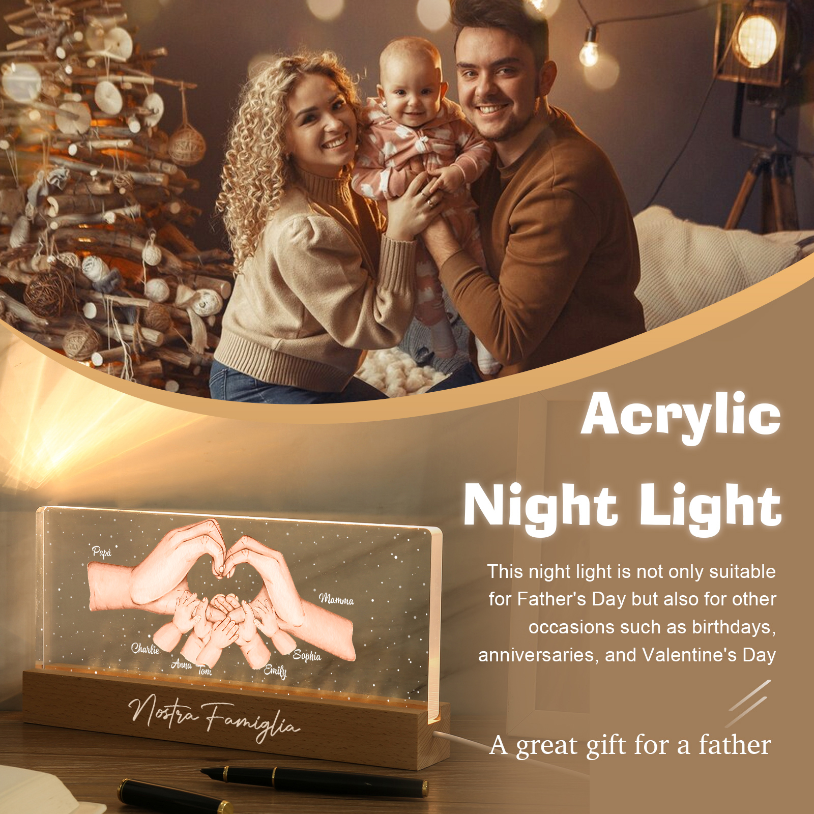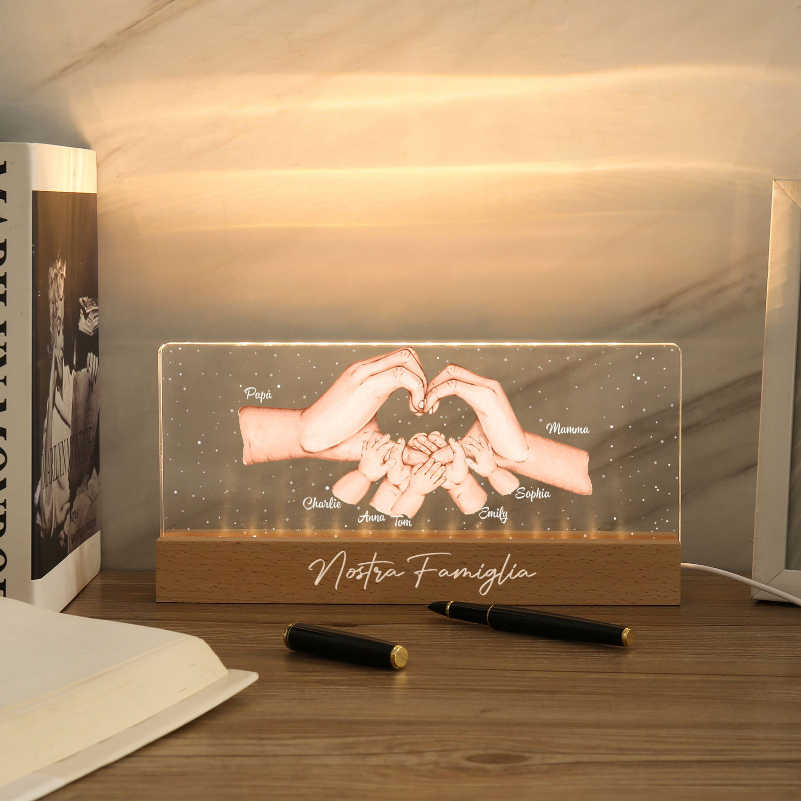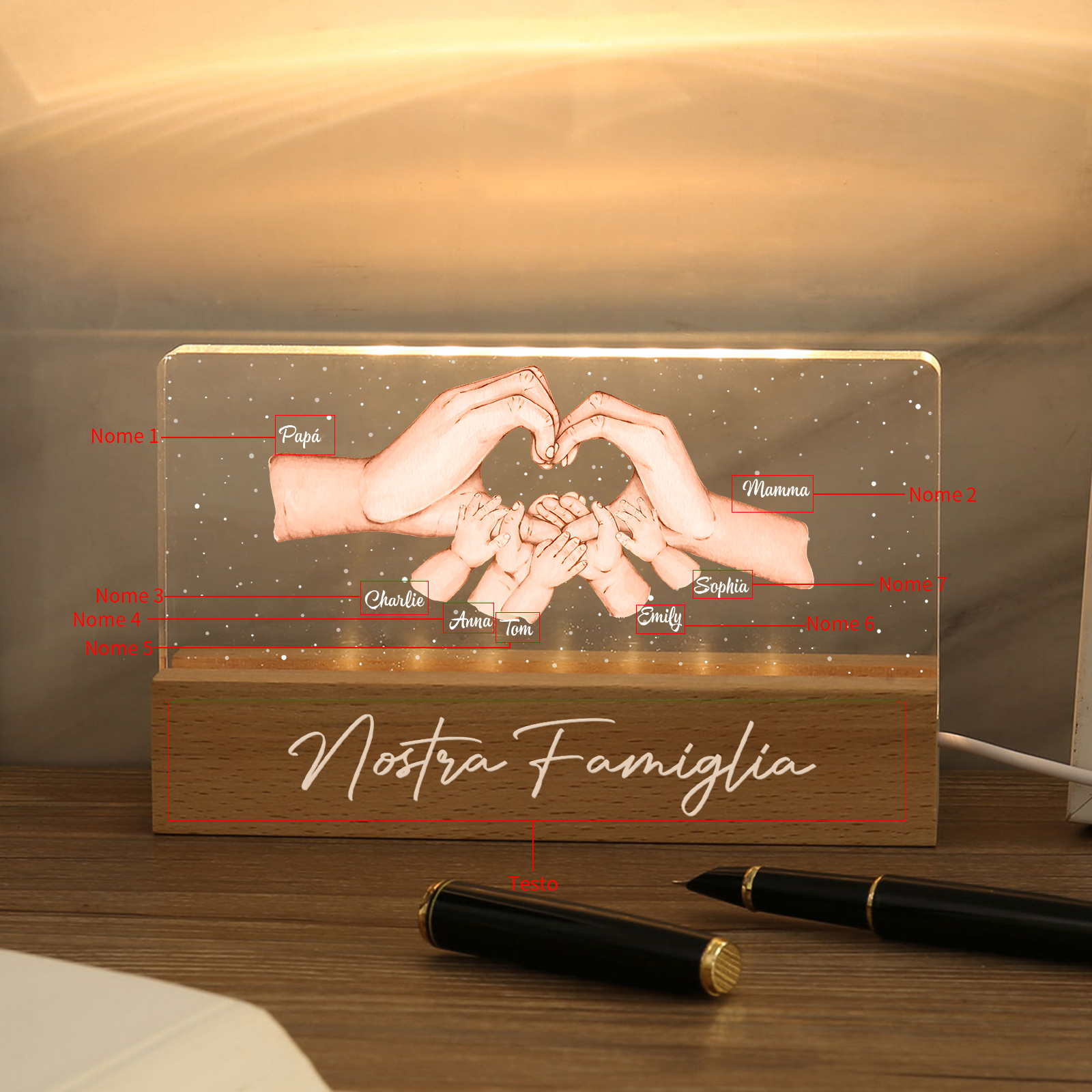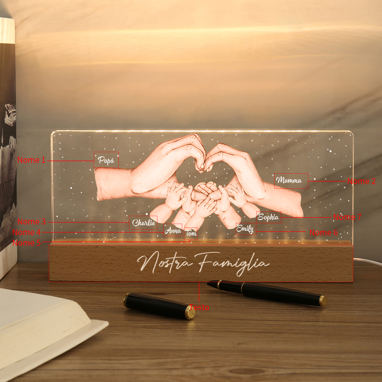 Lampada a tre colori con mano e mano a cuore con 7 nomi e 1 testo personalizzati per famiglia