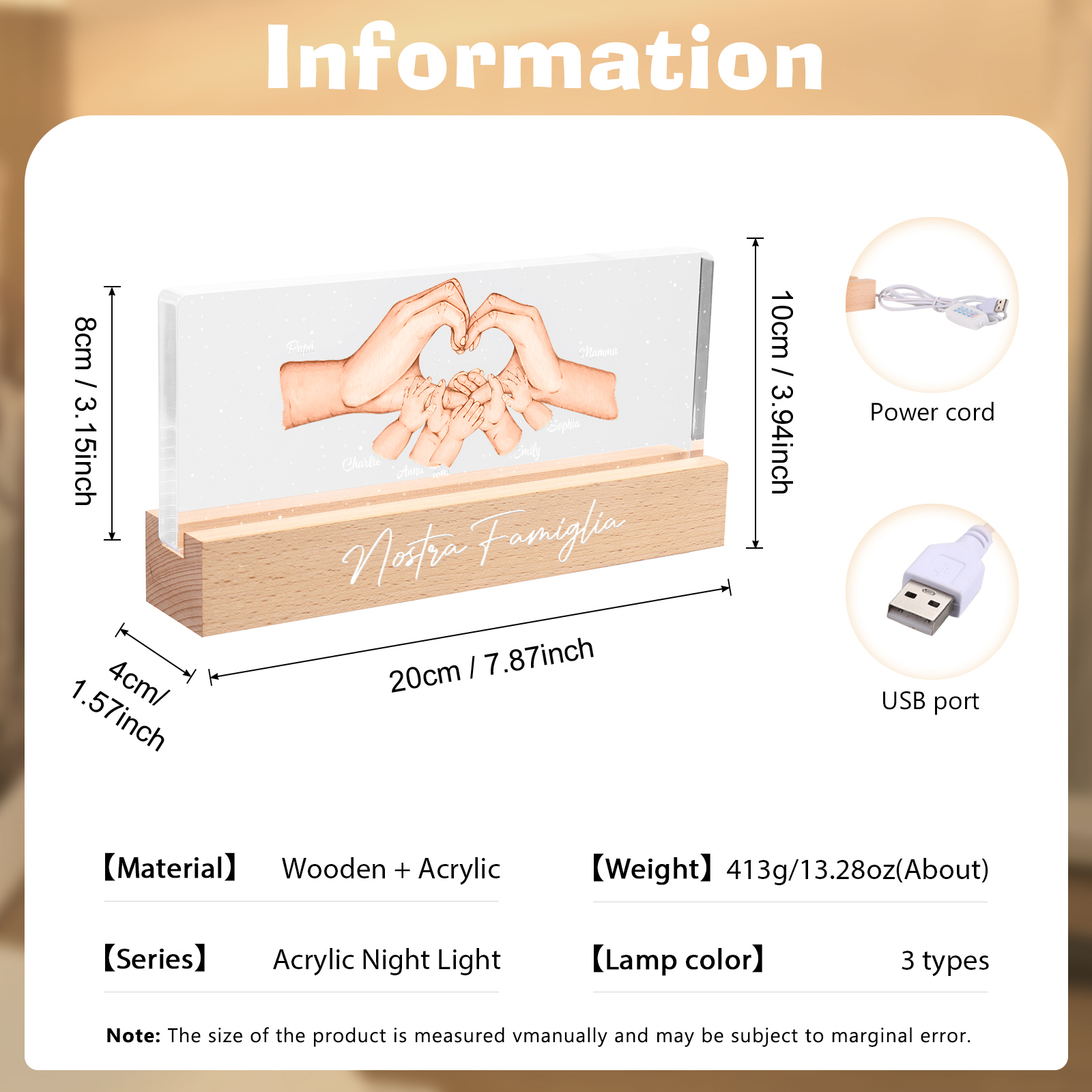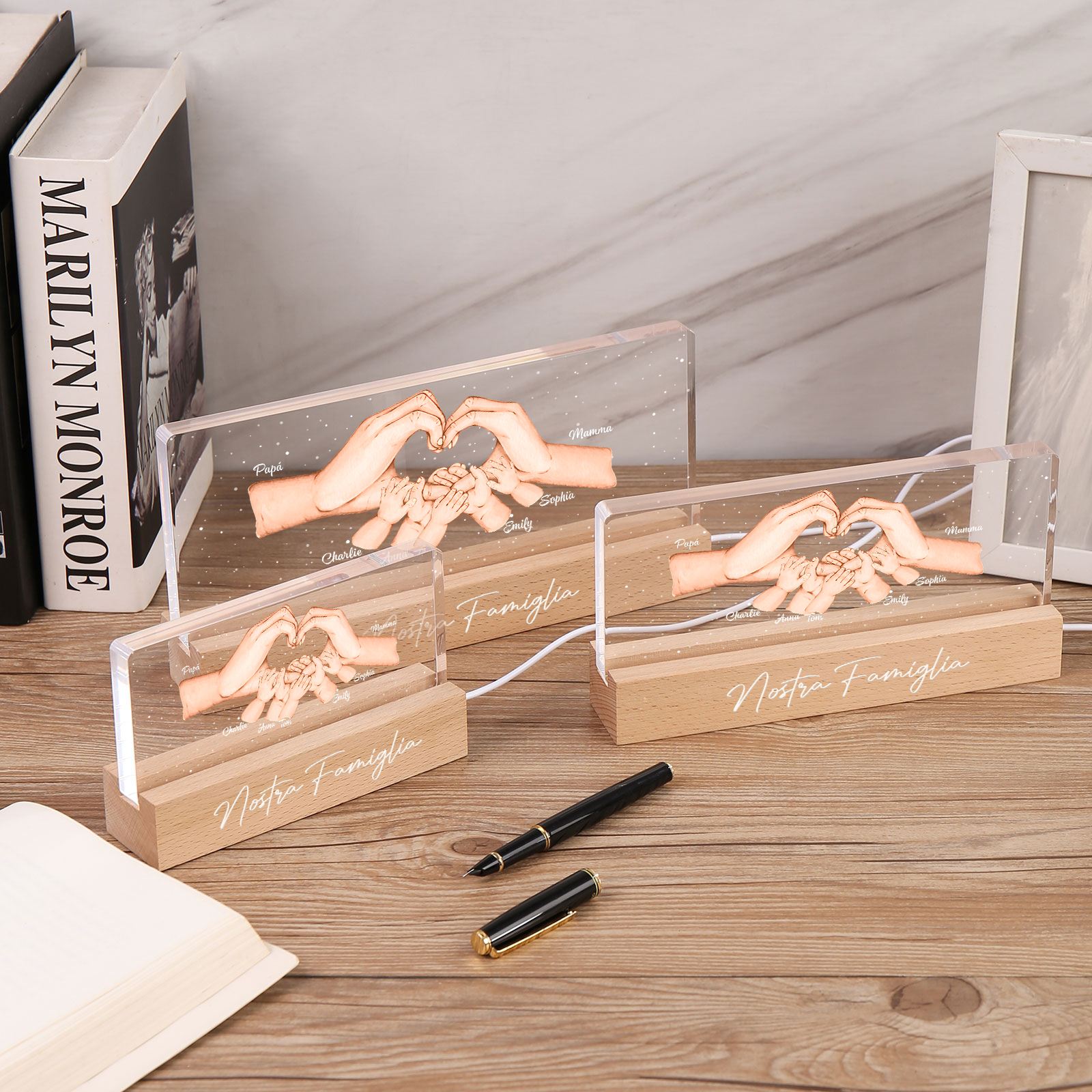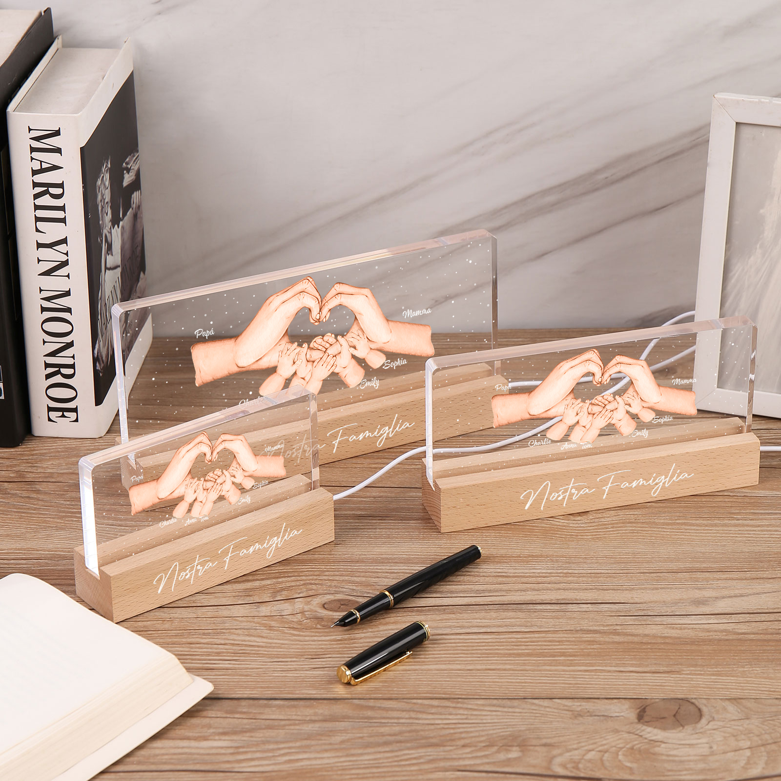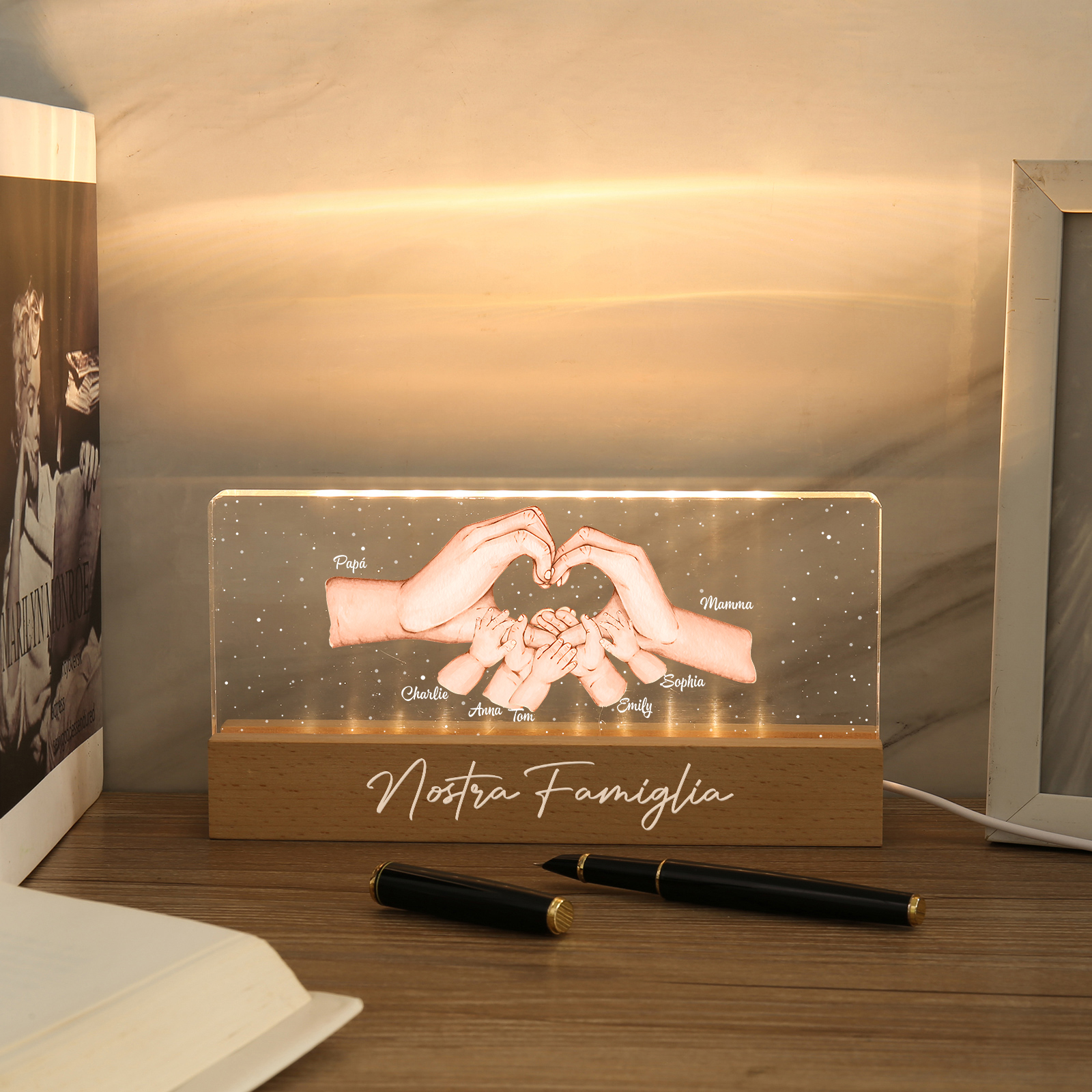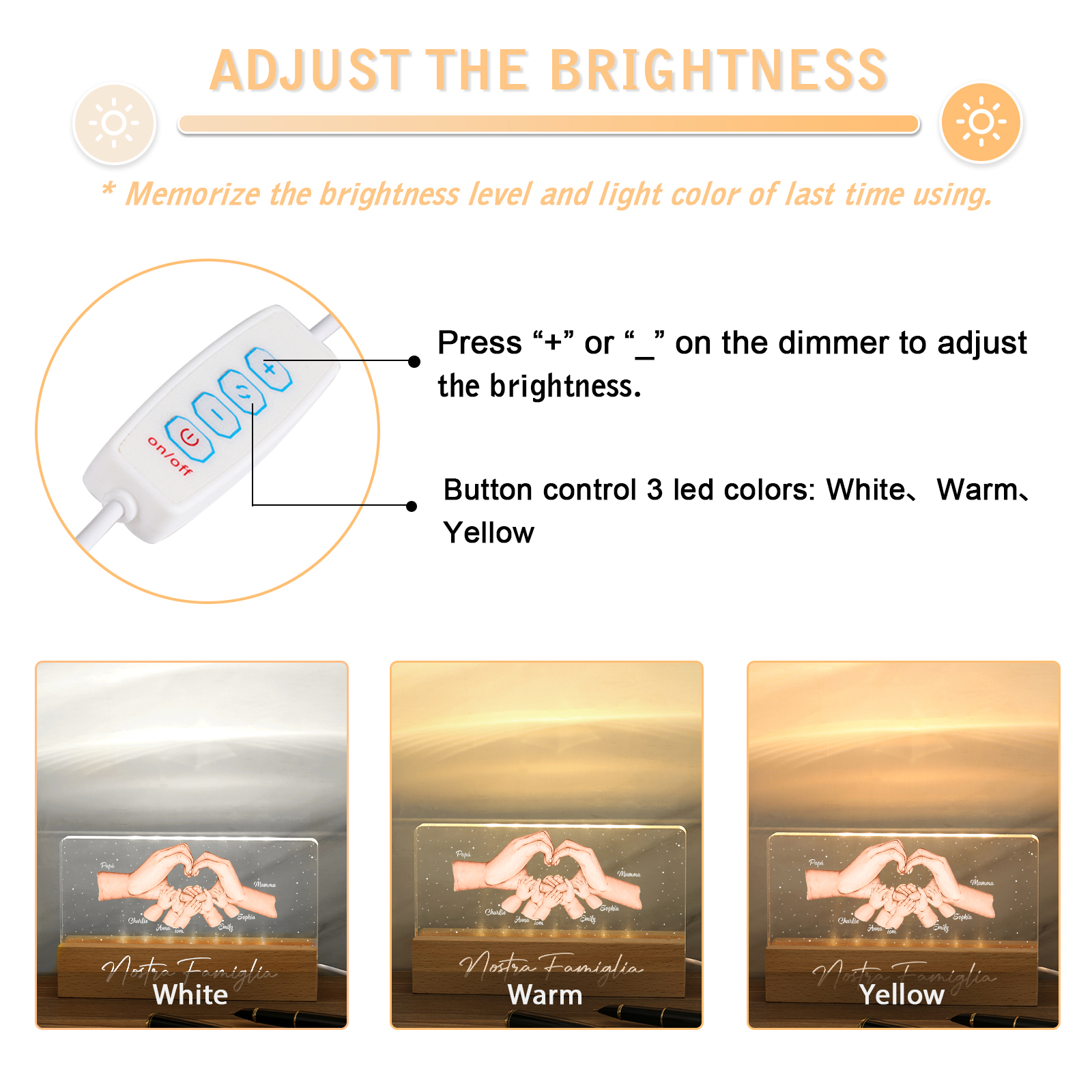 Lampada a tre colori con mano e mano a cuore con 7 nomi e 1 testo personalizzati per famiglia