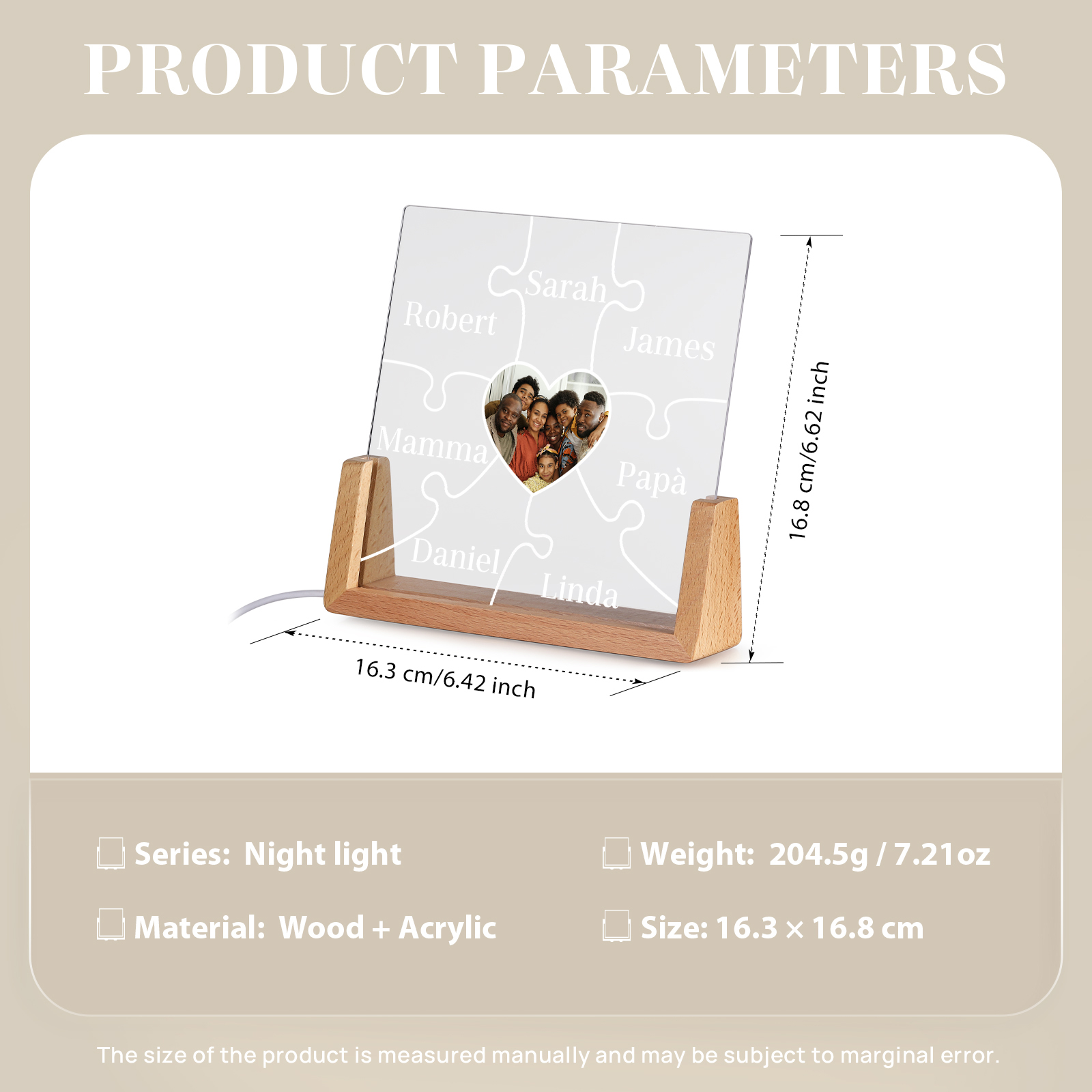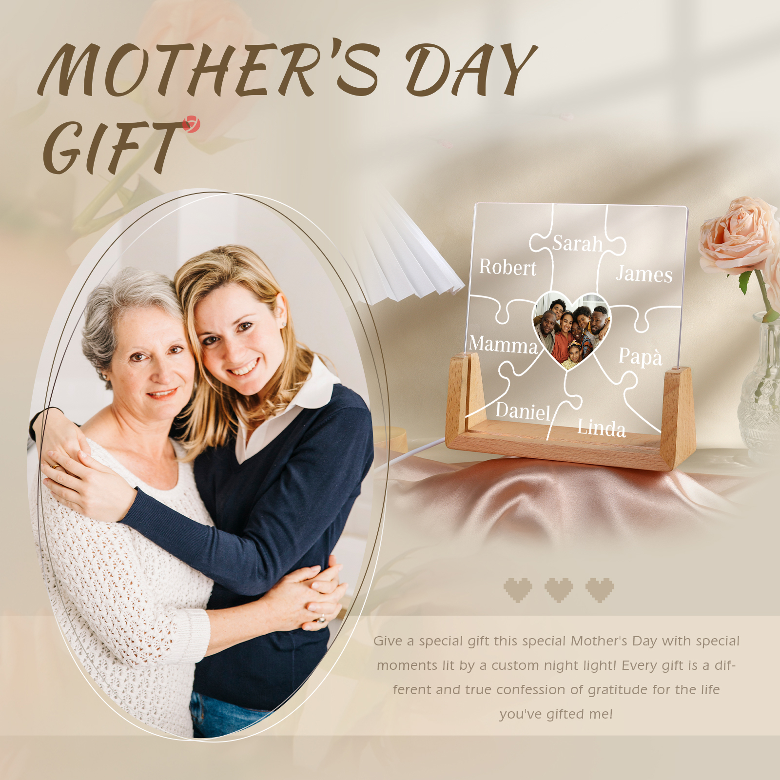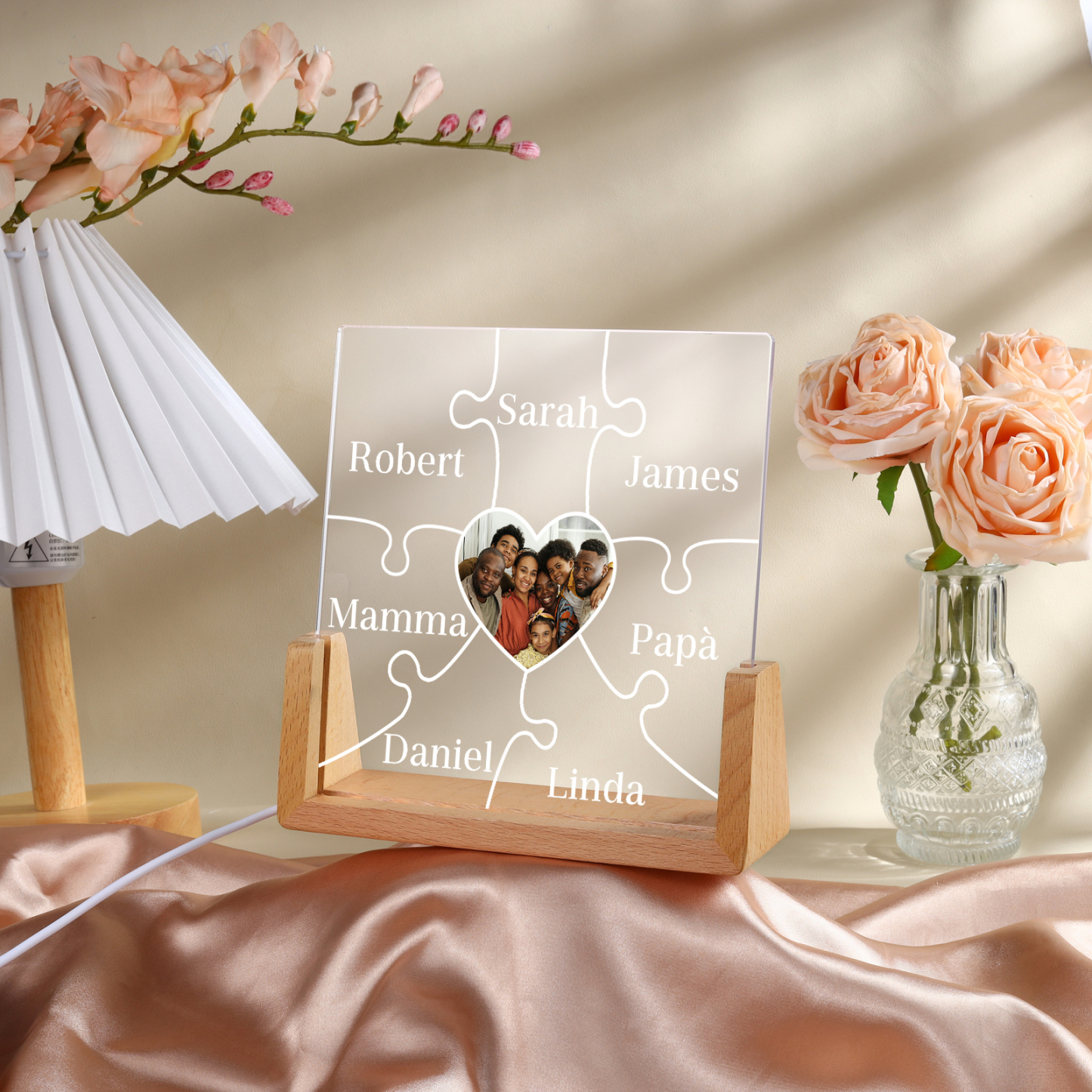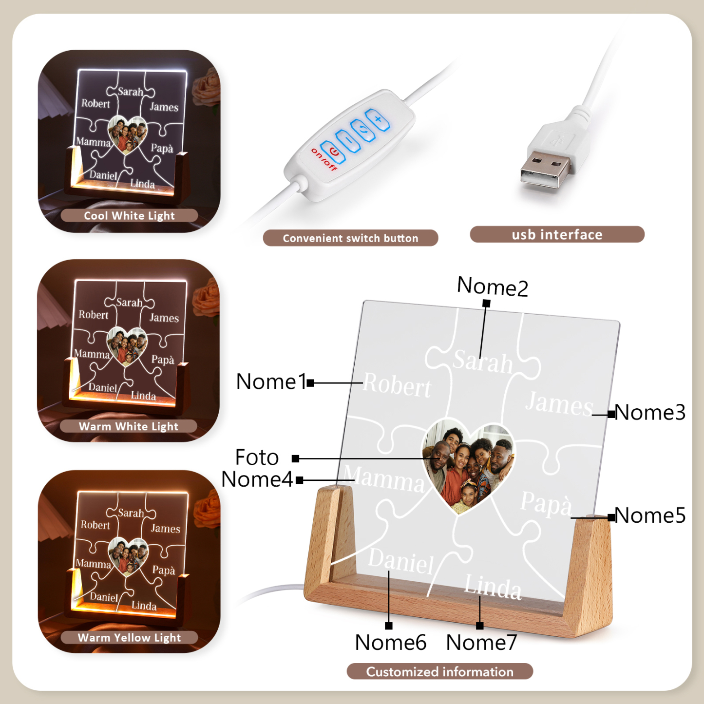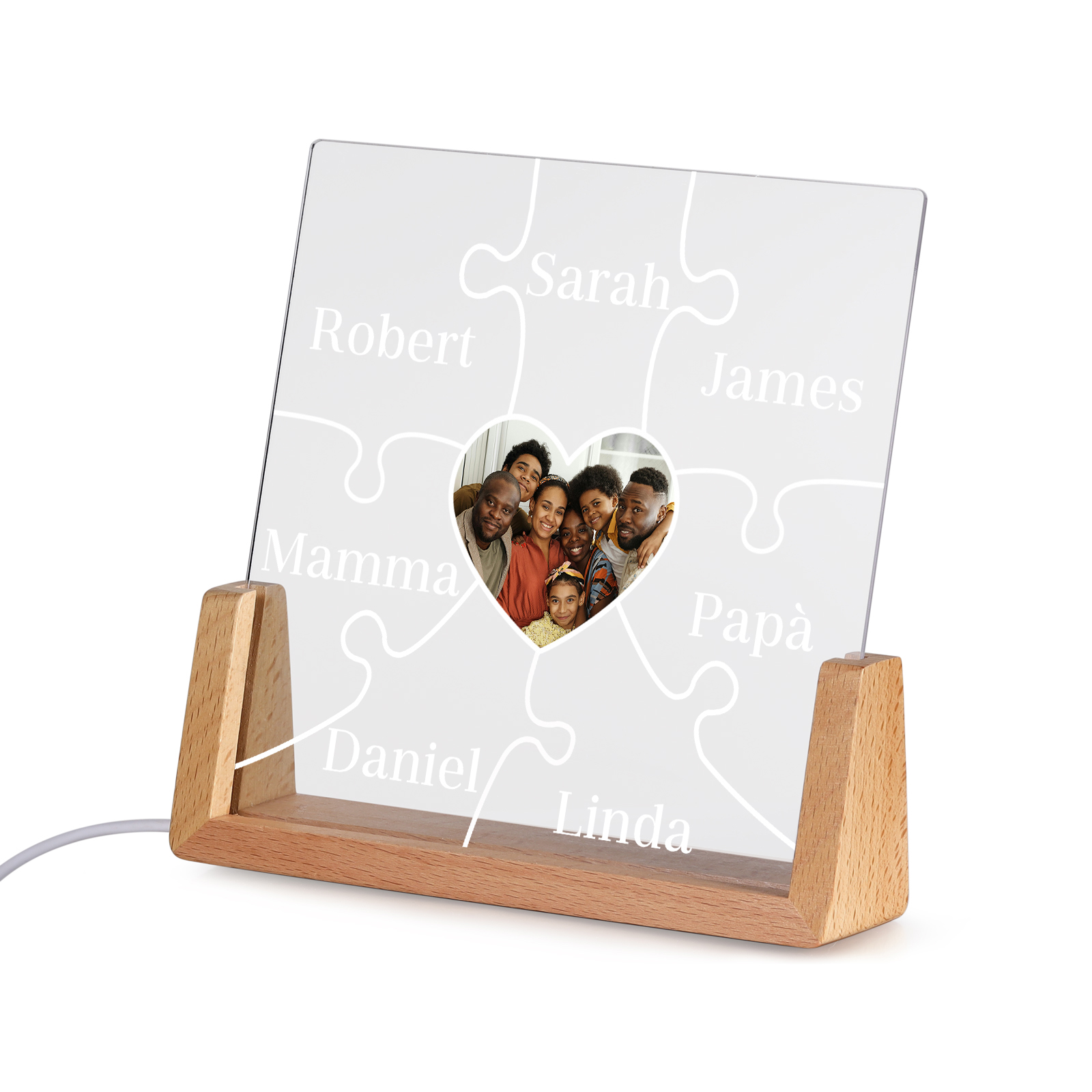 Lampada puzzle con 3 tipi di colori di LED luce 7 nomi e 1 foto personalizzati per mamma/nonna