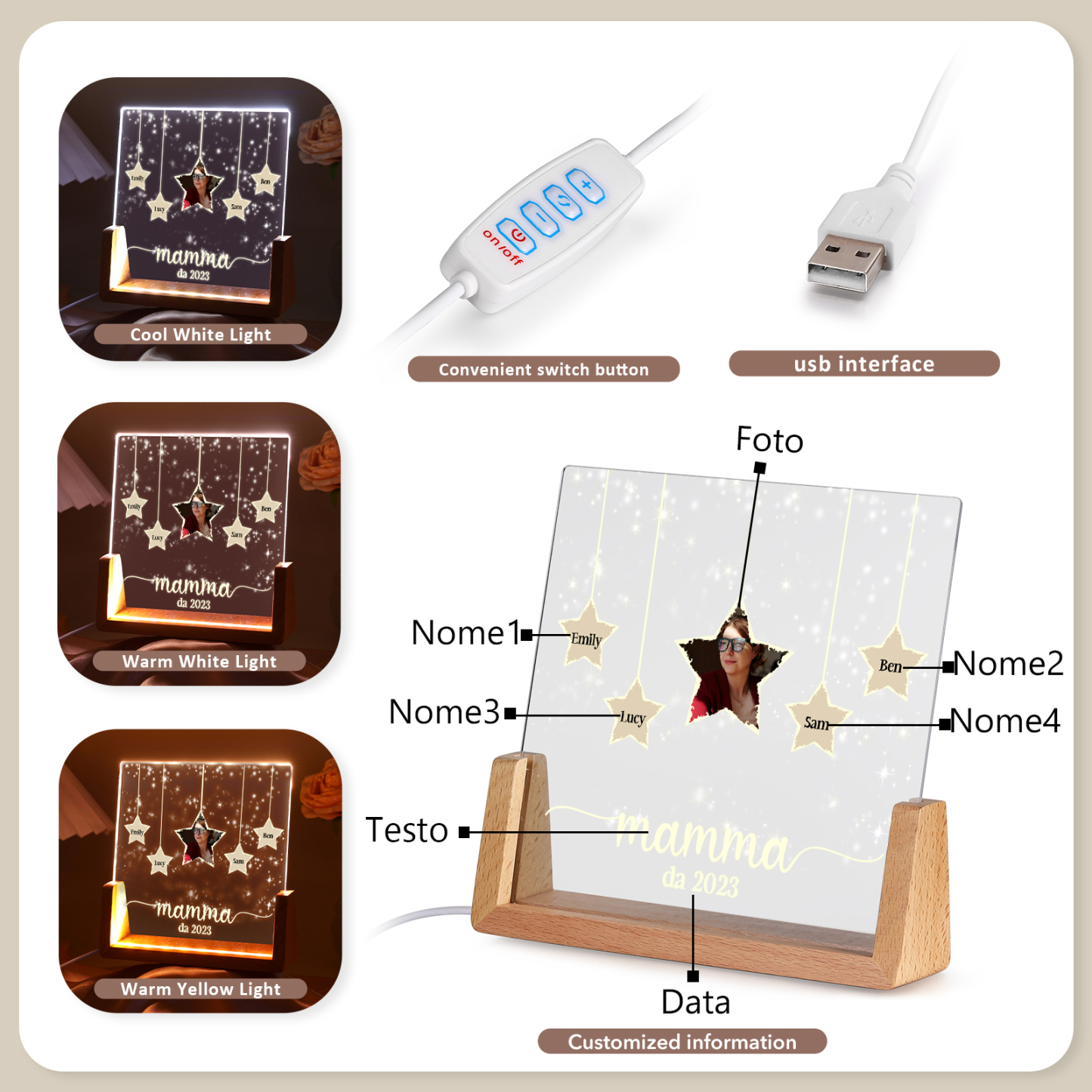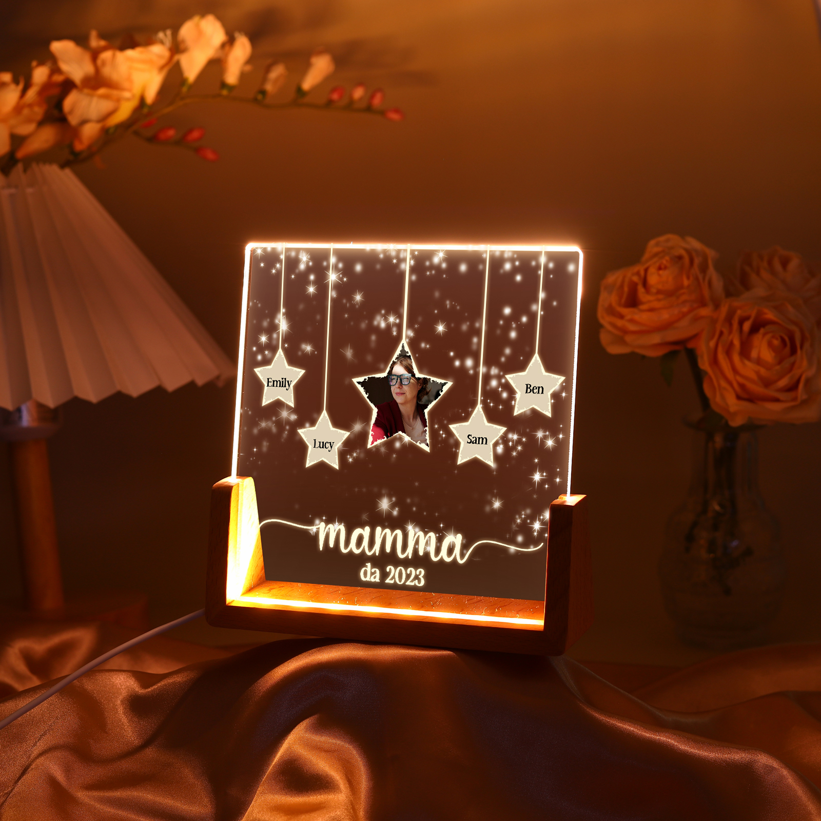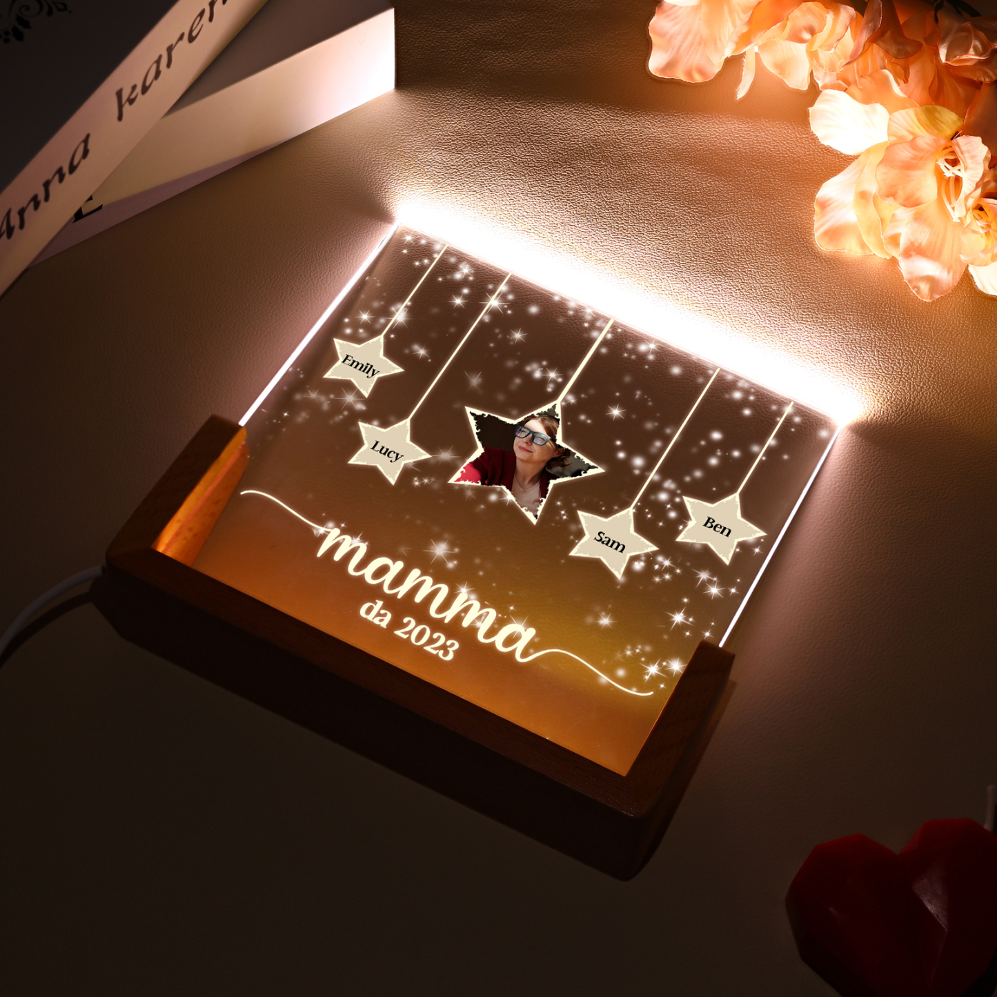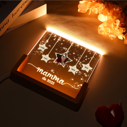 Lampada stella con 3 tipi di colori di LED luce 4 nomi e 1 foto e 1 testo e 1 data personalizzati per mamma/nonna