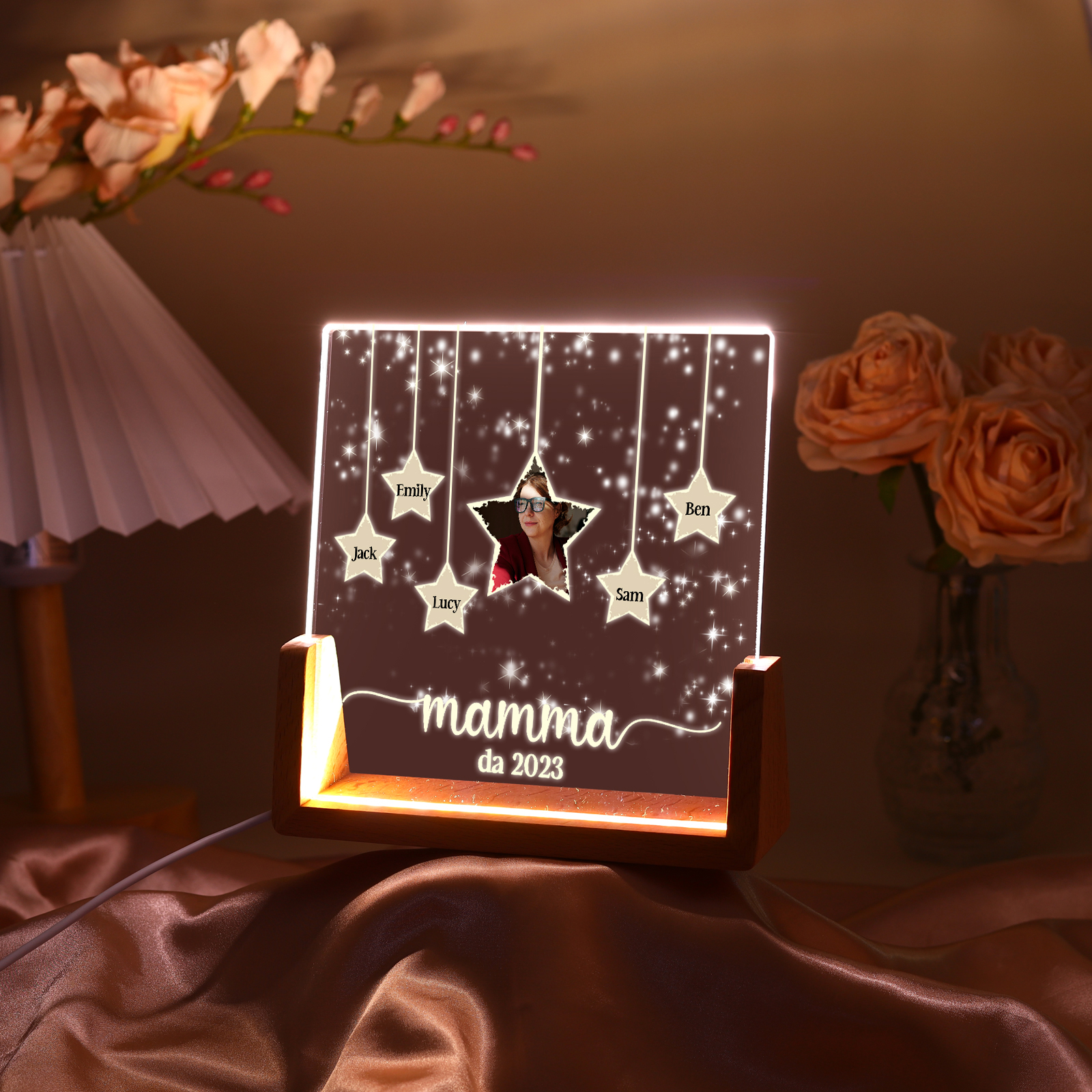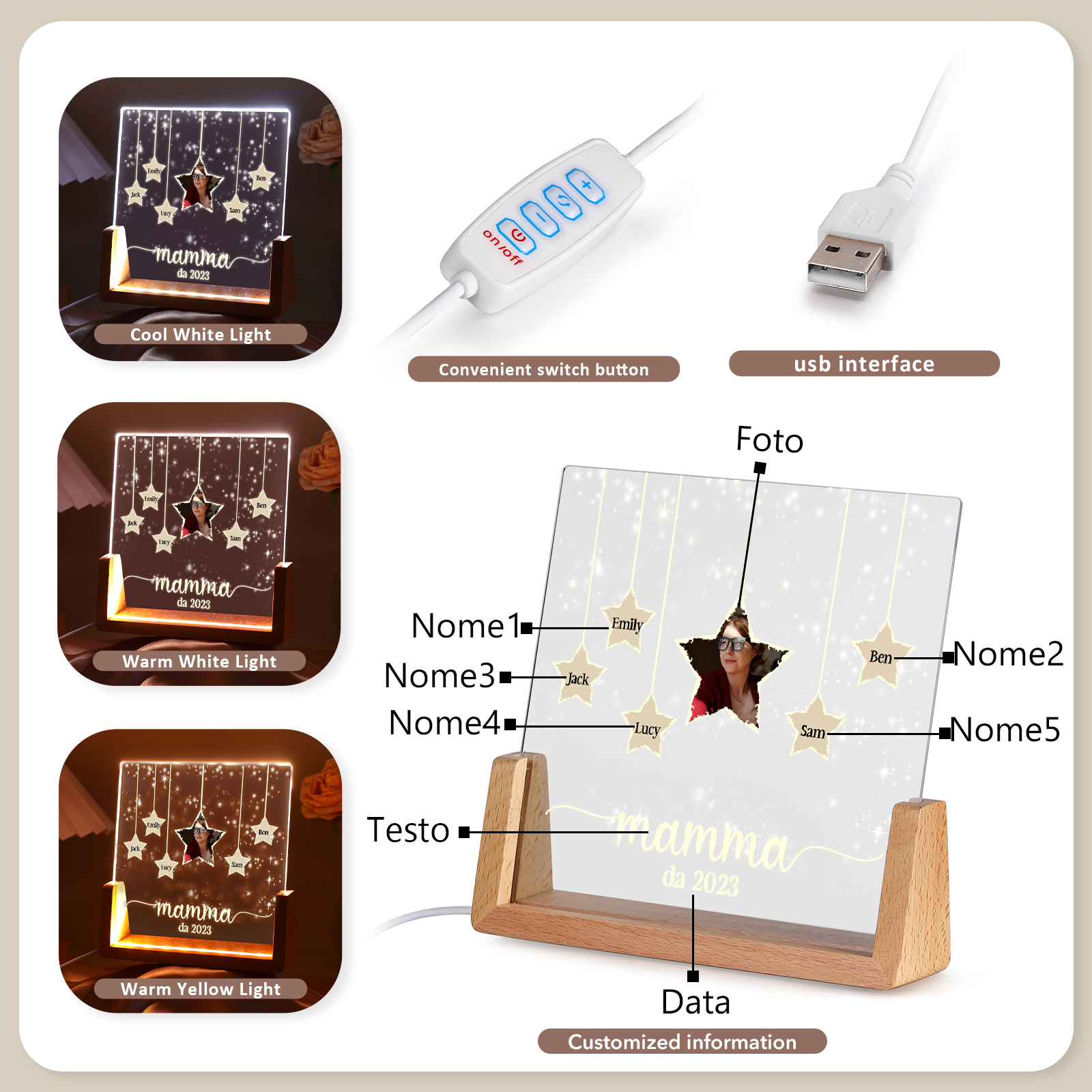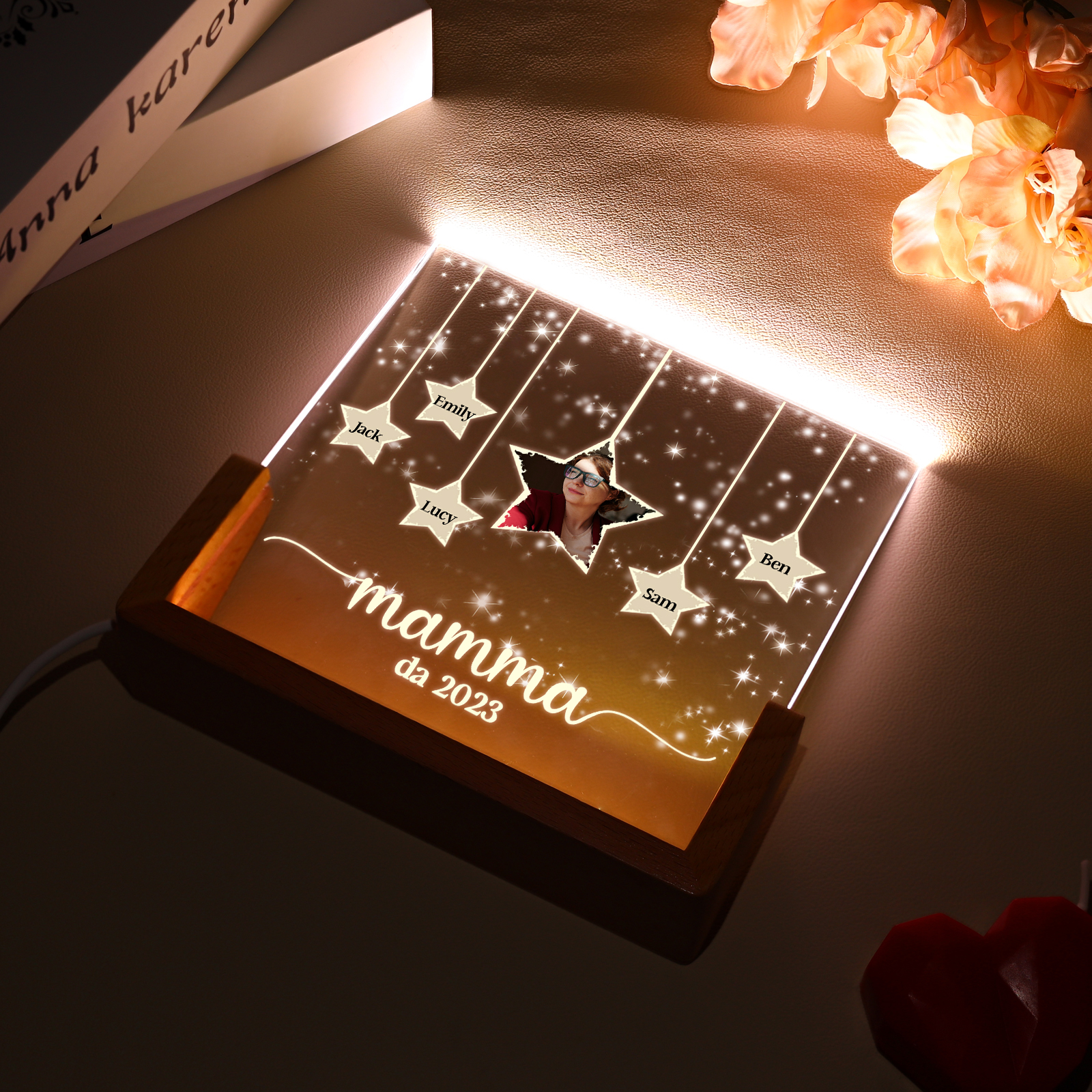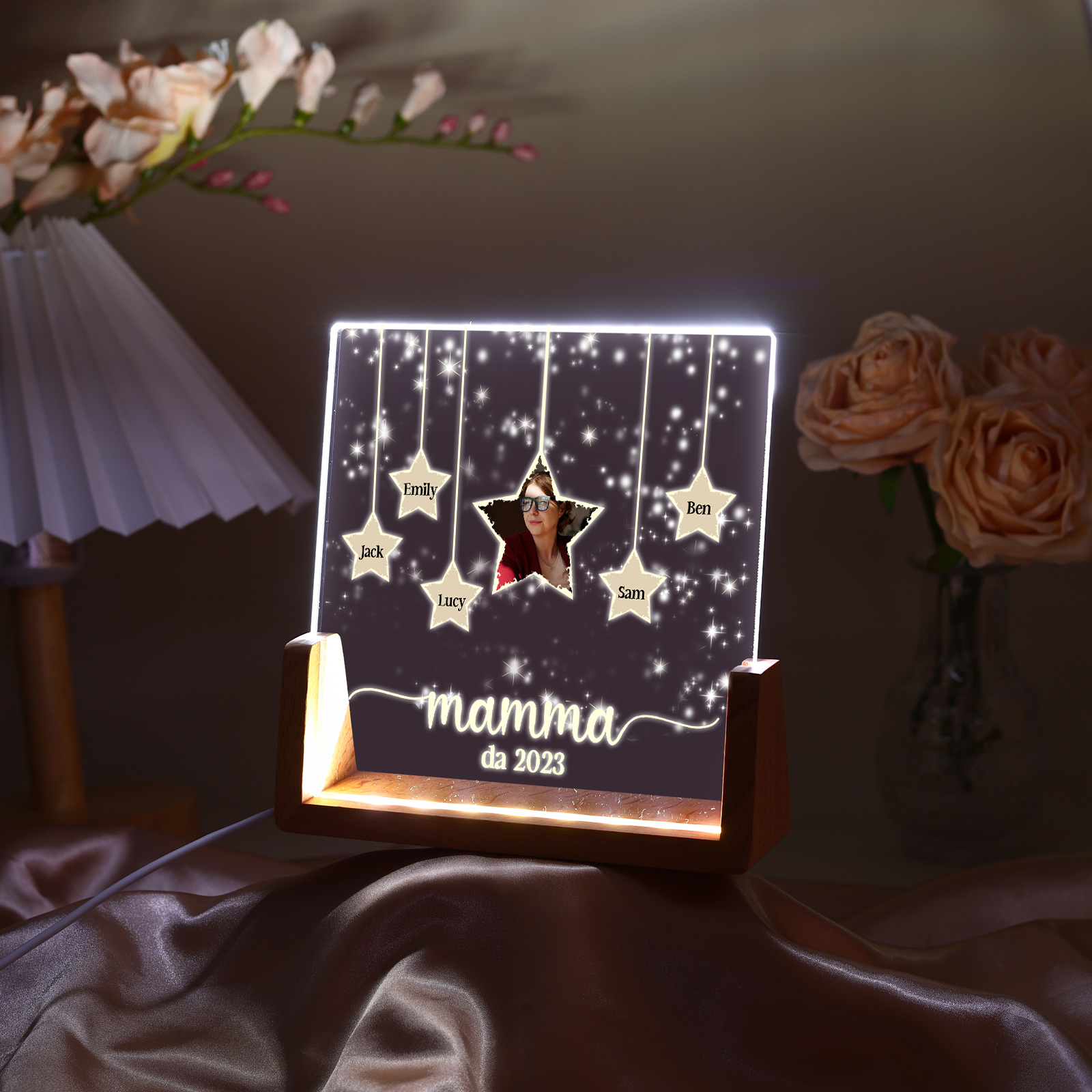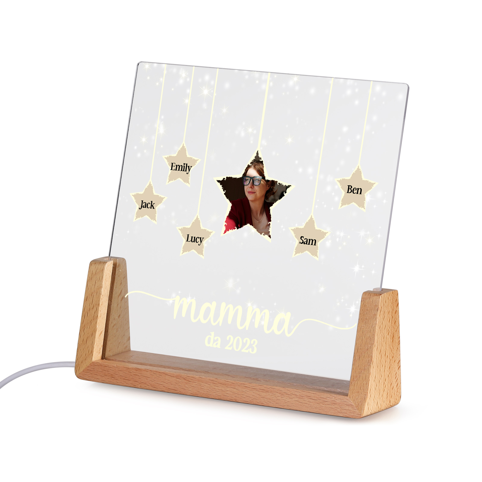 Lampada stella con 3 tipi di colori di LED luce 5 nomi e 1 foto e 1 testo e 1 data personalizzati per mamma/nonna
