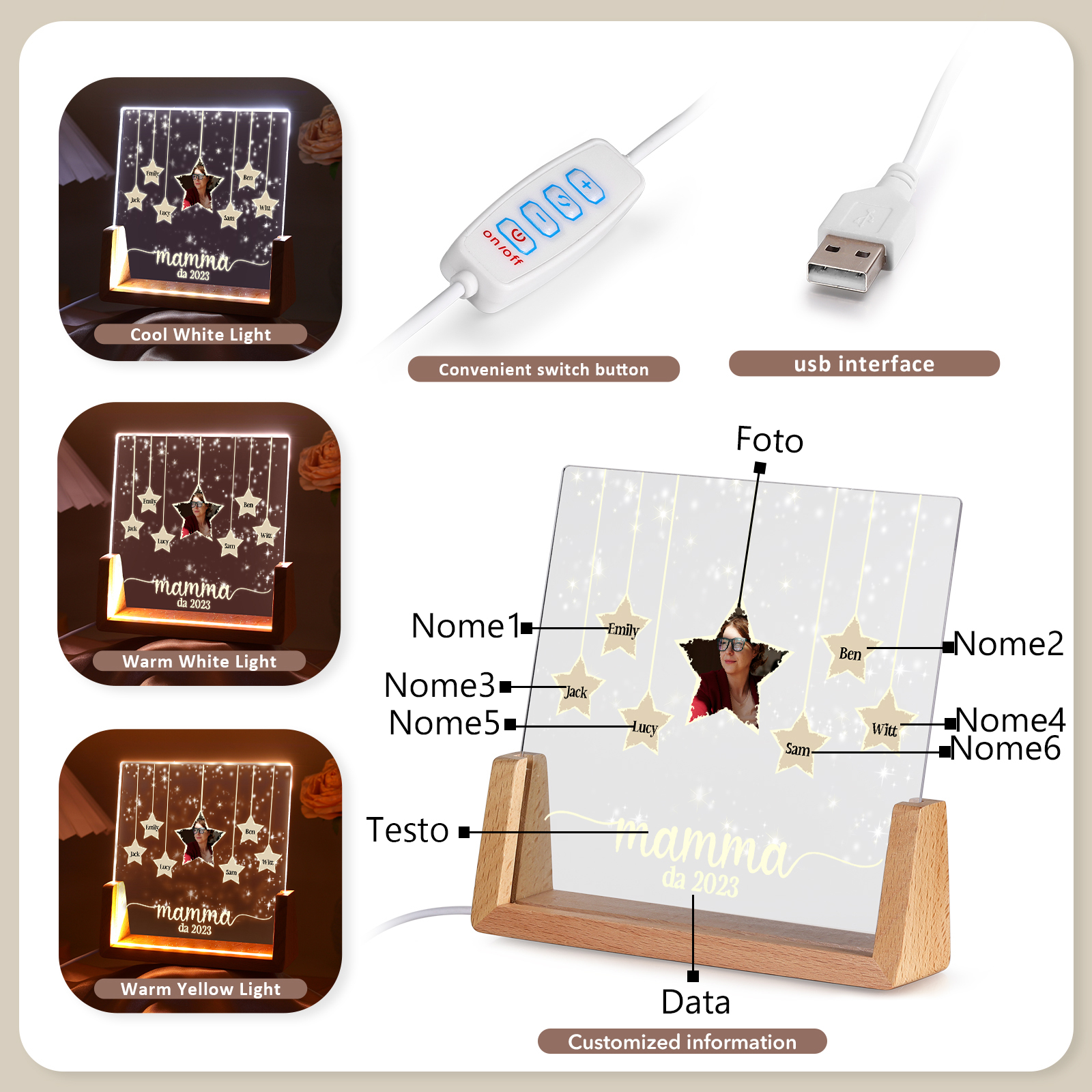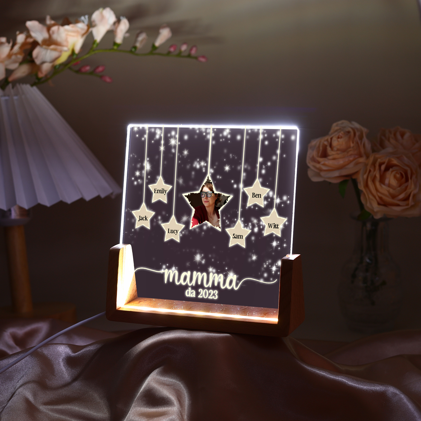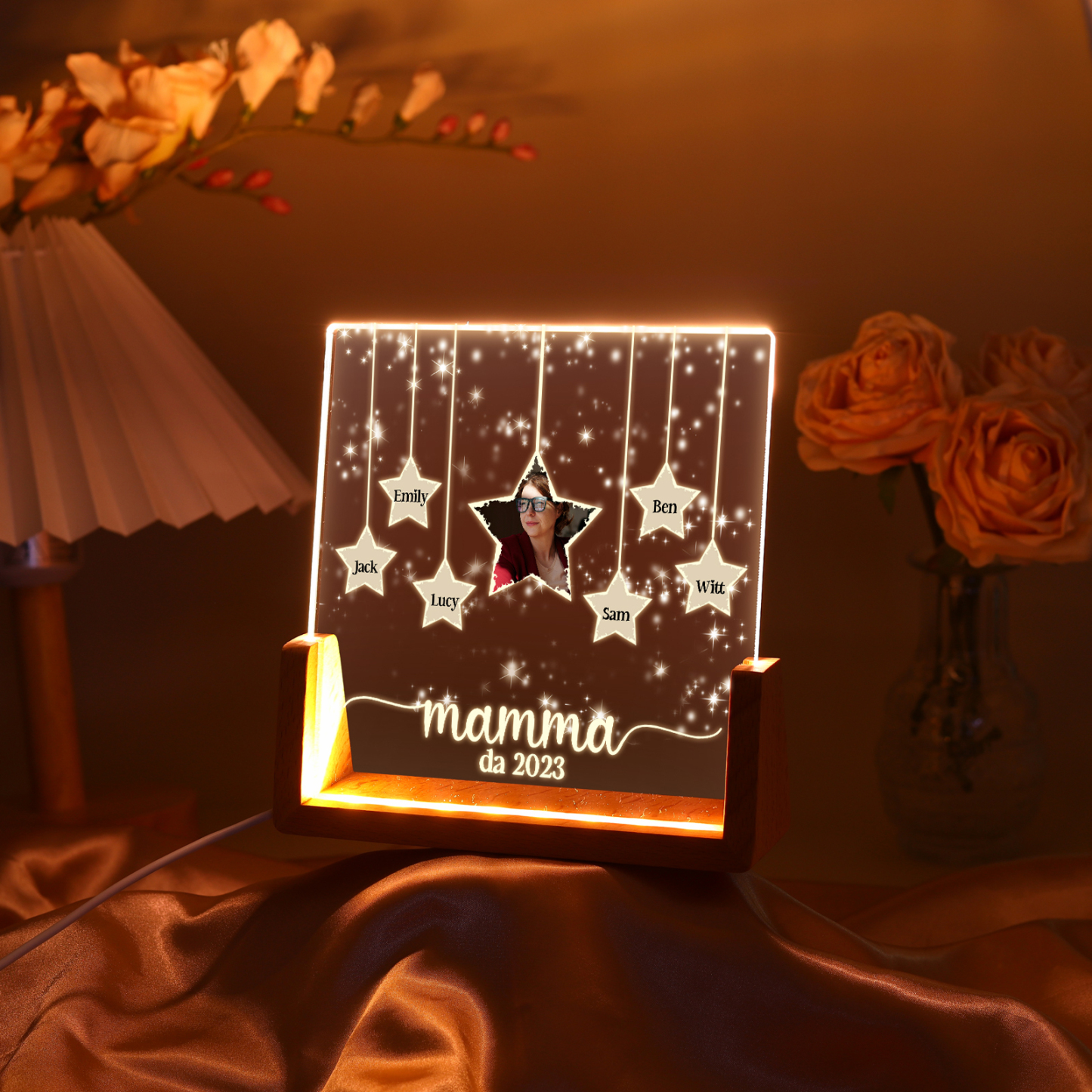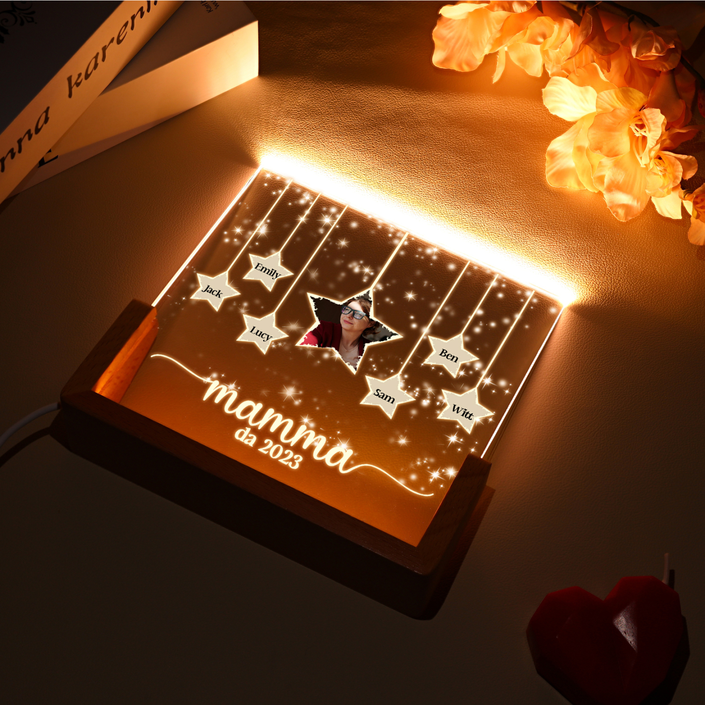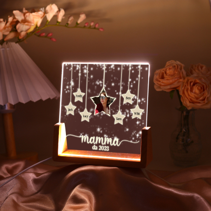 Lampada stella con 3 tipi di colori di LED luce 6 nomi e 1 foto e 1 testo e 1 data personalizzati per mamma/nonna