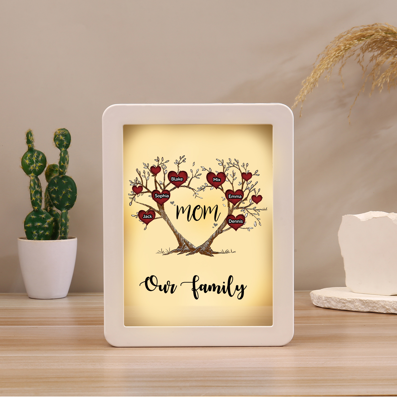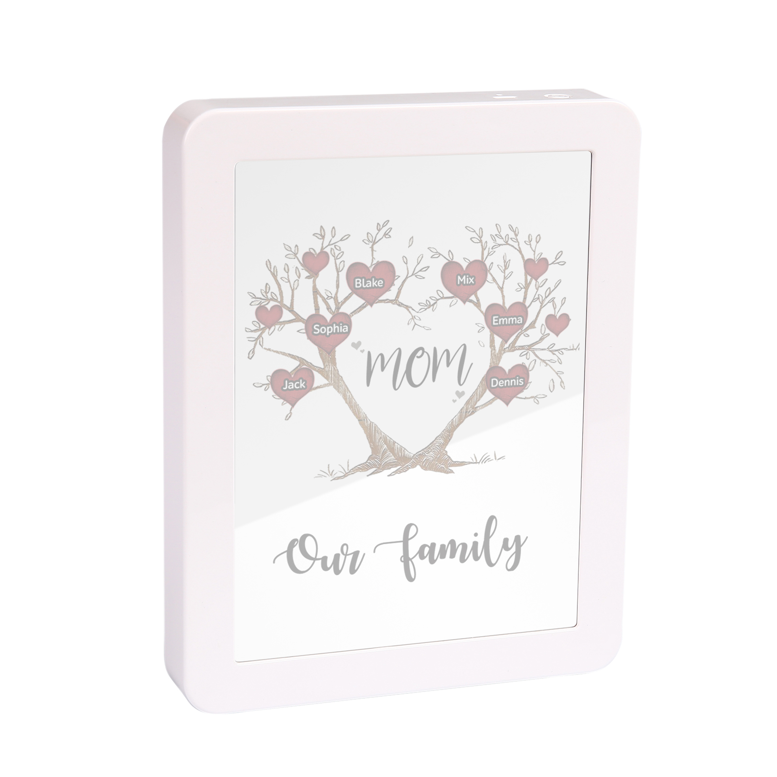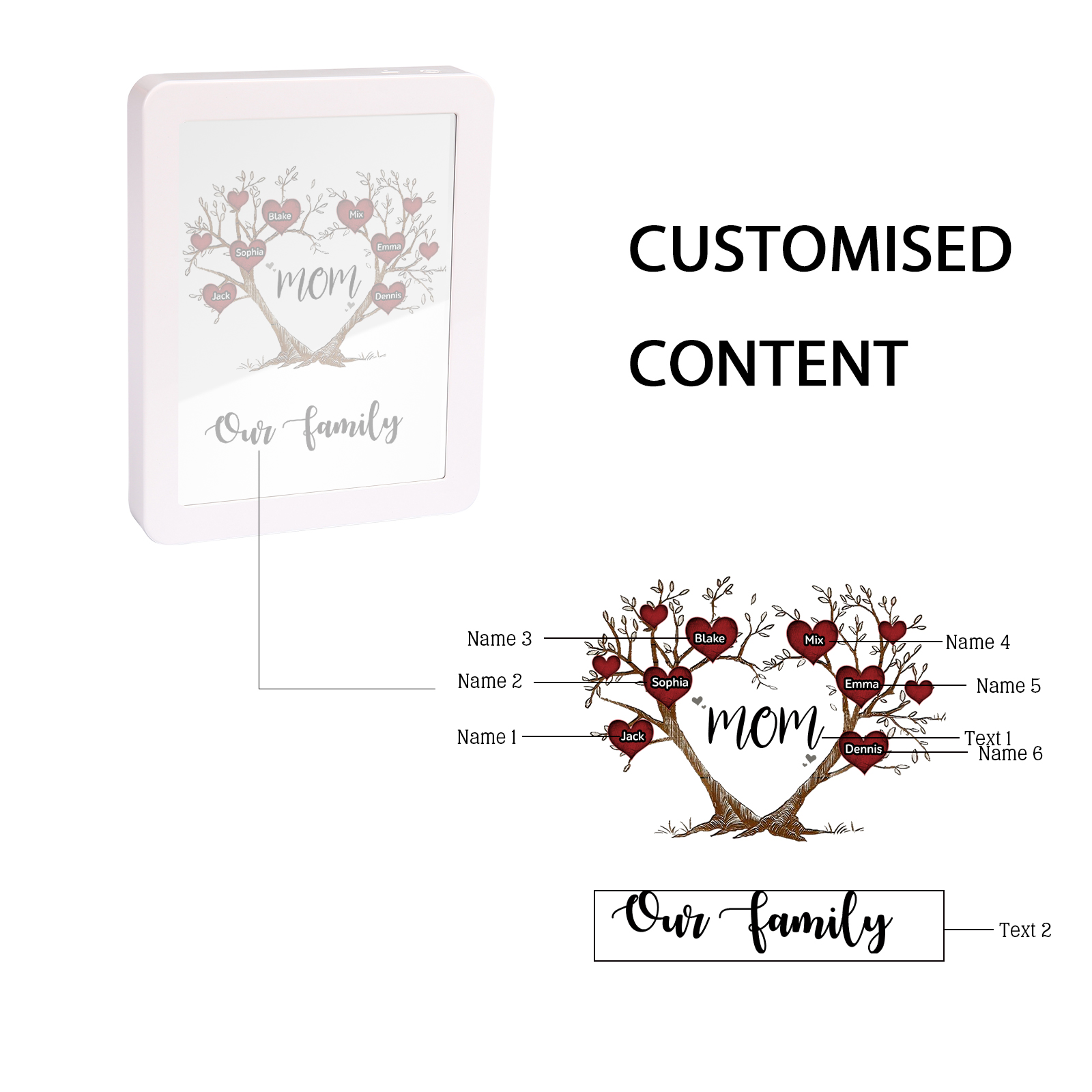 Mamma-Cornice albero di cuore con LED luce a tre colori 6 nomi e 2 testi personalizzati anche usato come specchio