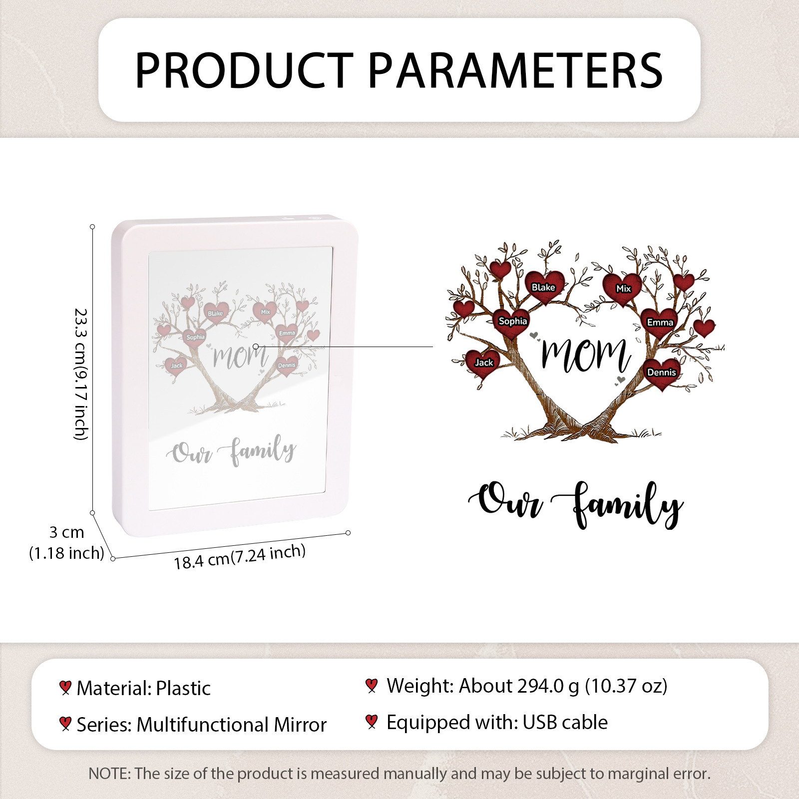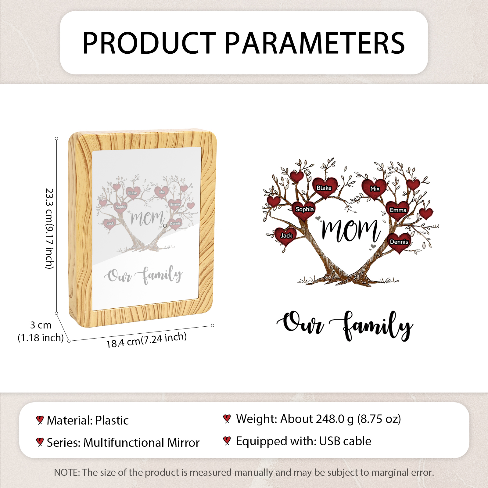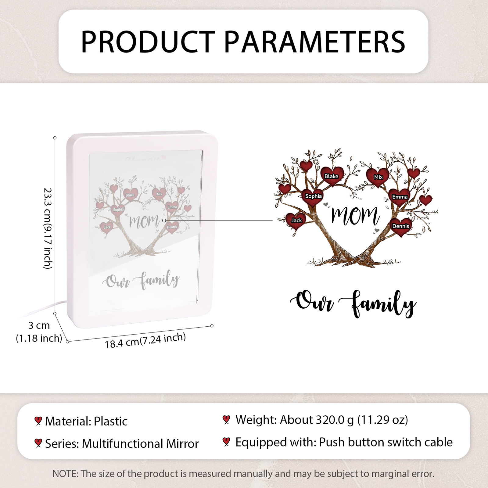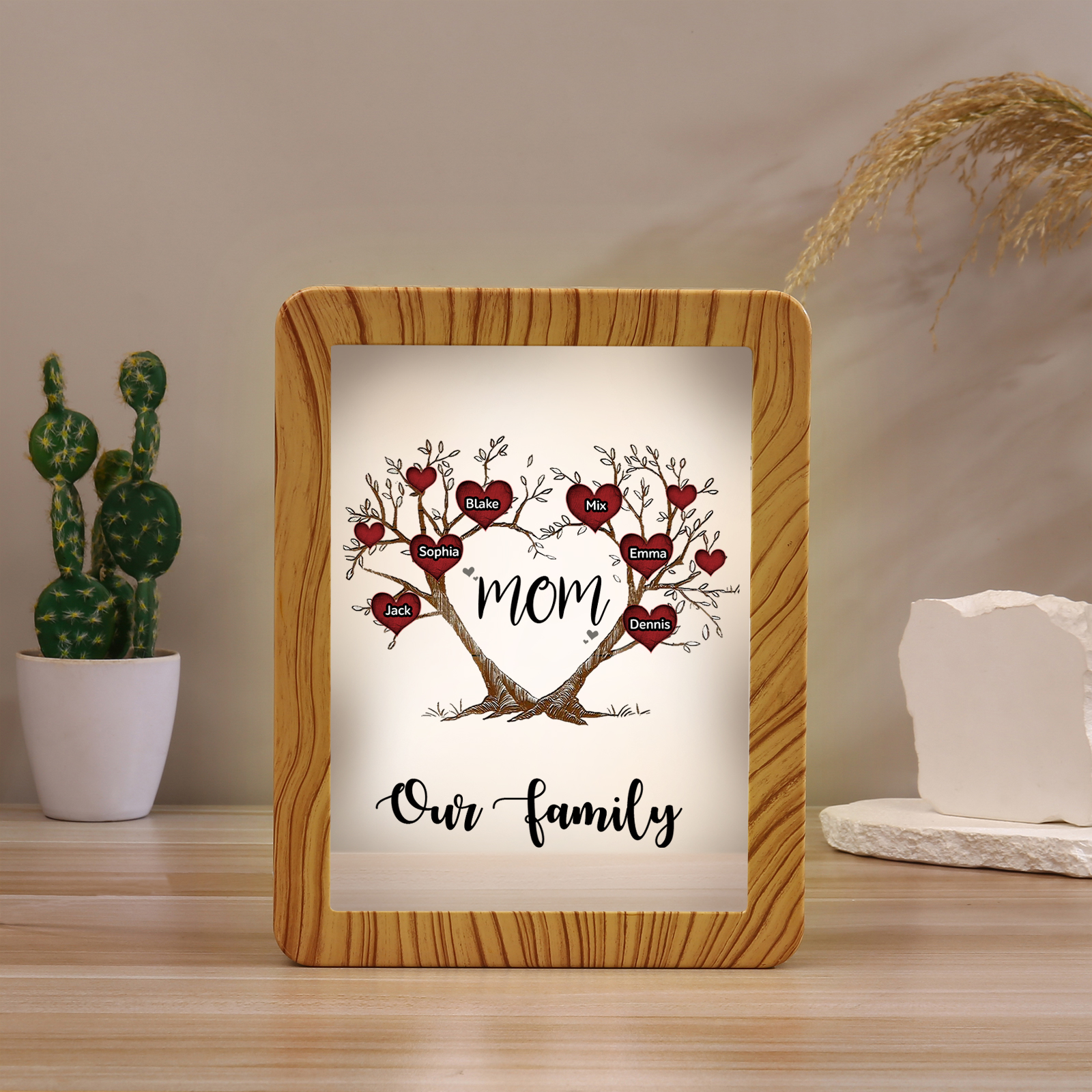 Mamma-Cornice albero di cuore con LED luce a tre colori 6 nomi e 2 testi personalizzati anche usato come specchio