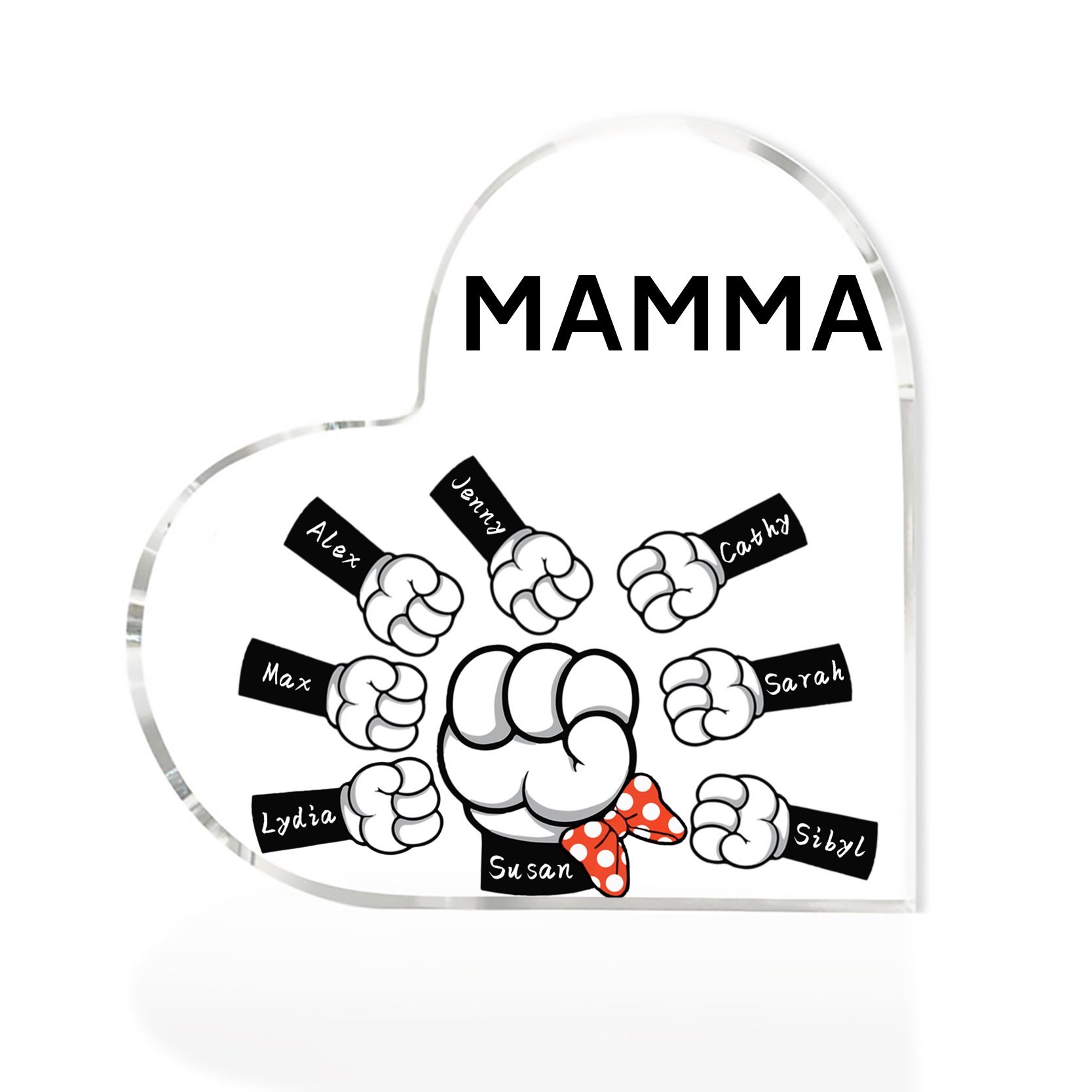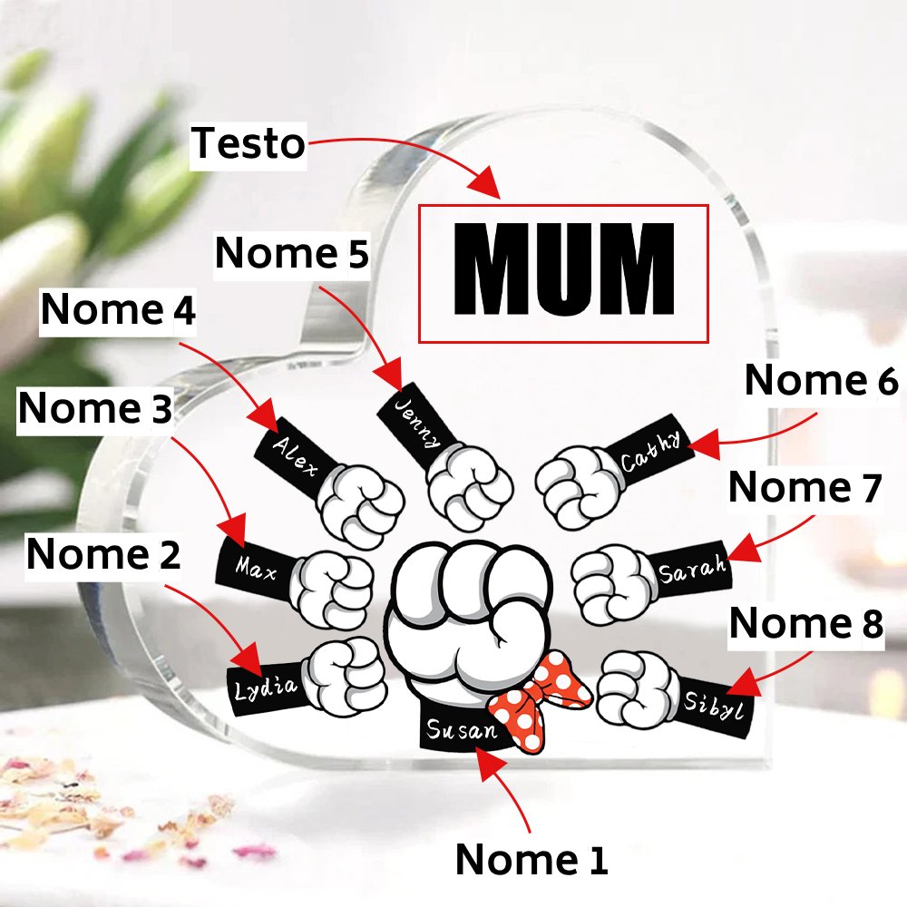 MAMMA Decorazione acrilica pugno a pugno a forma di cuore 8 nomi e 1 testo personalizzati per mamma/nonna