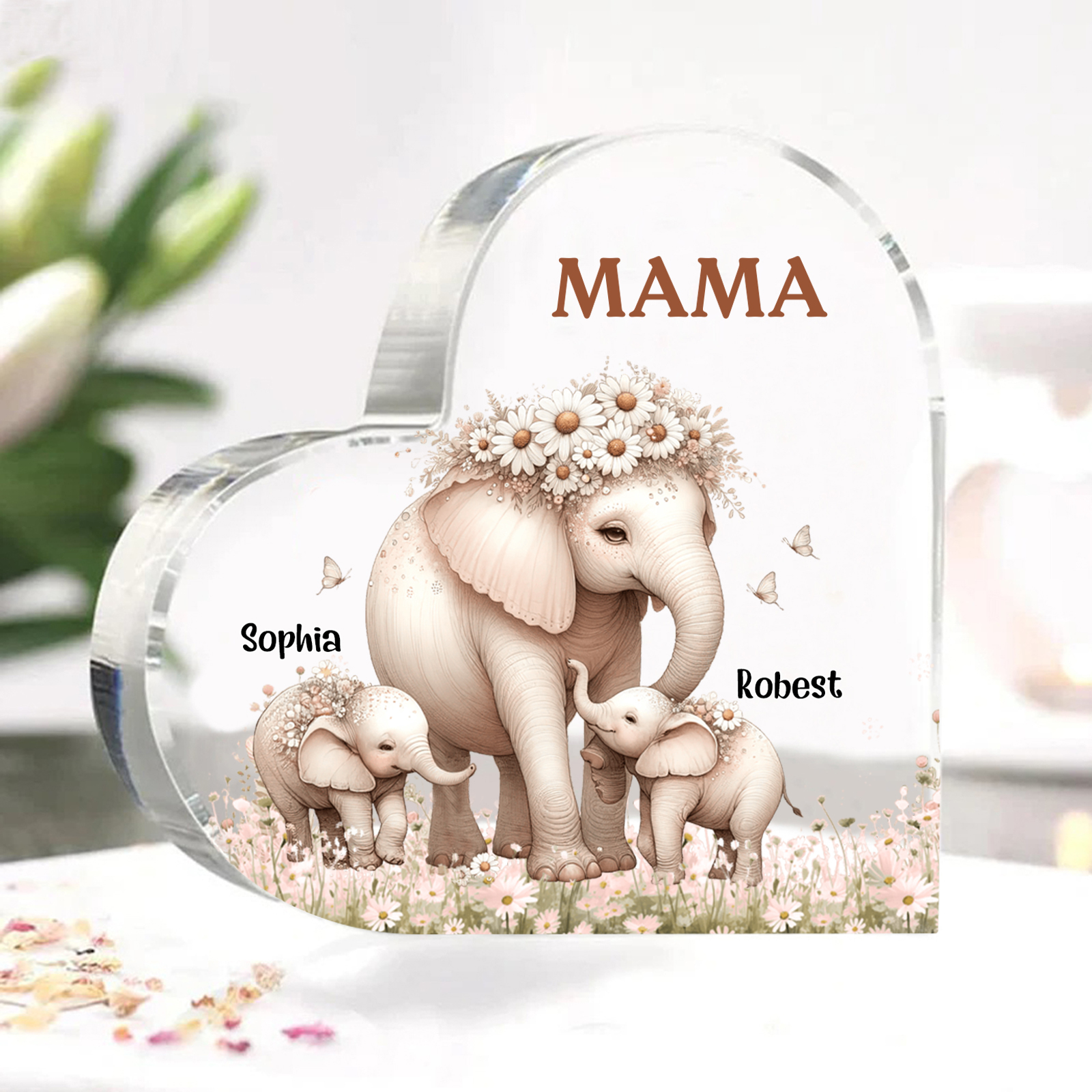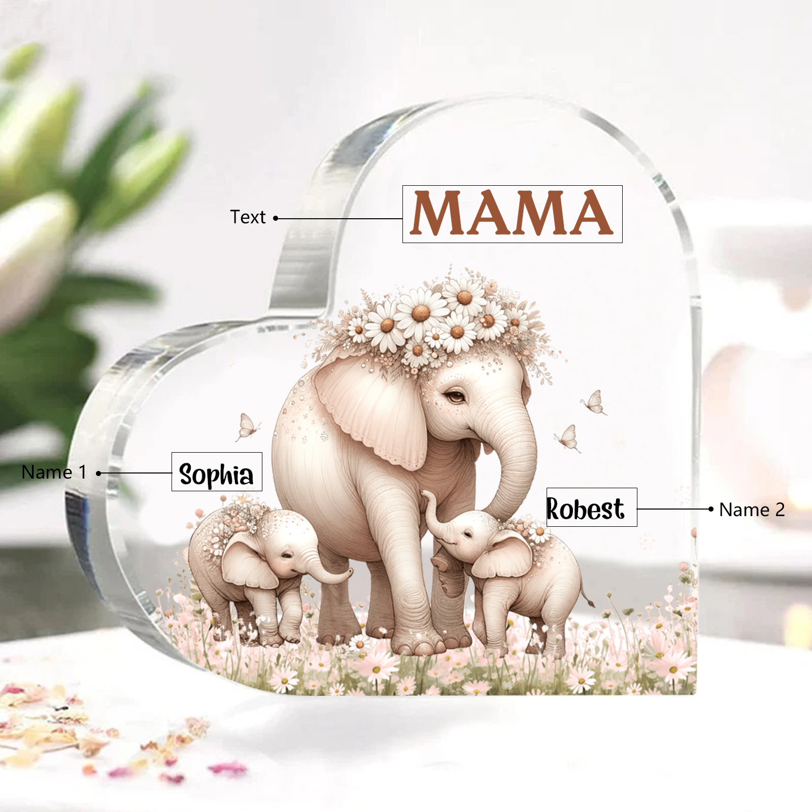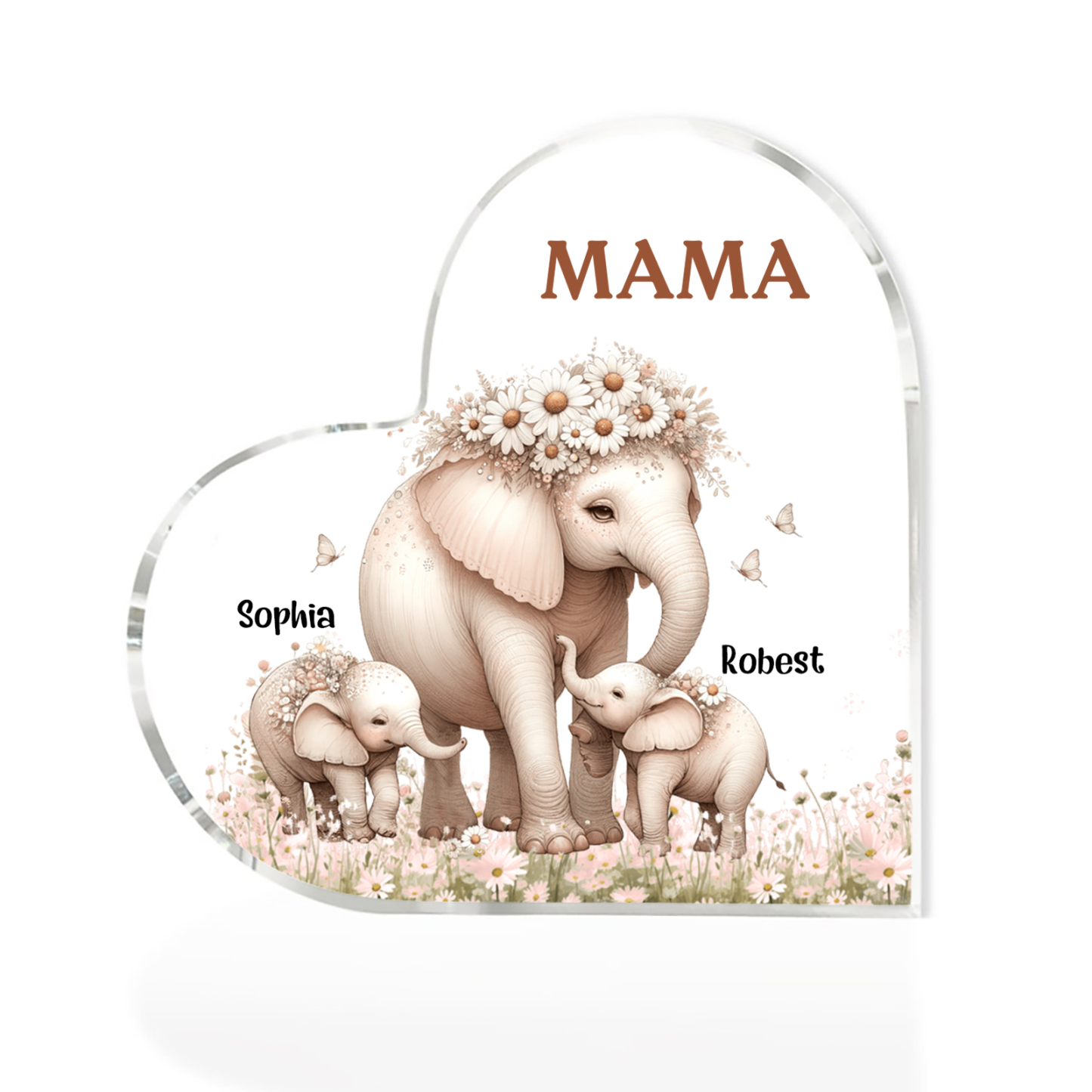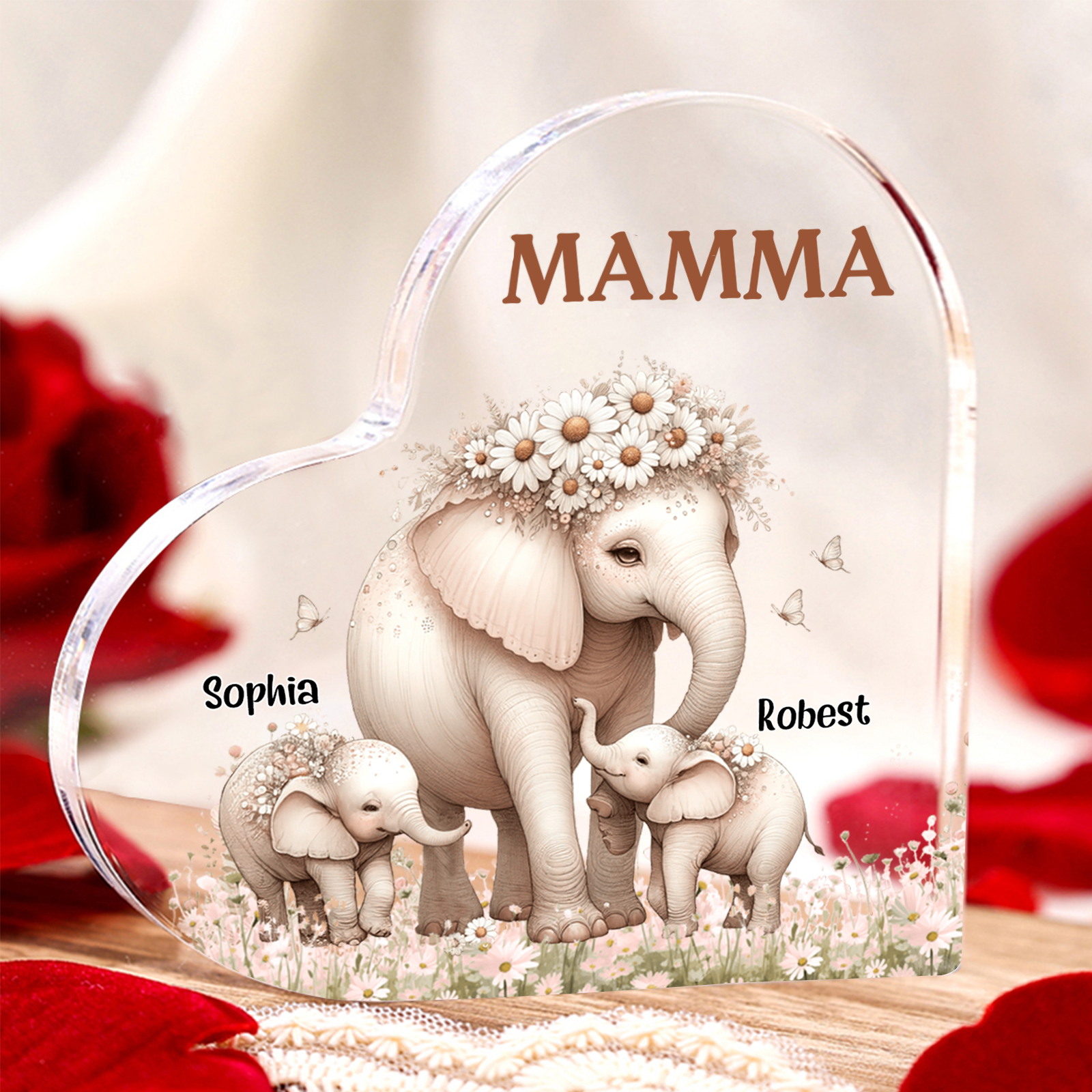 MAMMA/NONNA Decorazione acrilica elefante a forma di cuore 2 nomi e 1 testo personalizzati