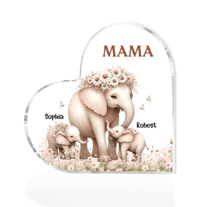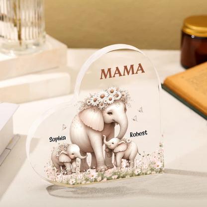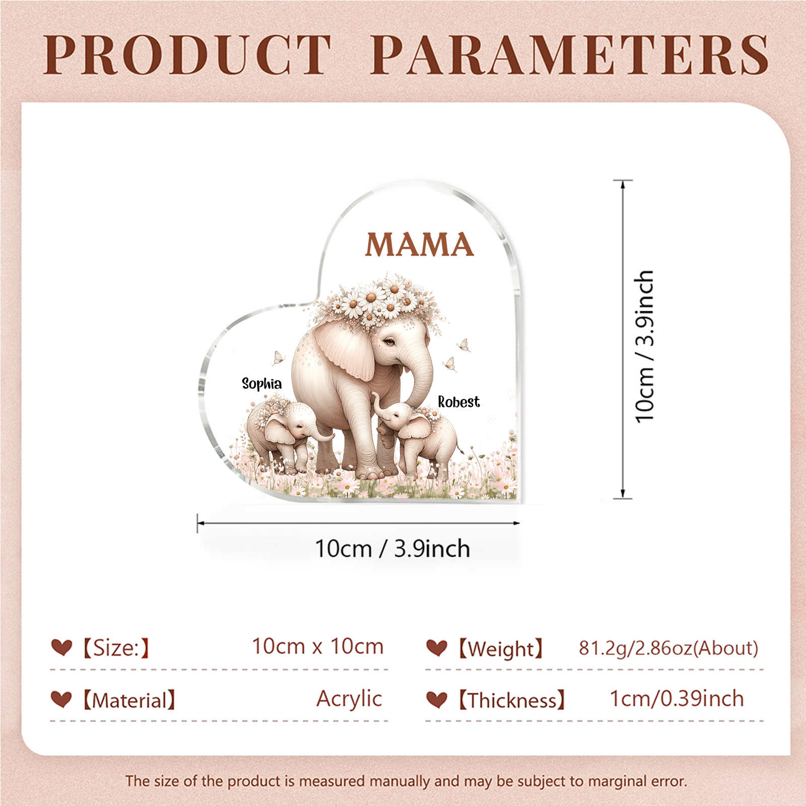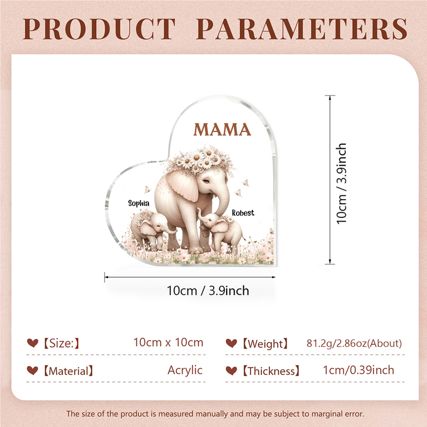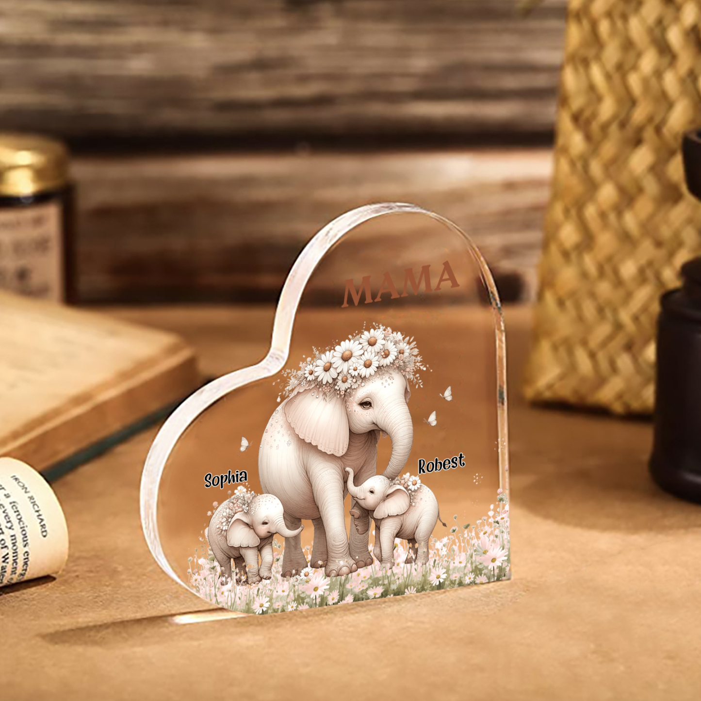 MAMMA/NONNA Decorazione acrilica elefante a forma di cuore 2 nomi e 1 testo personalizzati