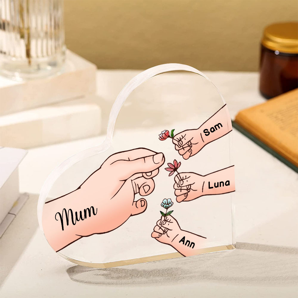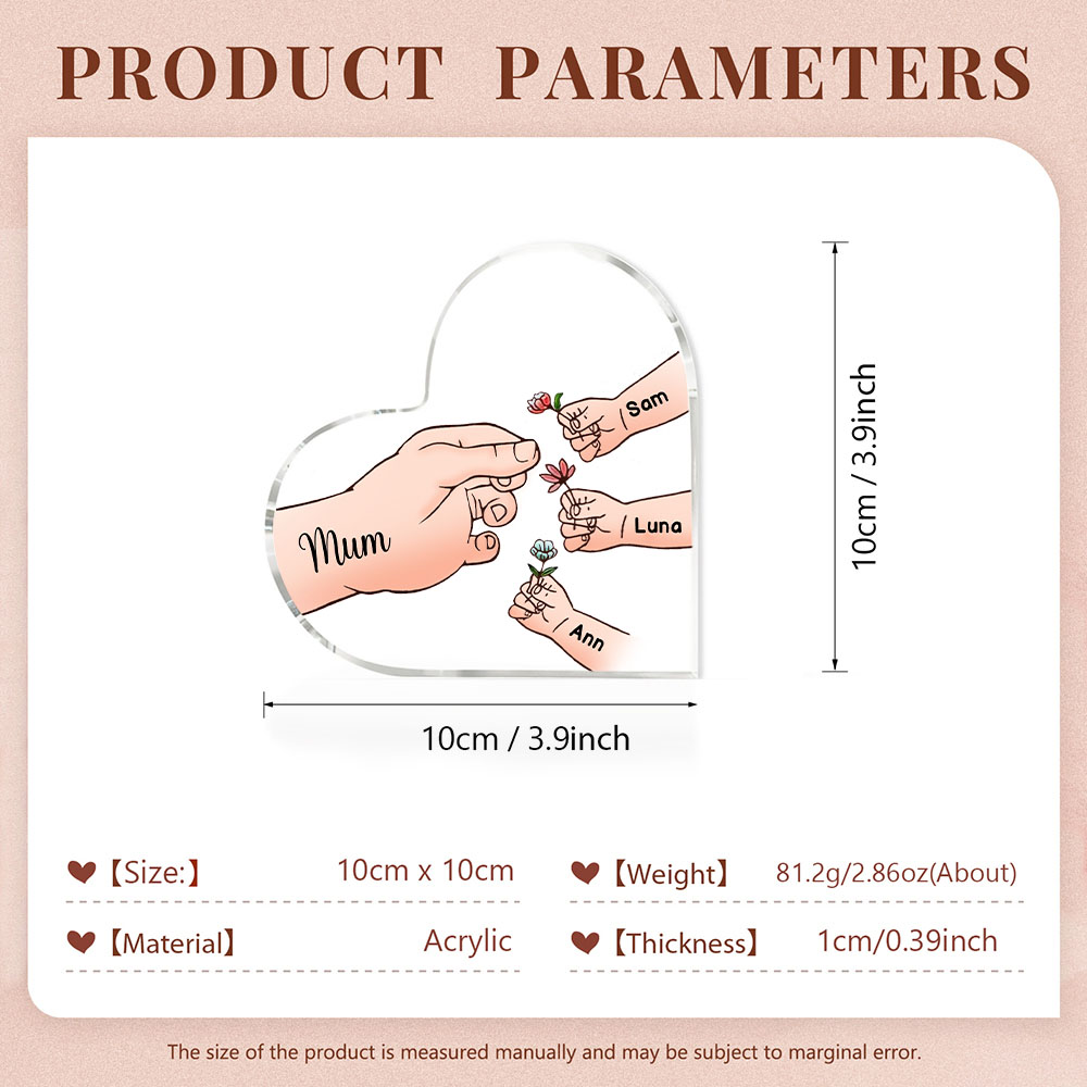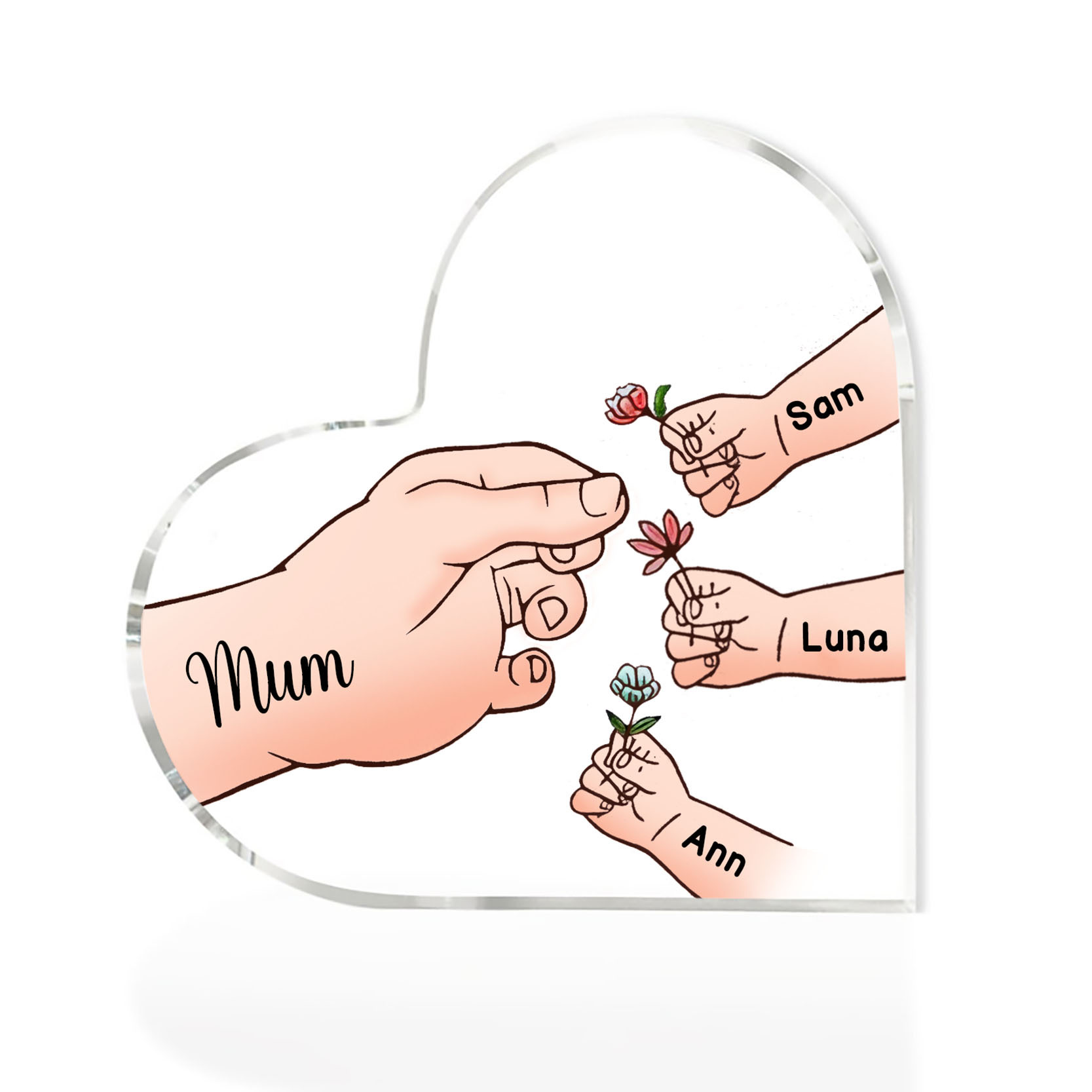 MAMMA/NONNA Decorazione acrilica fiore in mano a forma di cuore 4 nomi personalizzati per mamma/nonna