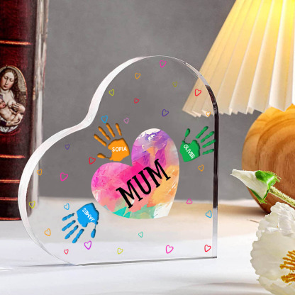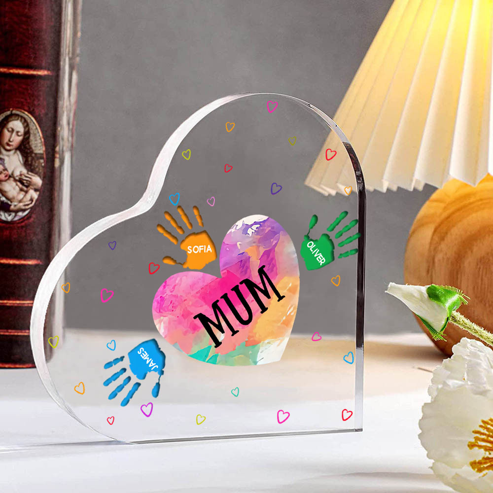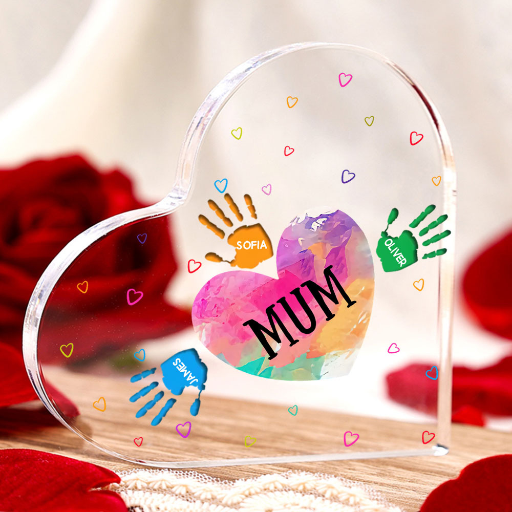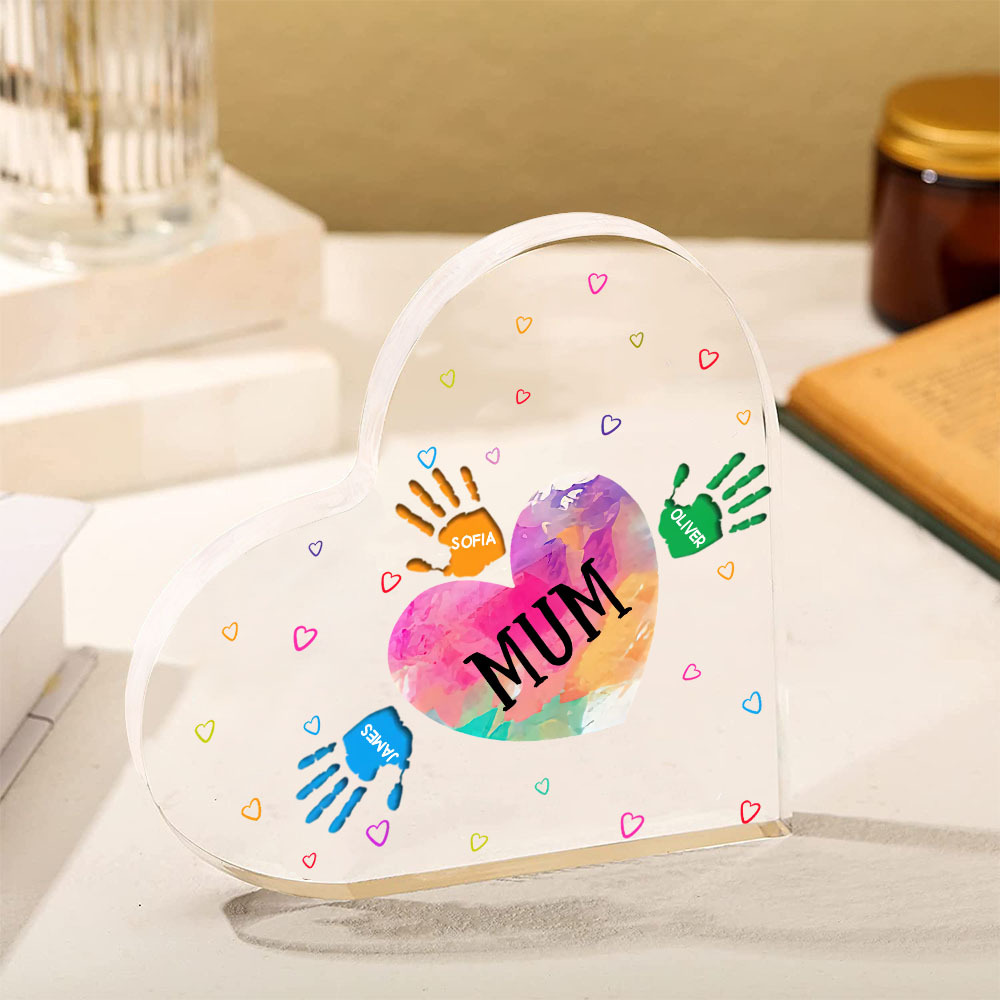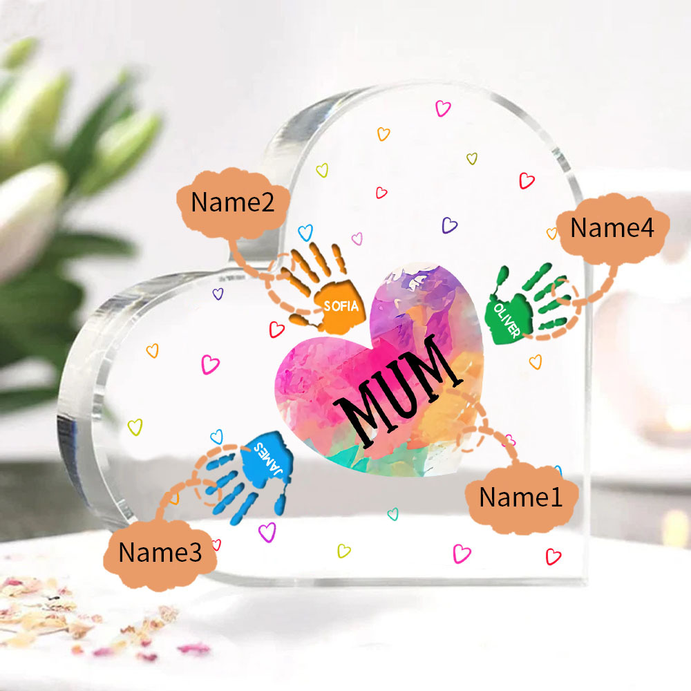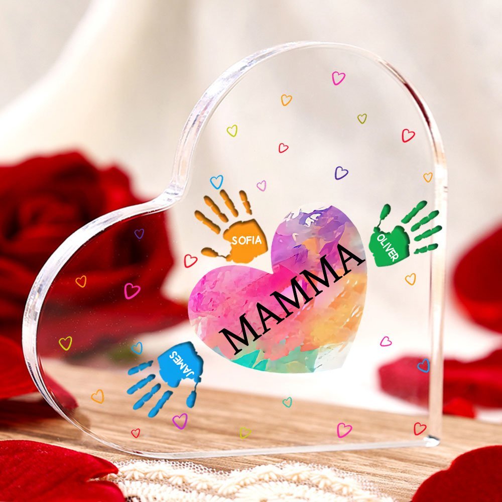 MAMMA/NONNA Decorazione acrilica impronta di mano a forma di cuore 4 nomi personalizzati per mamma/nonna