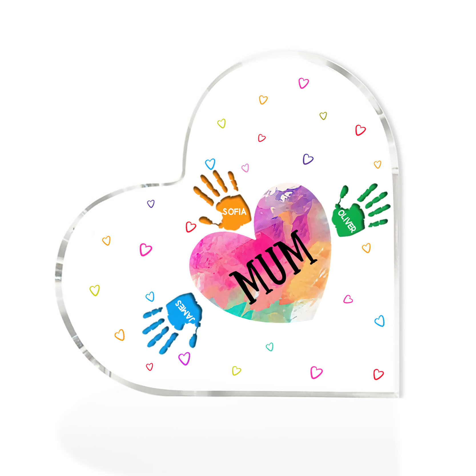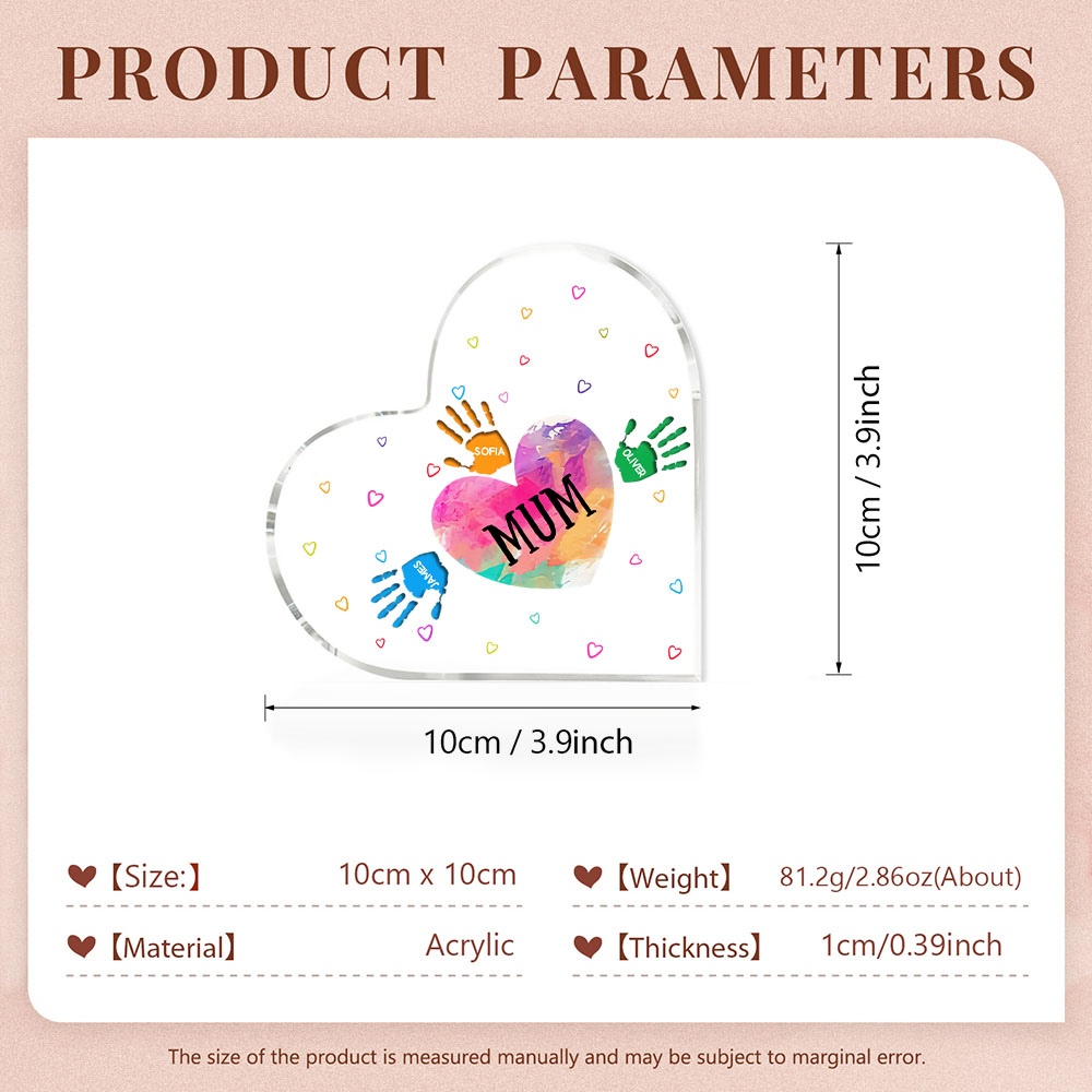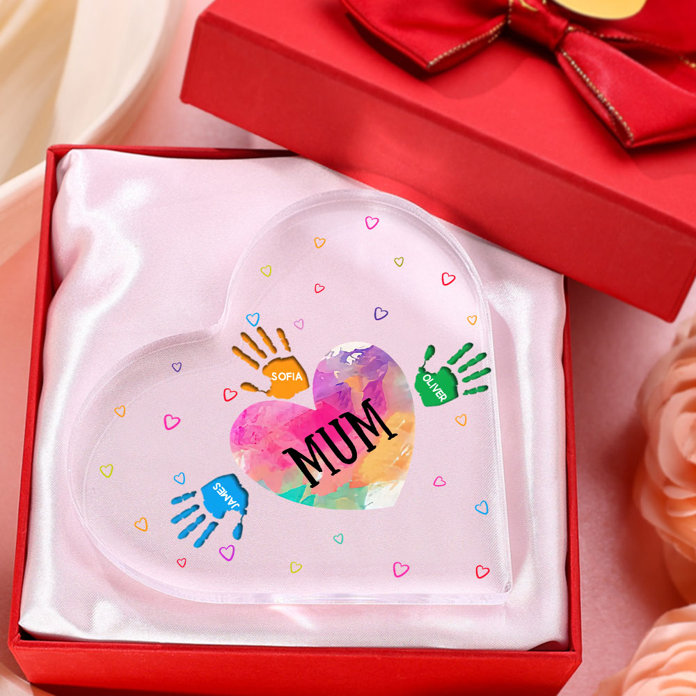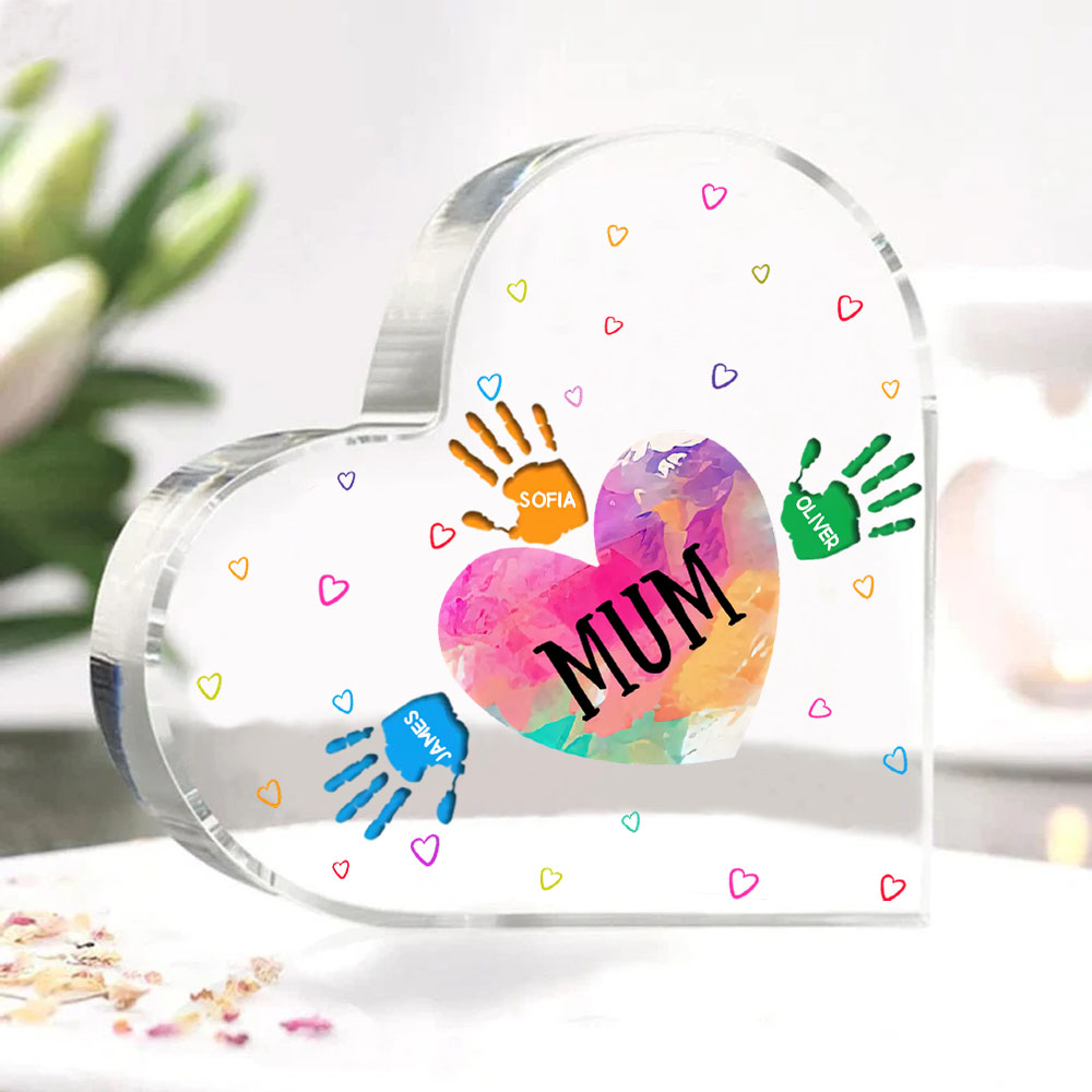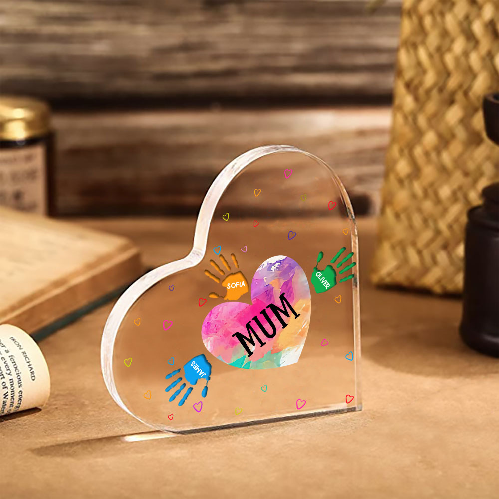 MAMMA/NONNA Decorazione acrilica impronta di mano a forma di cuore 4 nomi personalizzati per mamma/nonna