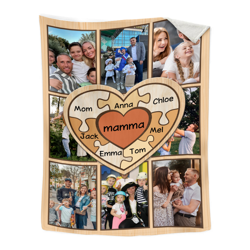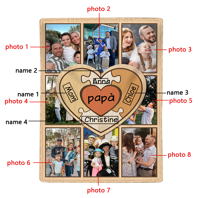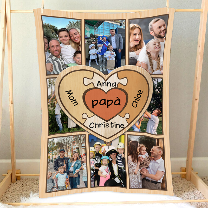 Mamma/Papà Coperta puzzle cuore regalo 4 nomi e 8 foto personalizzati per la famiglia