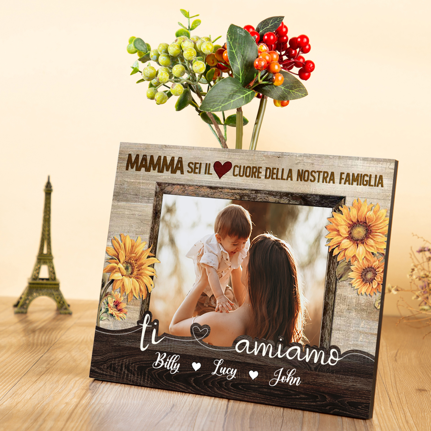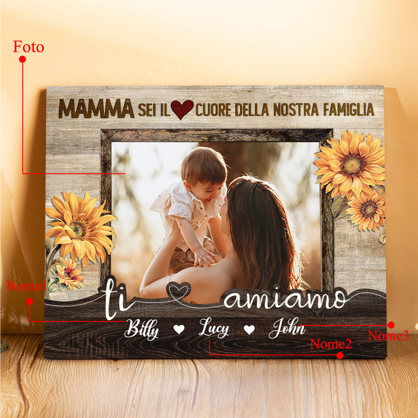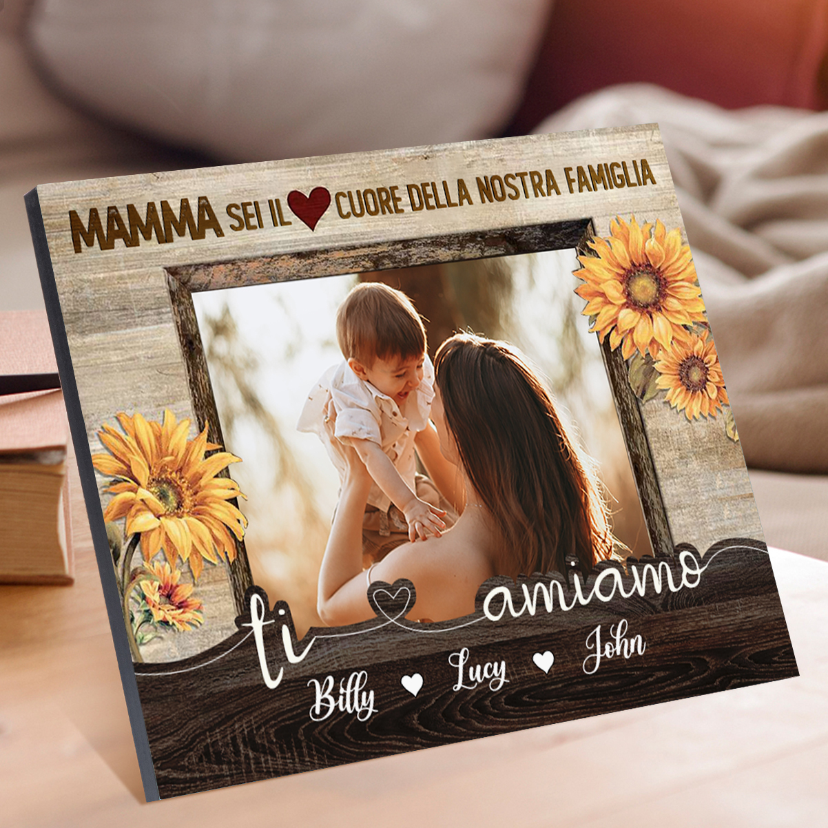 Mamma sei il cuore della nostra famiglia-Targa in legno con 3 nomi e 1 foto personalizzati regalo per mamma
