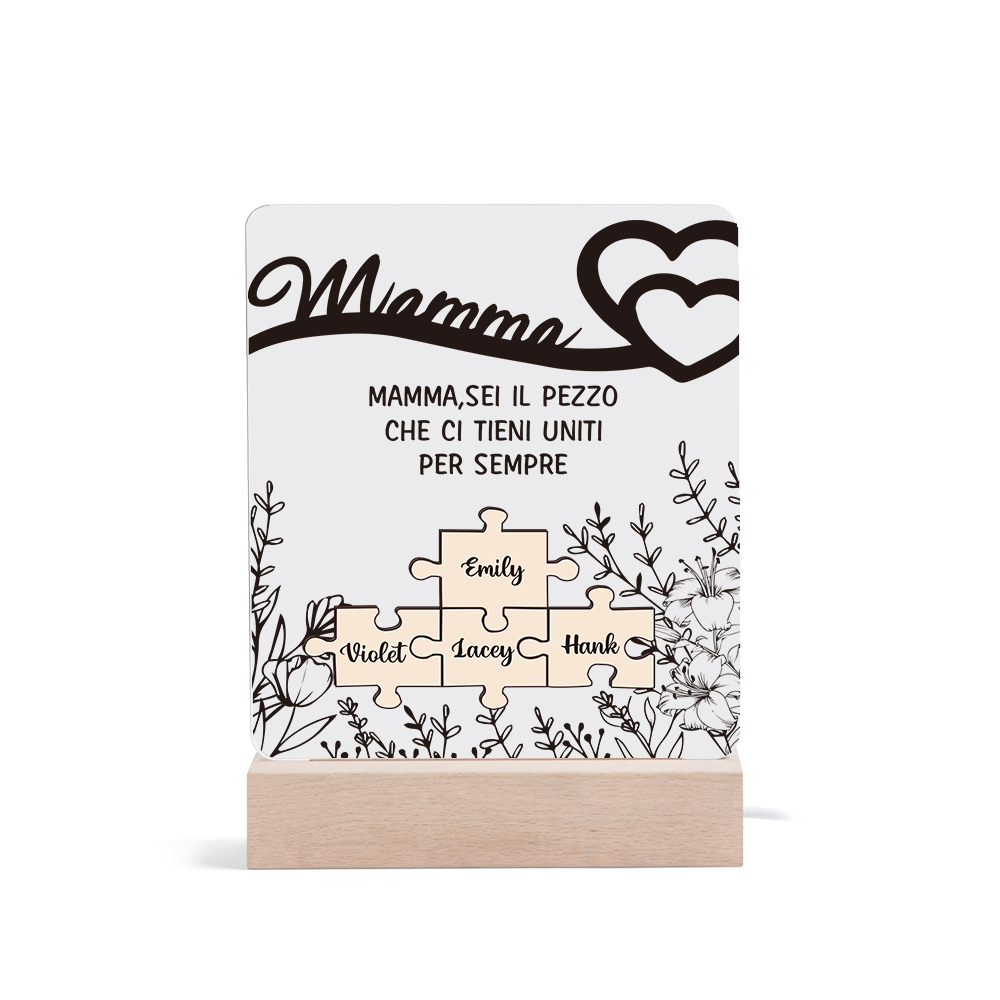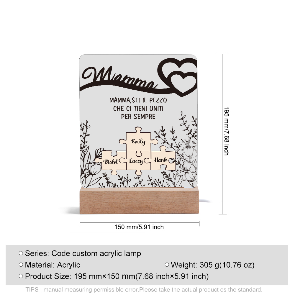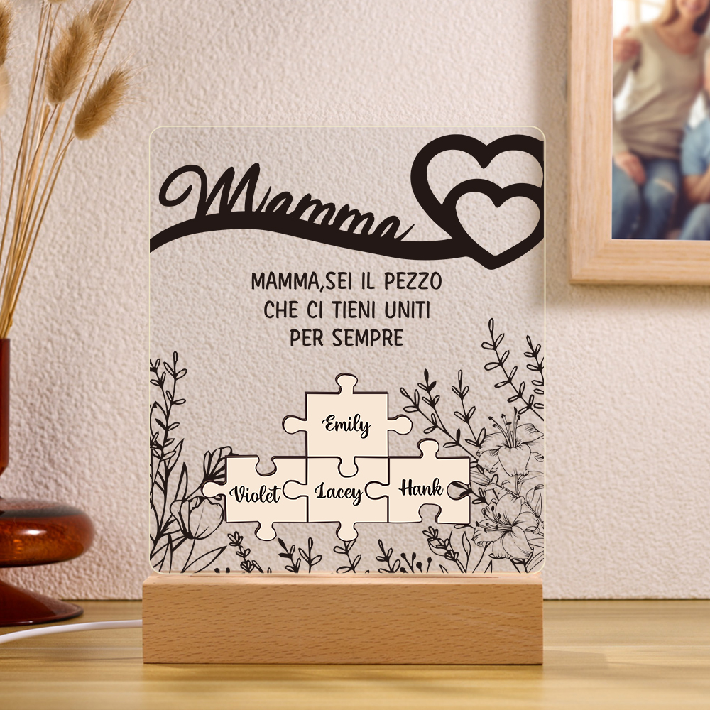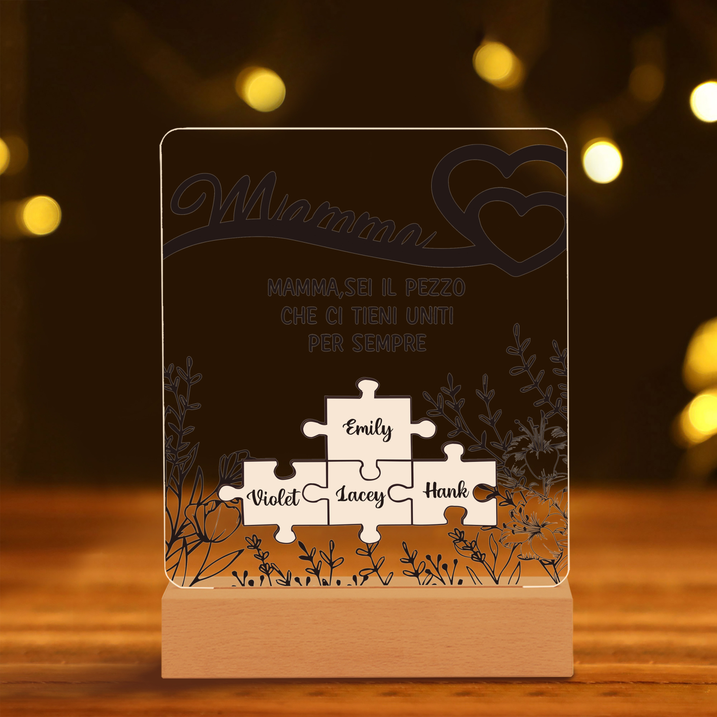 Mamma sei il pezzo che ci tieni uniti-Lampada acrilica con puzzle 4 nomi personalizzabili per mamma