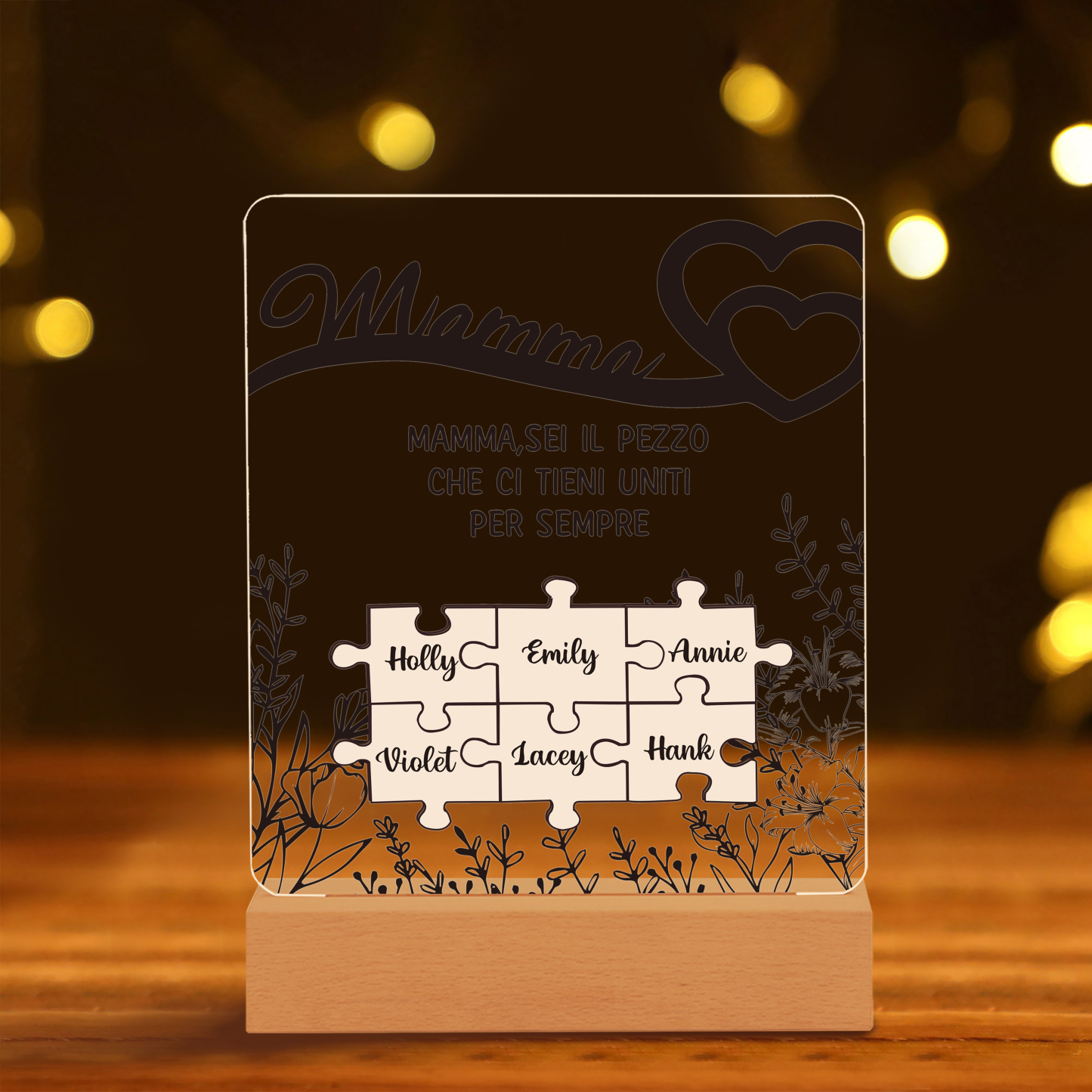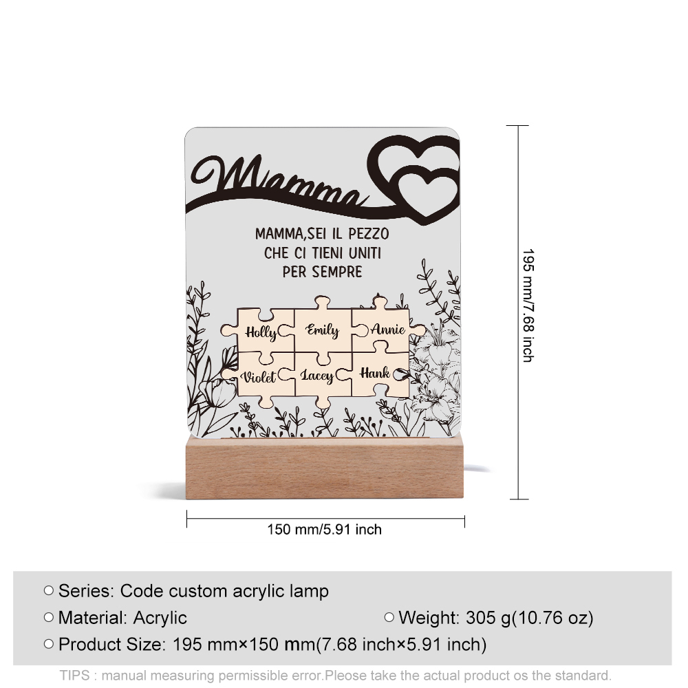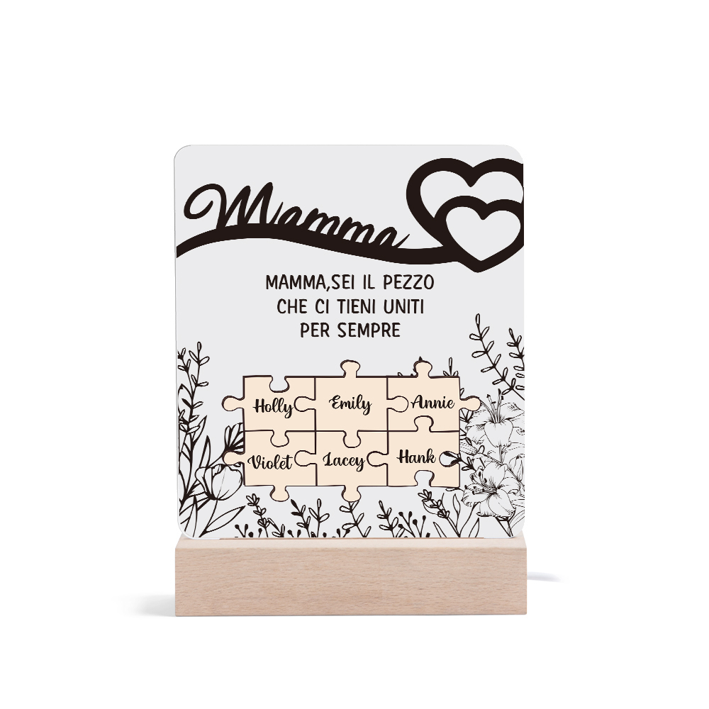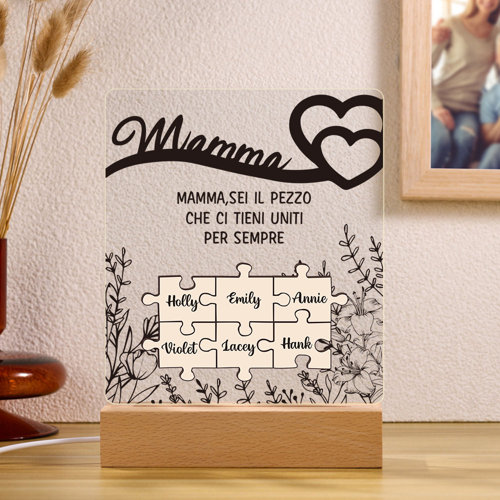 Mamma sei il pezzo che ci tieni uniti-Lampada acrilica con puzzle 6 nomi personalizzabili per mamma