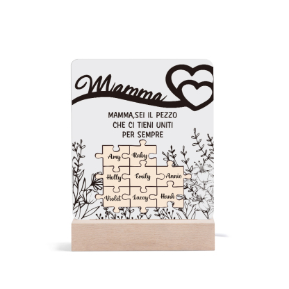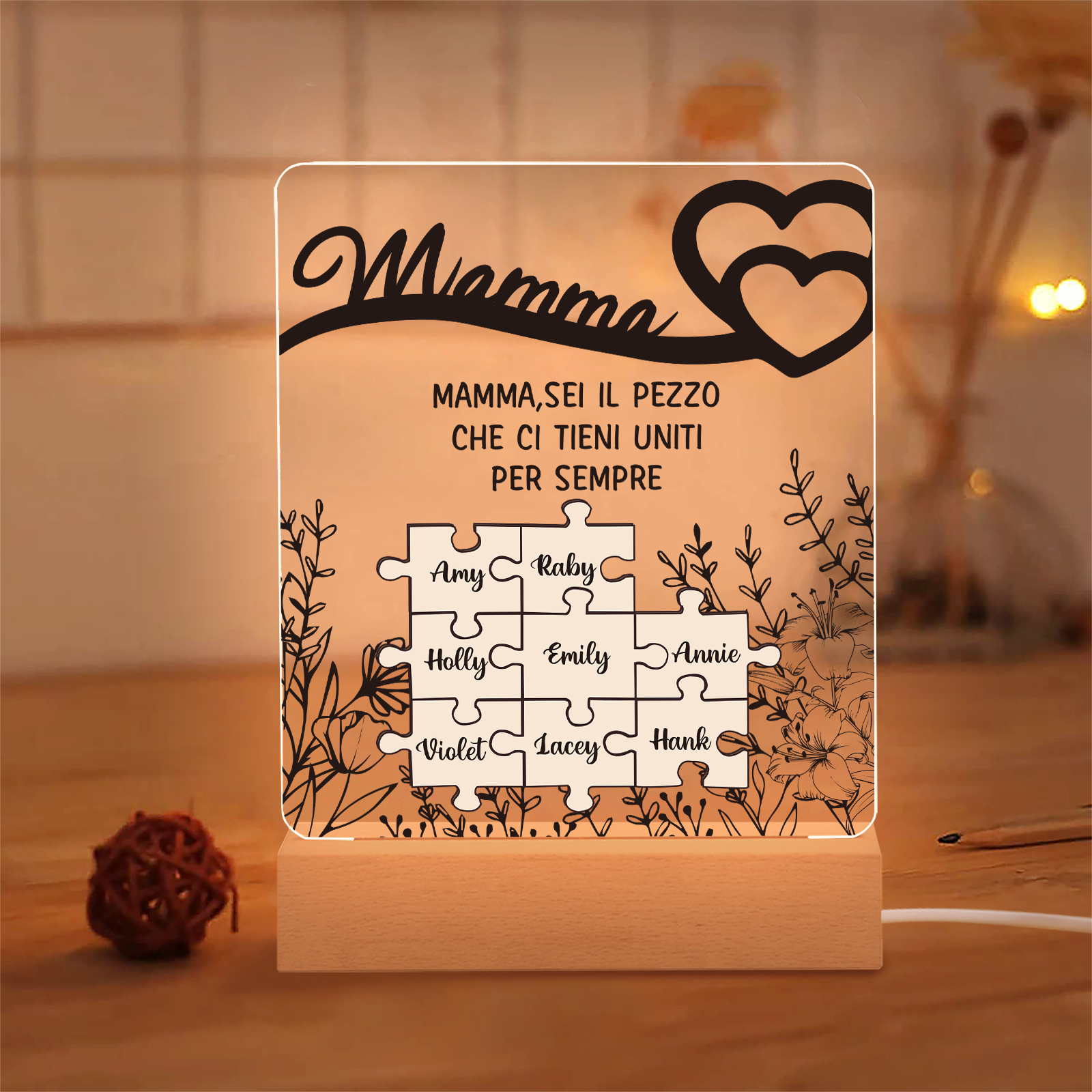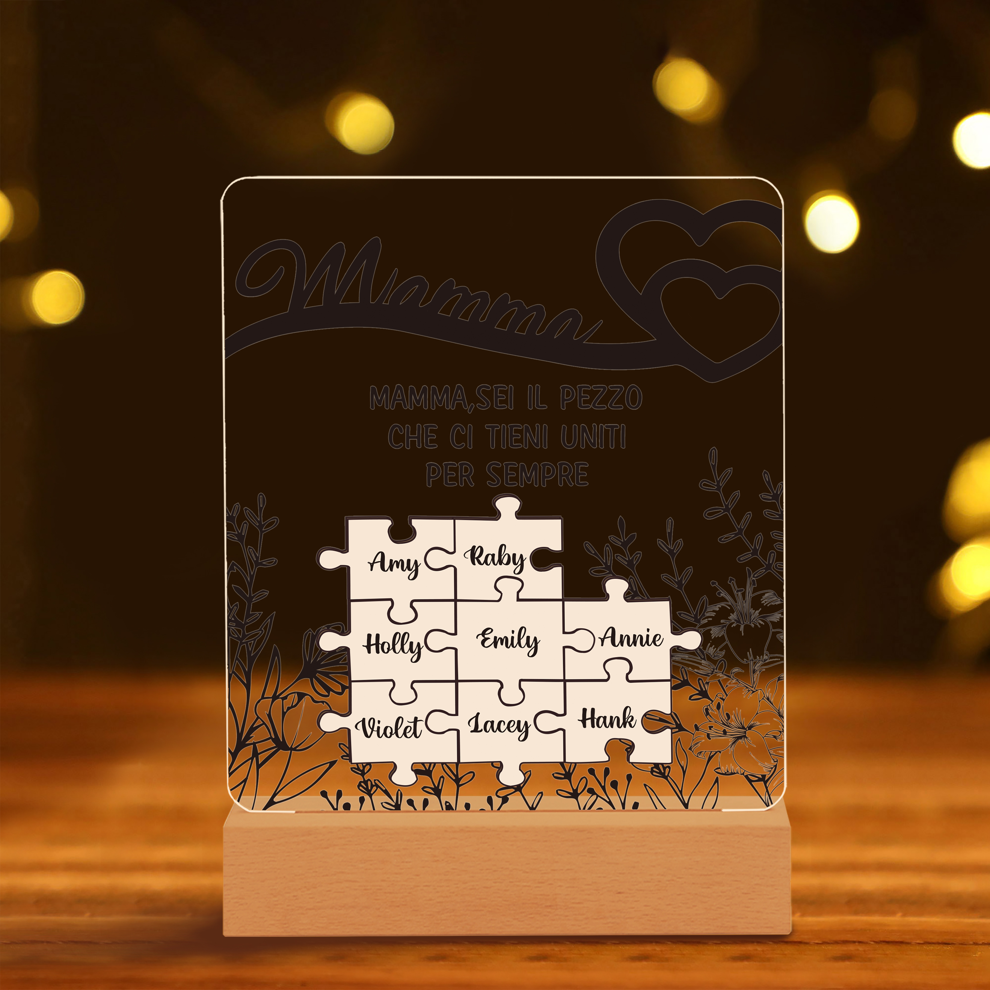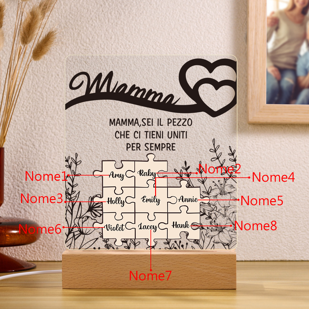 Mamma sei il pezzo che ci tieni uniti-Lampada acrilica con puzzle 8 nomi personalizzabili per mamma