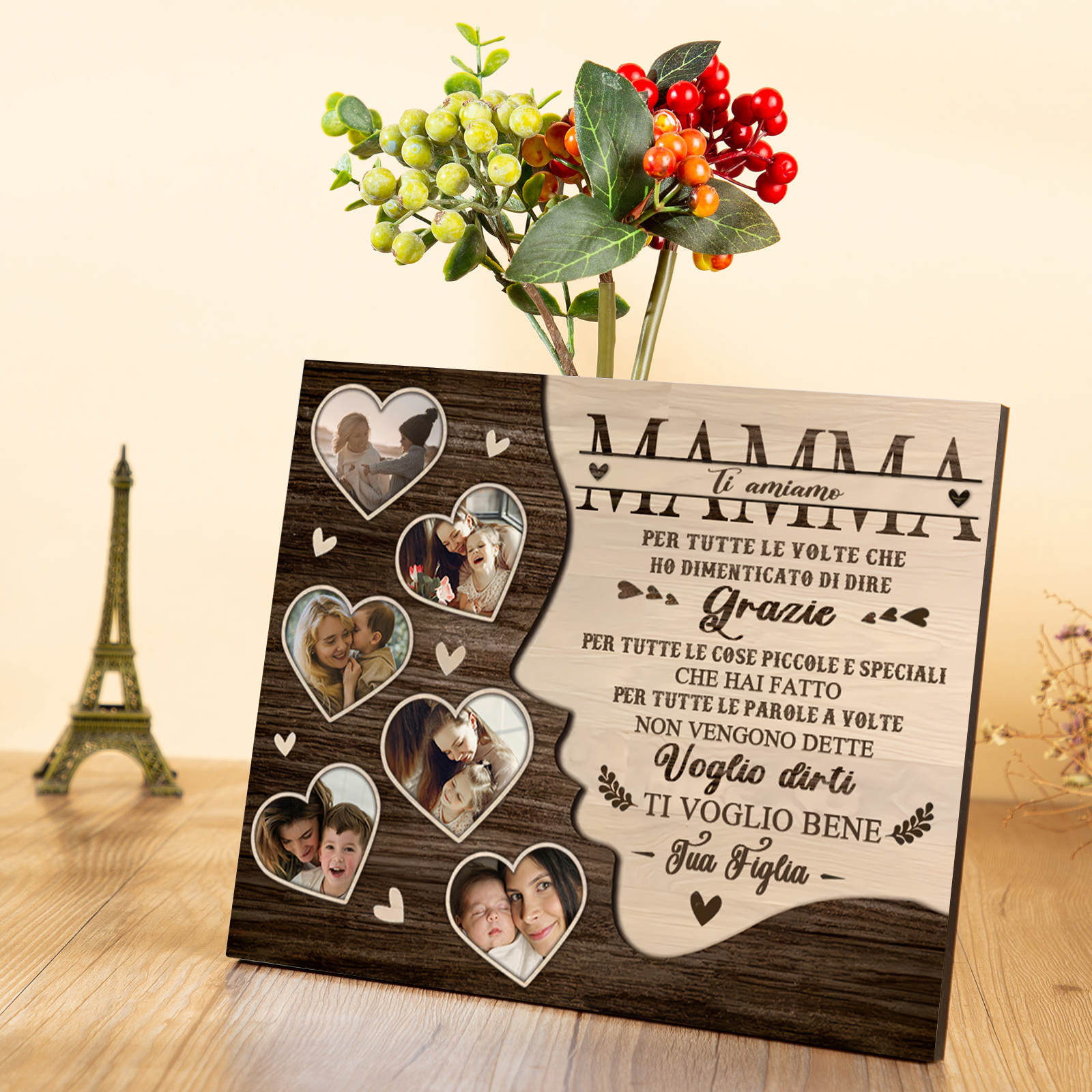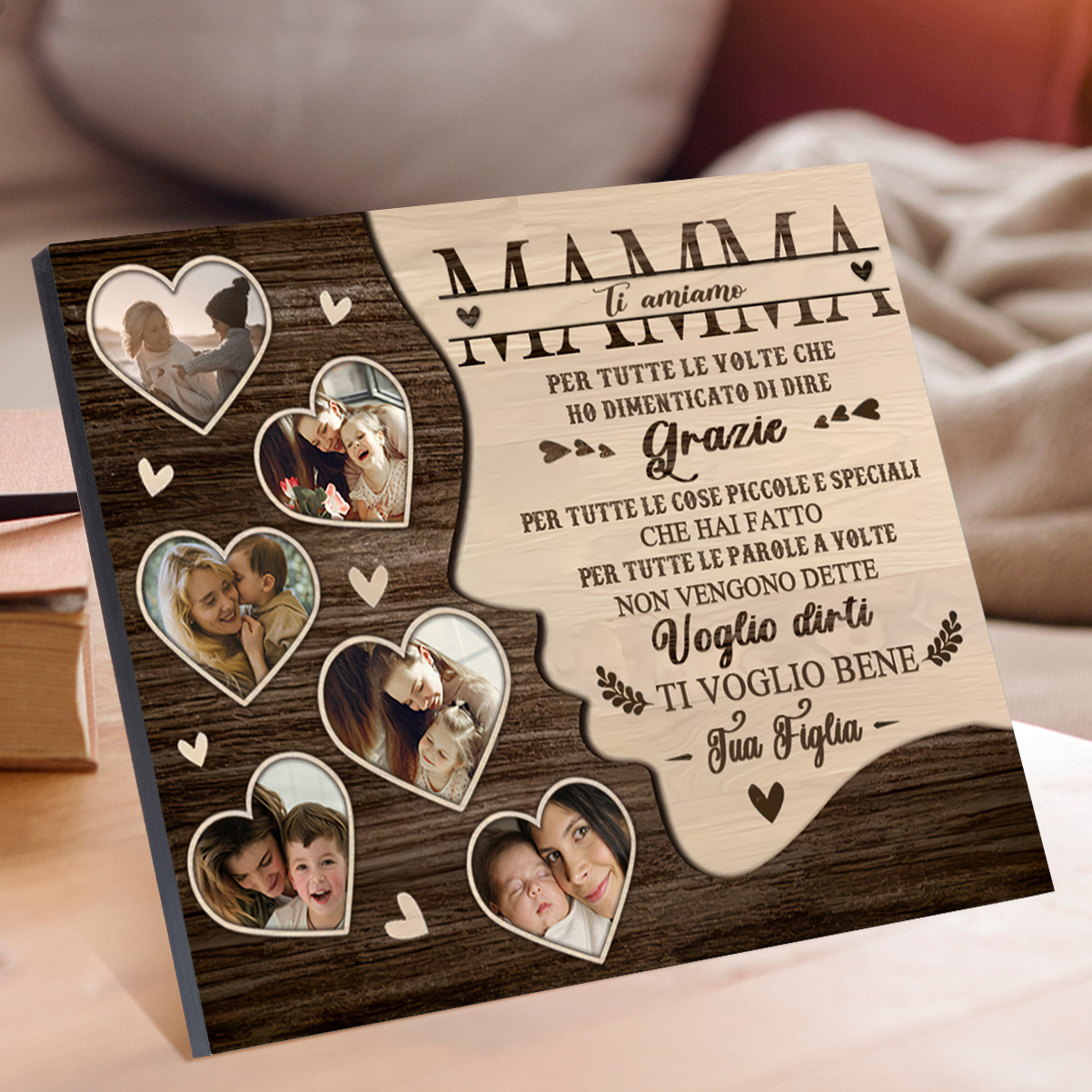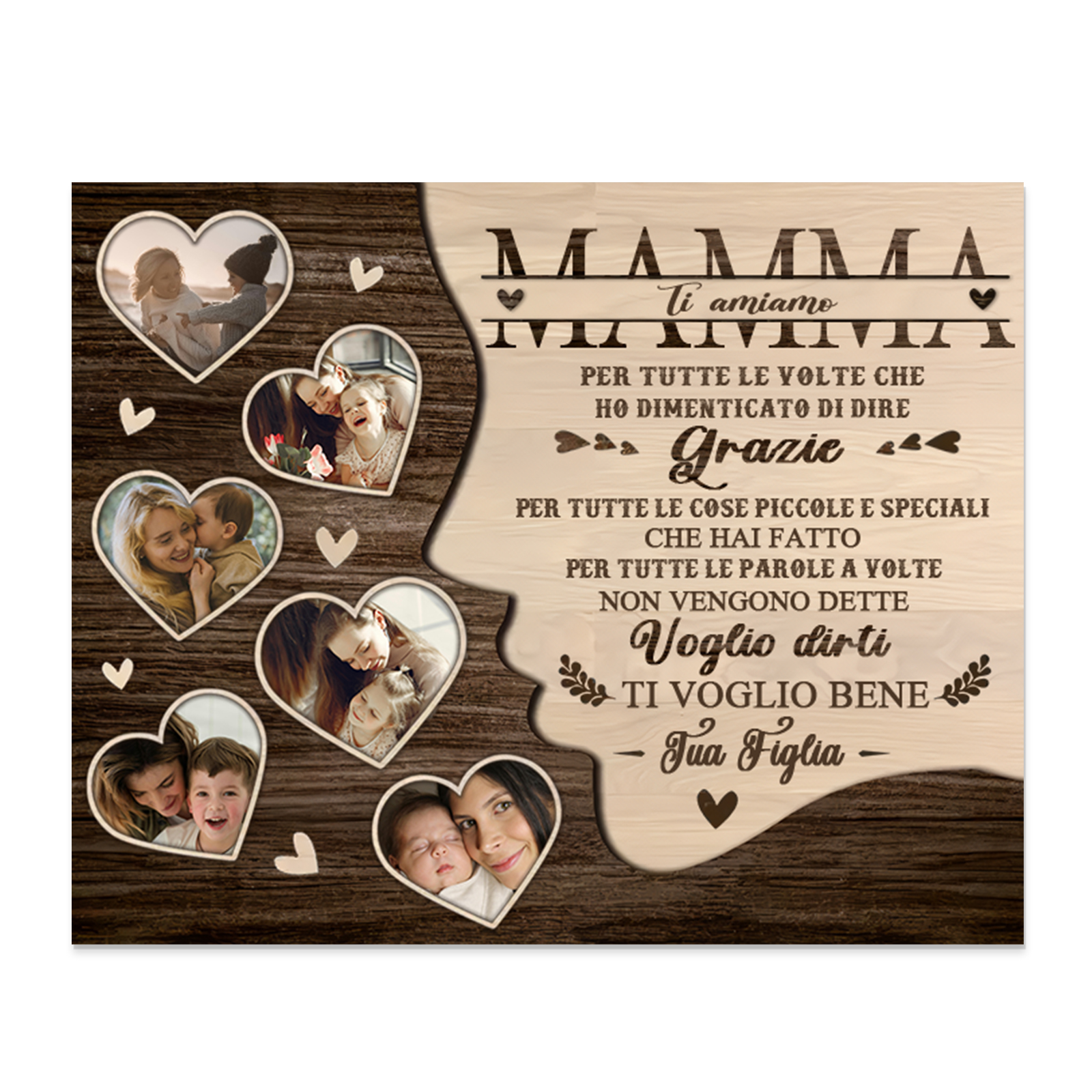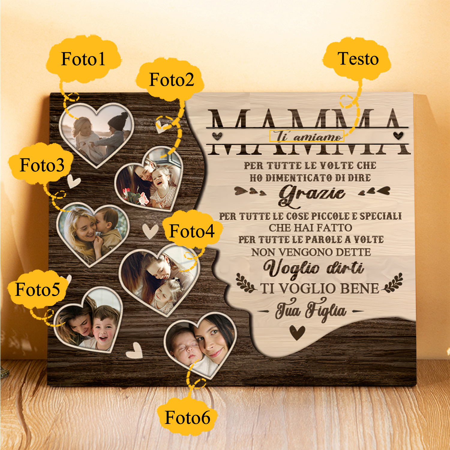 Mamma-Targa in legno cuore nell'albero con 1 testo e 6 foto personalizzati regalo per mamma
