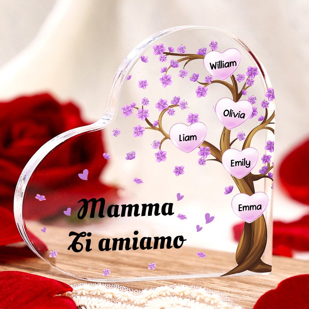 MAMMA Ti amiamo-Decorazione acrilica albero di cuore violeta 5 nomi e 1 testo personalizzati per mamma/nonna