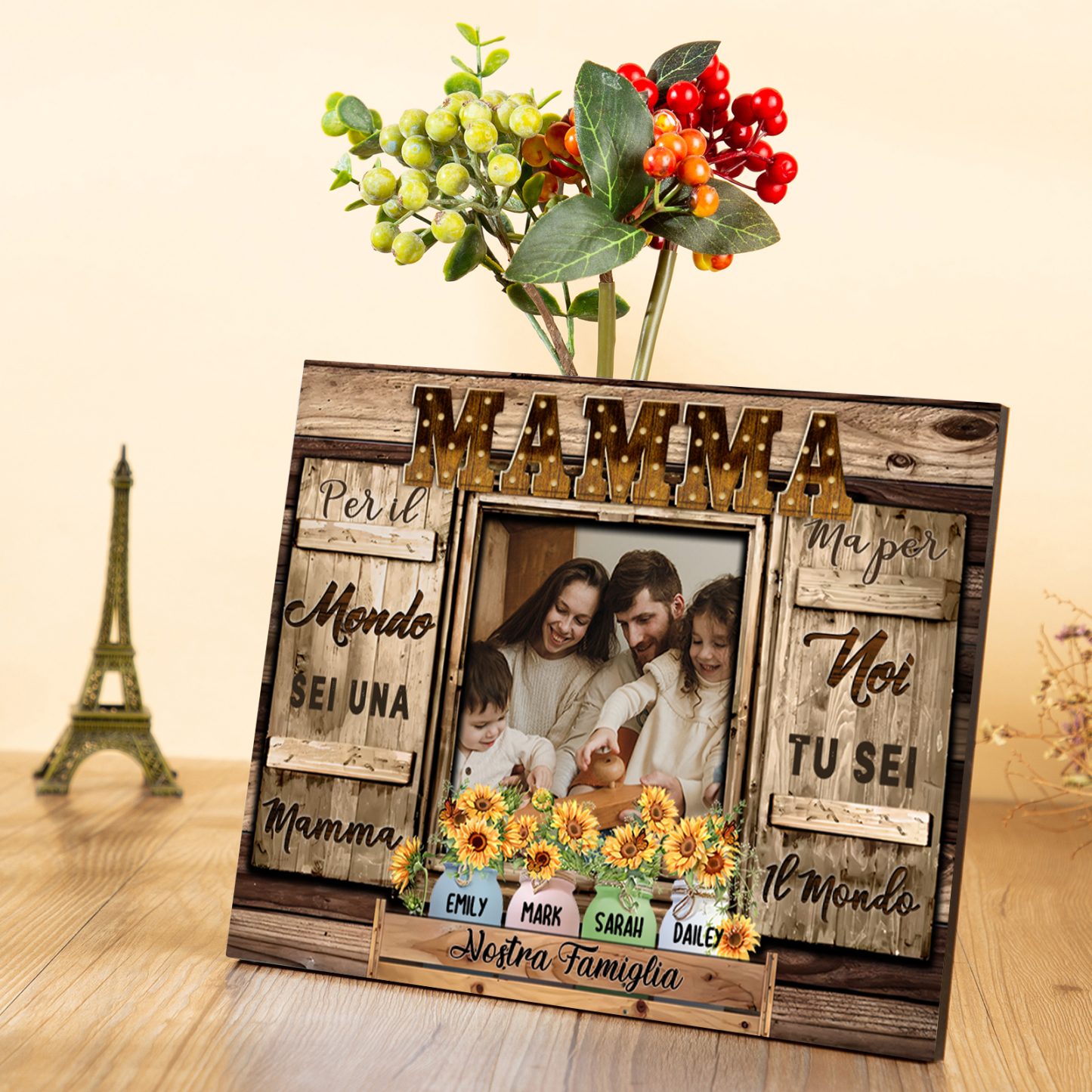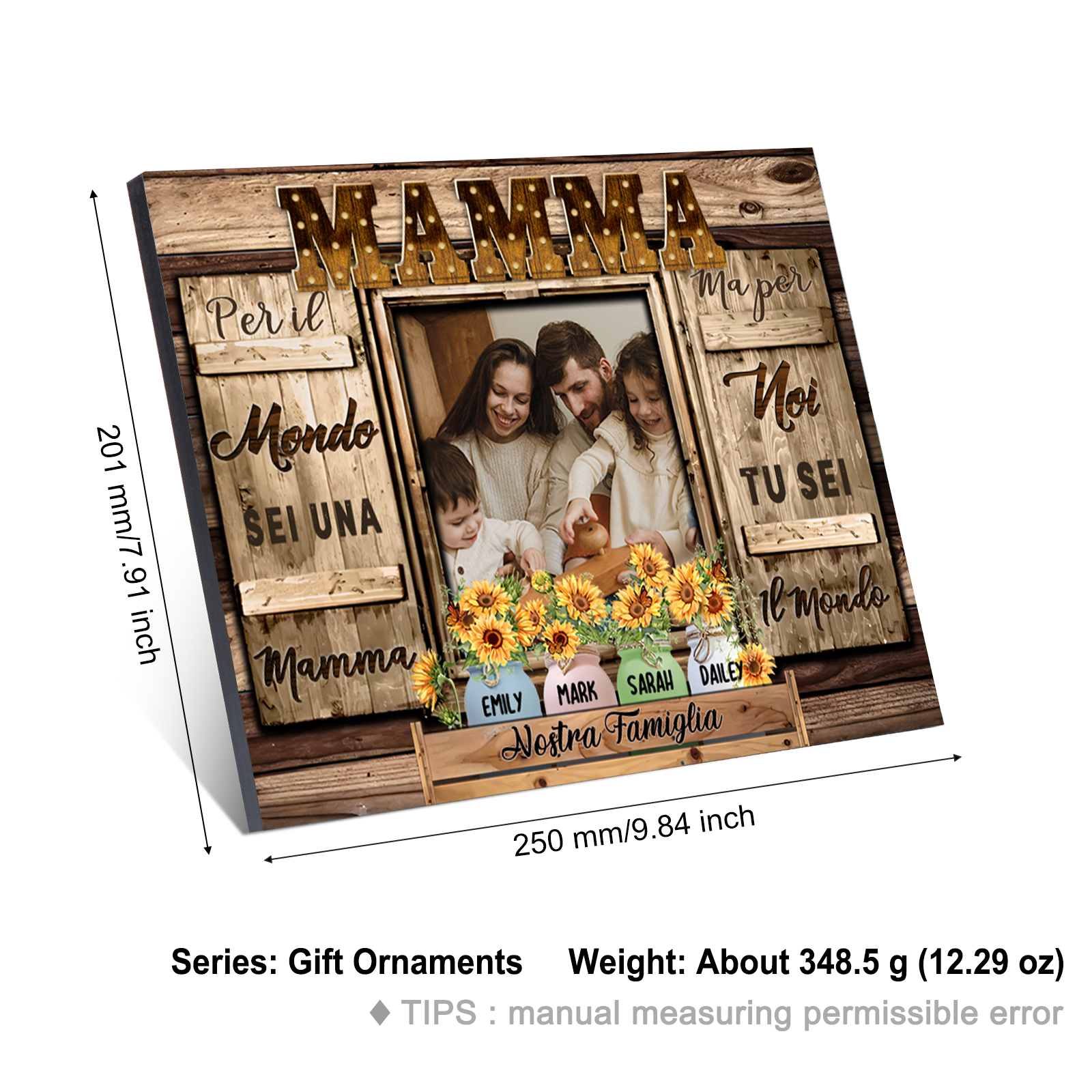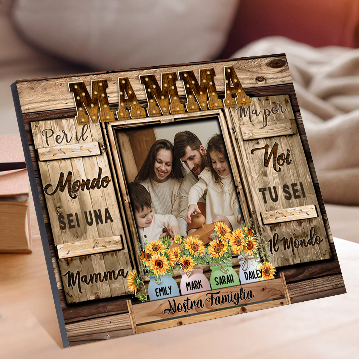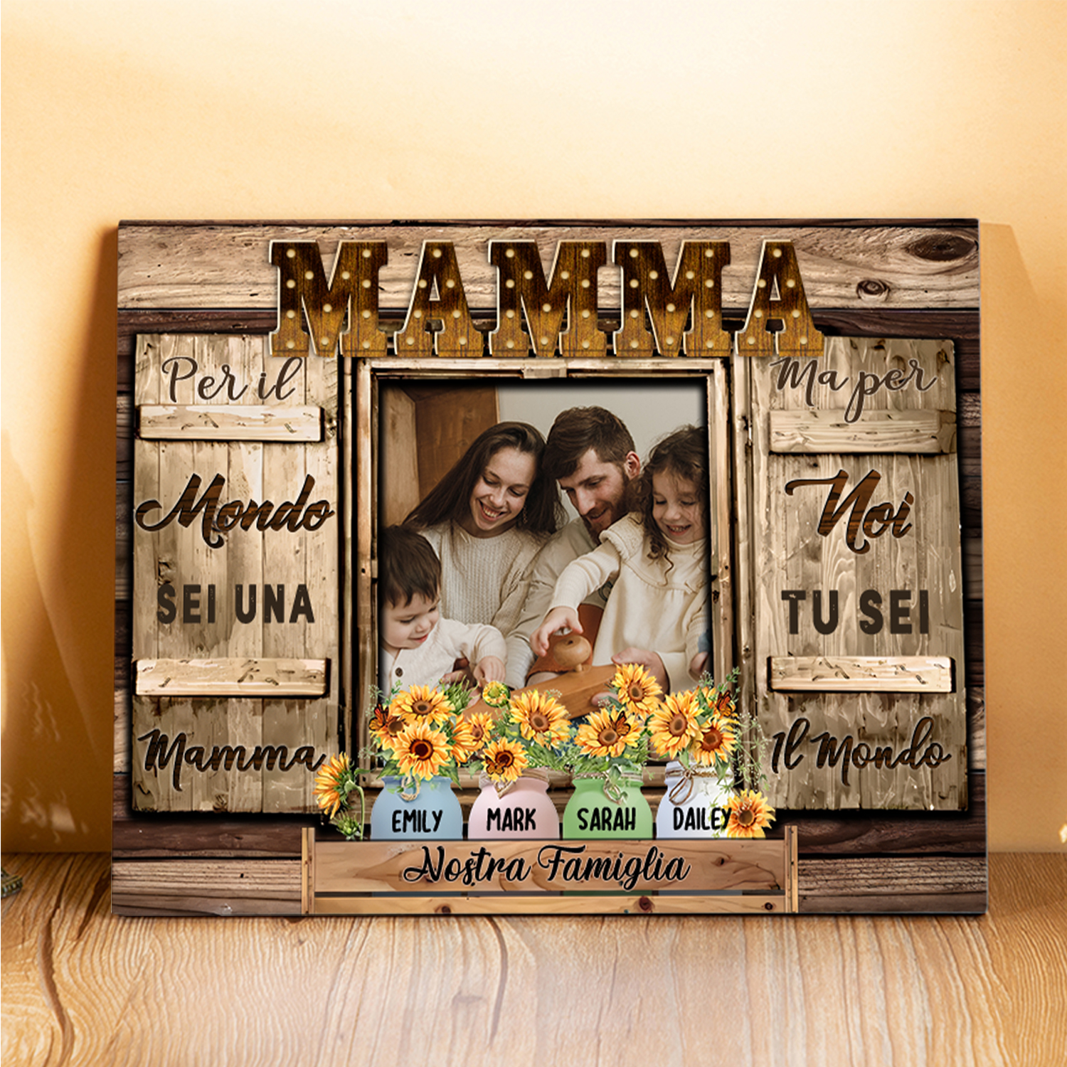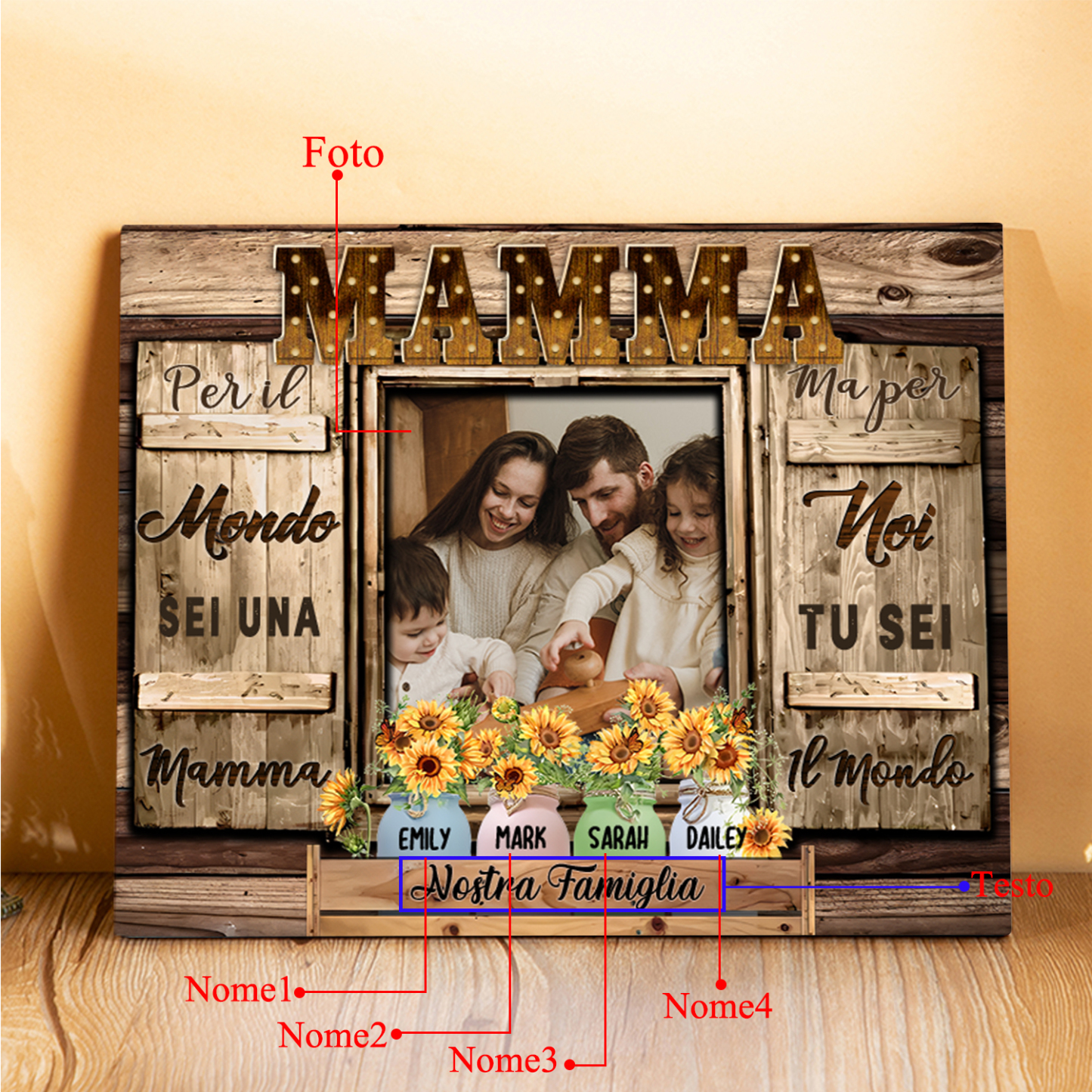 Mamma tu sei il mondo per me-Targa in legno girasole con 4 nomi 1 testo e 1 foto personalizzati regalo per mamma