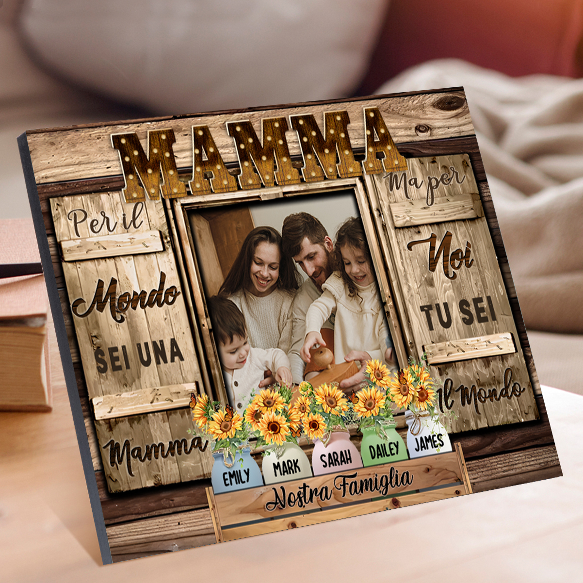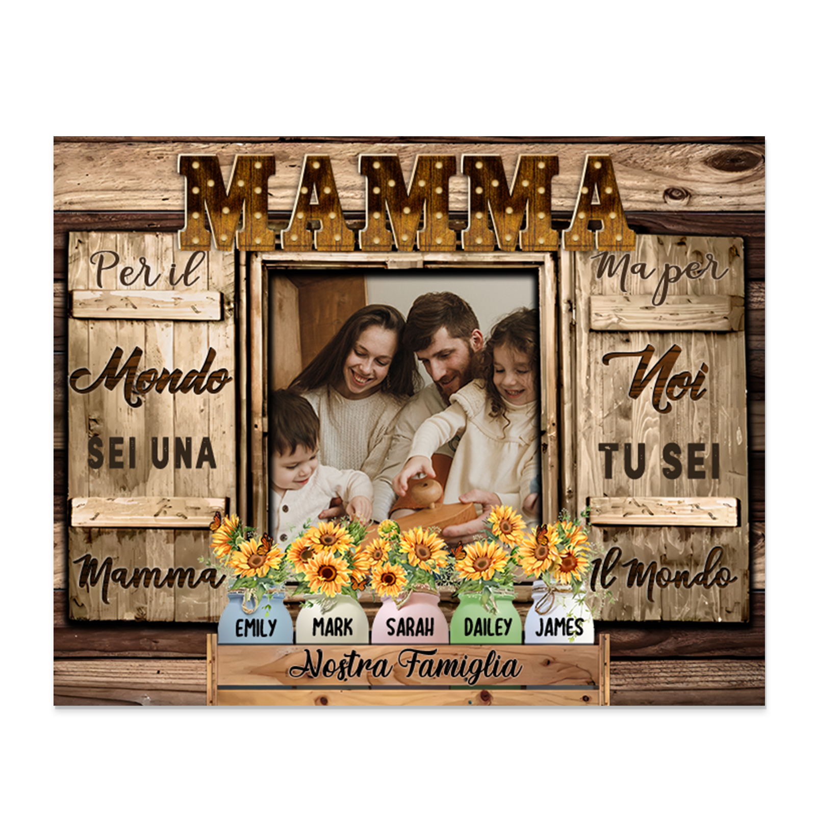 Mamma tu sei il mondo per me-Targa in legno girasole con 5 nomi 1 testo e 1 foto personalizzati regalo per mamma