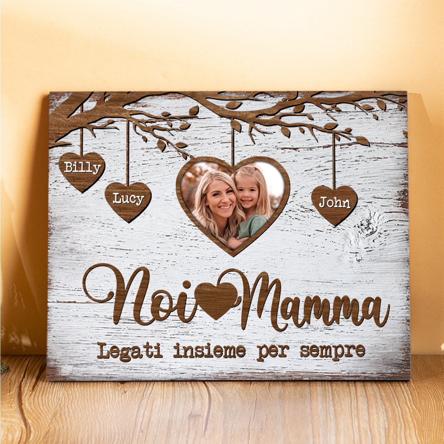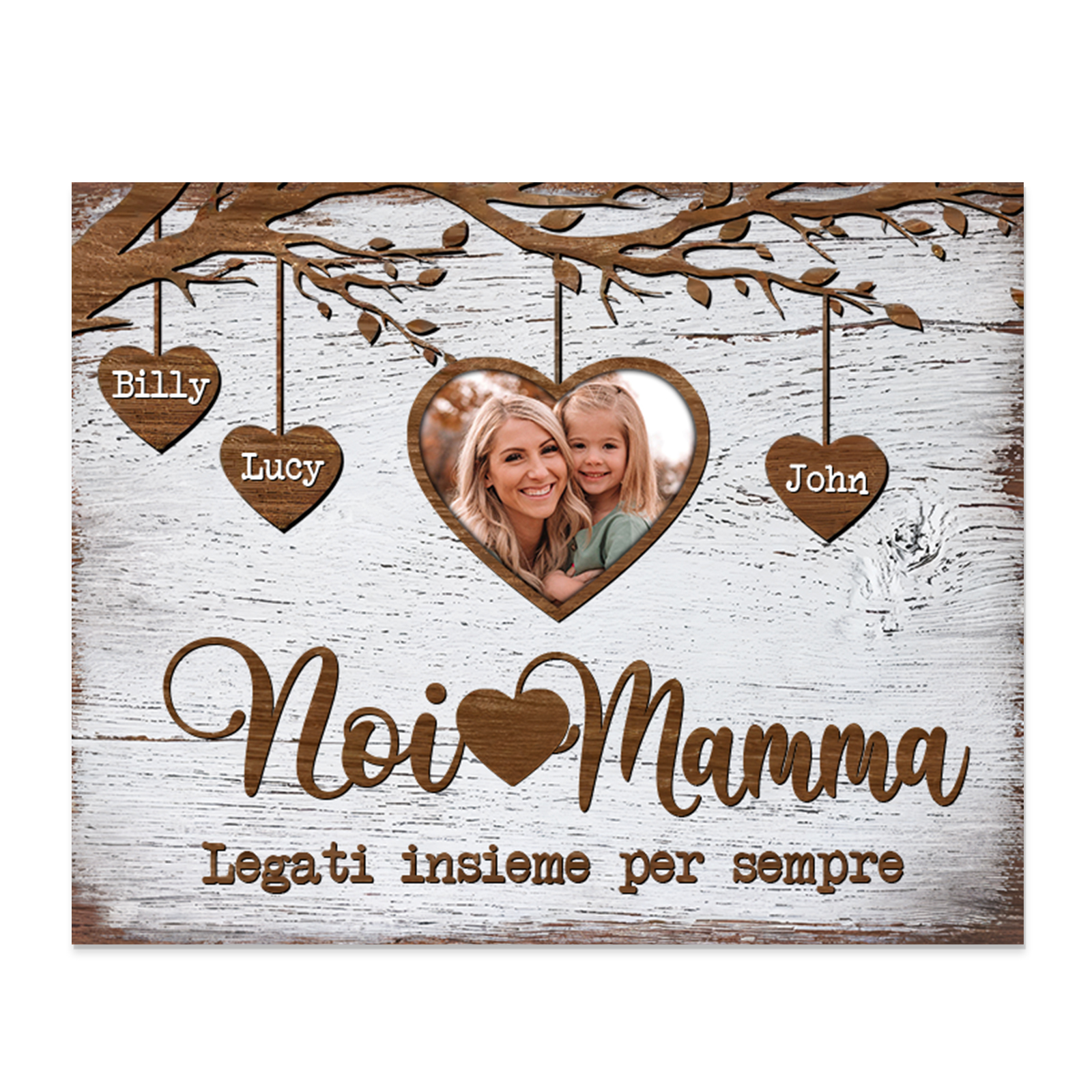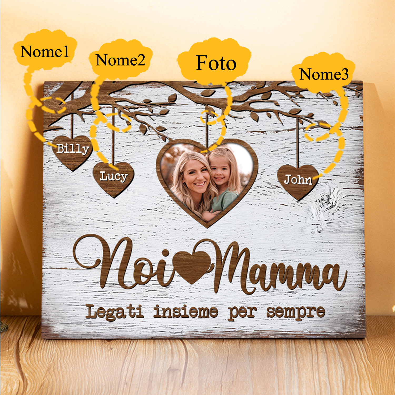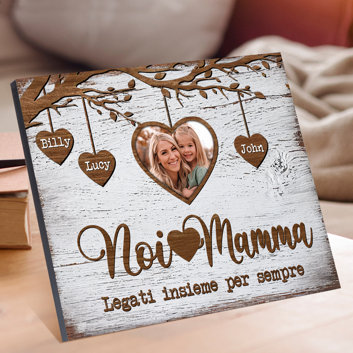 Noi e mamma legati insieme-Targa in legno albero di cuore con 3 nomi e 1 foto personalizzati regalo per mamma