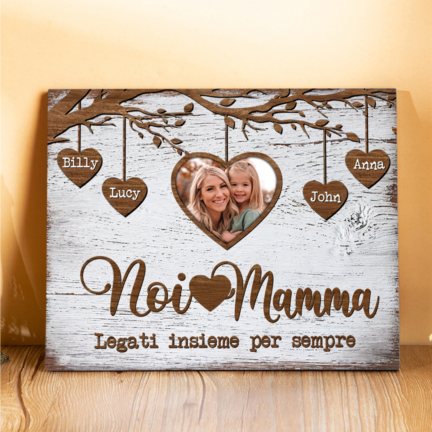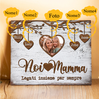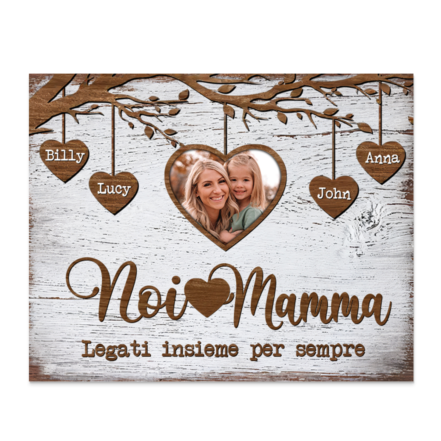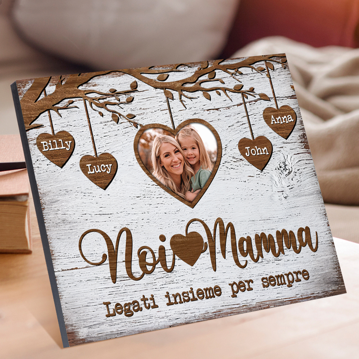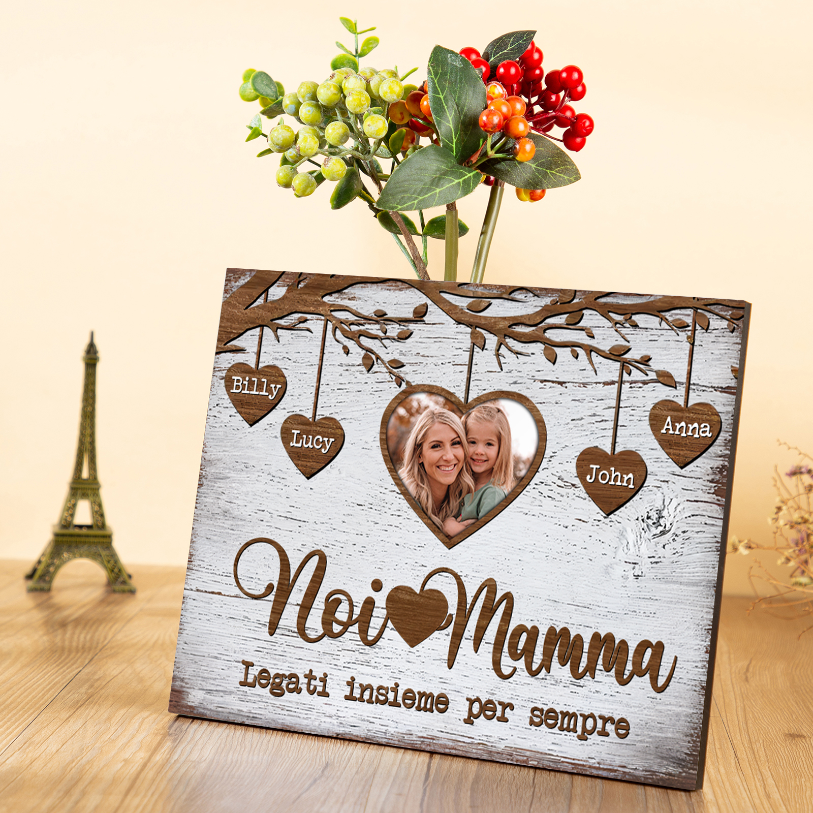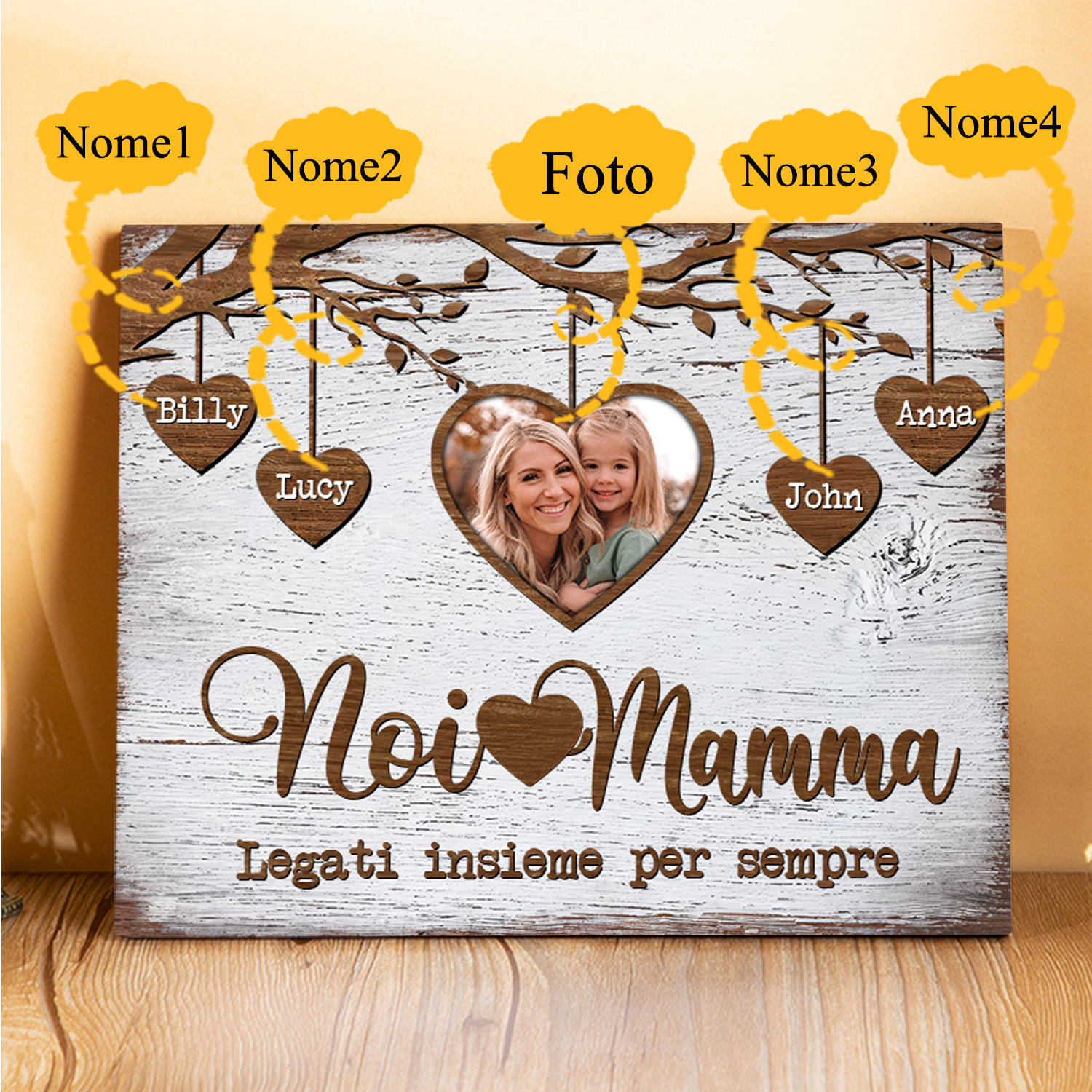 Noi e mamma legati insieme-Targa in legno albero di cuore con 4 nomi e 1 foto personalizzati regalo per mamma