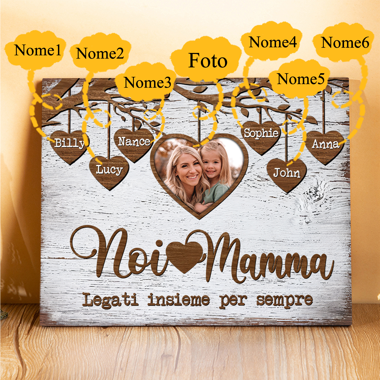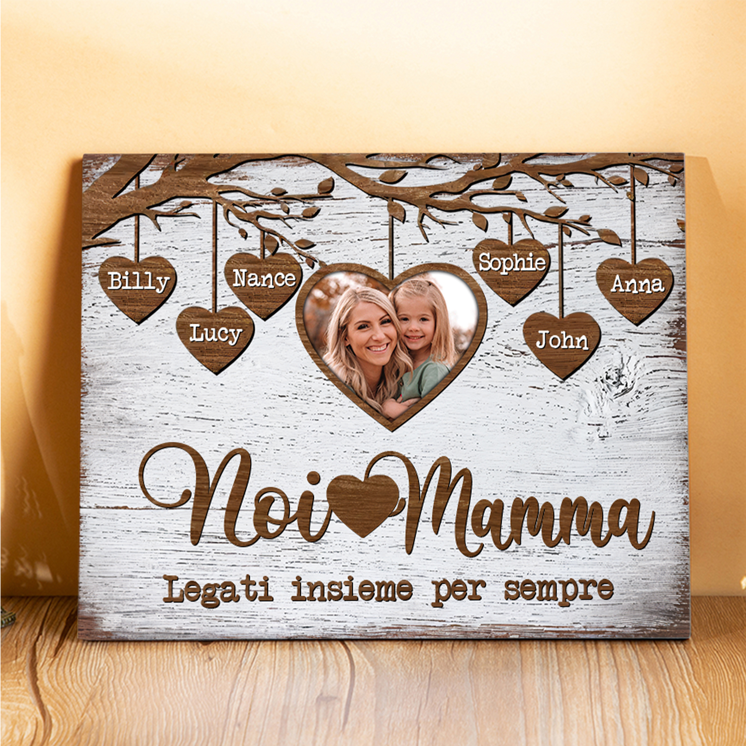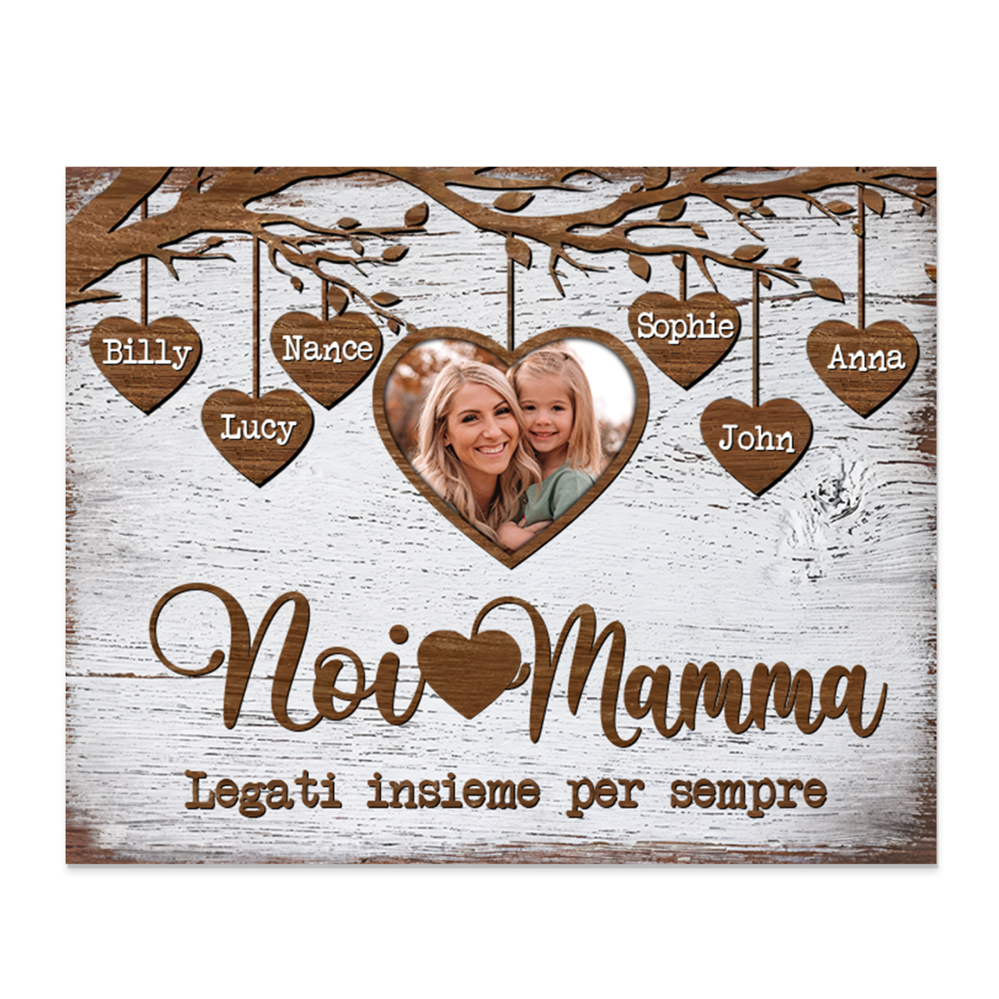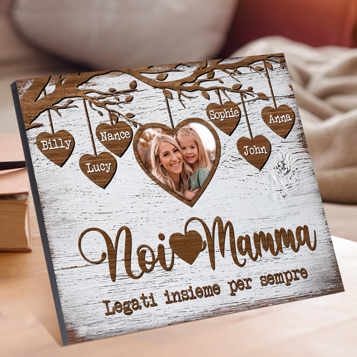 Noi e mamma legati insieme-Targa in legno albero di cuore con 6 nomi e 1 foto personalizzati regalo per mamma
