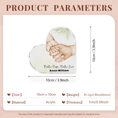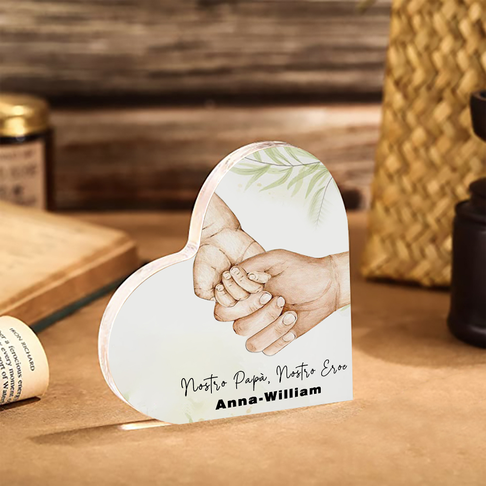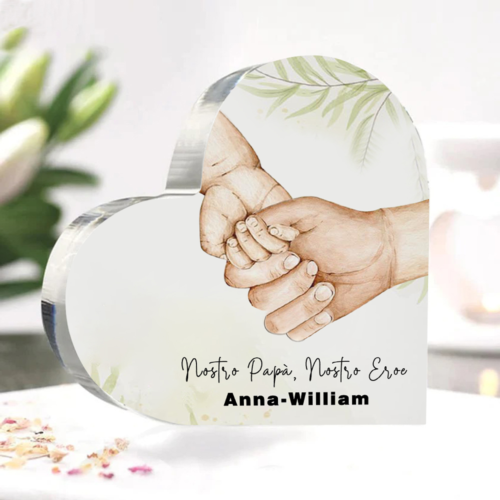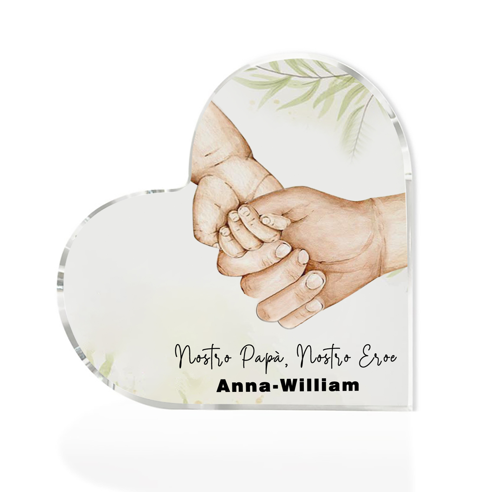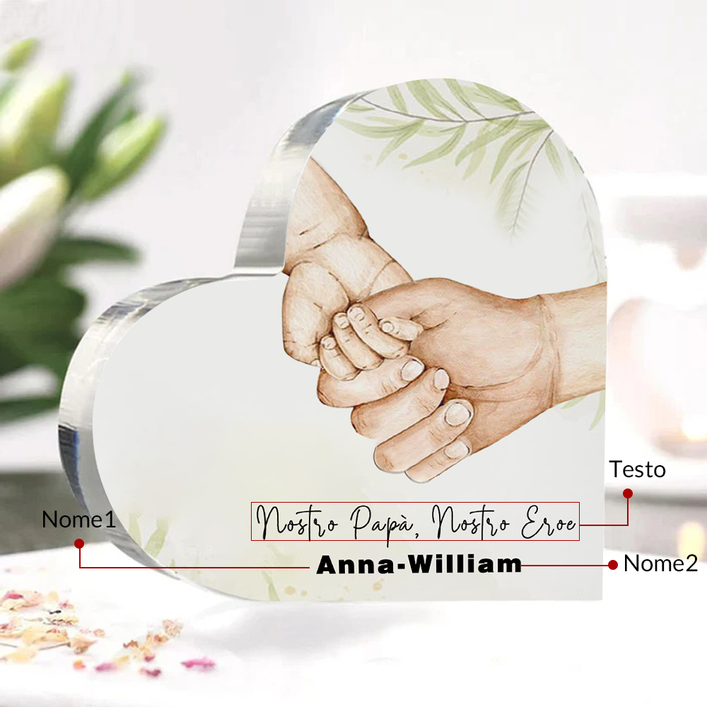 Nostro papà nostro eroe-Deco acrilico cuore mano nella mano per papà 2 nomi e 1 testo personalizzabili