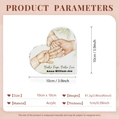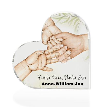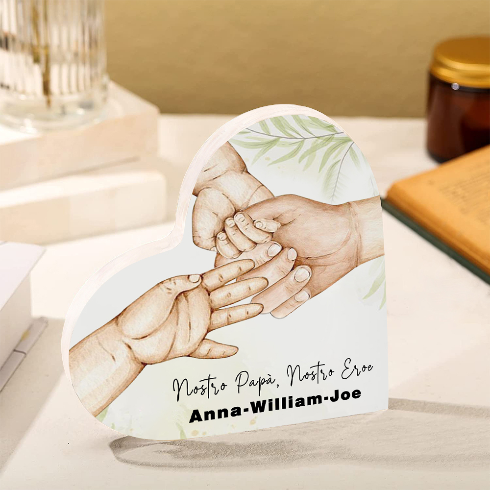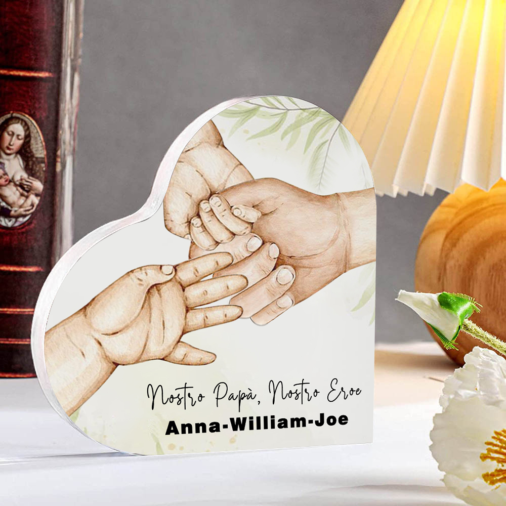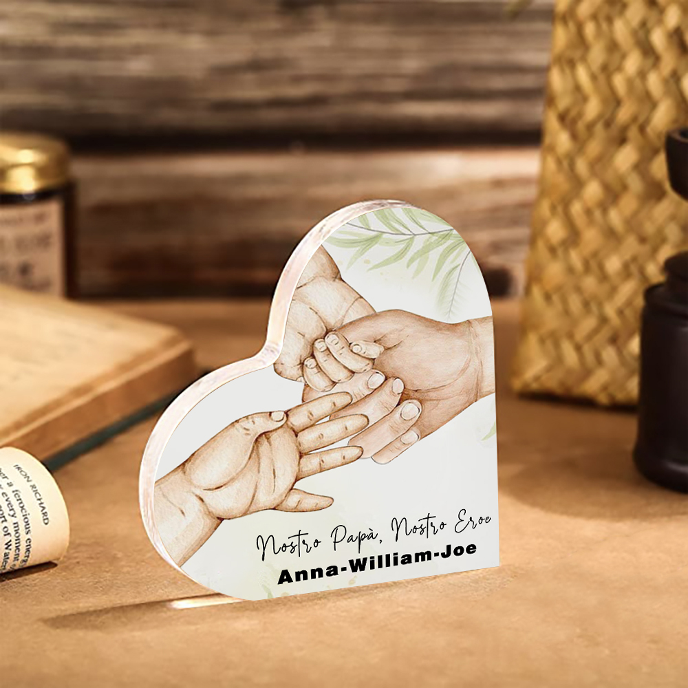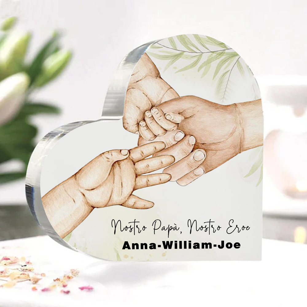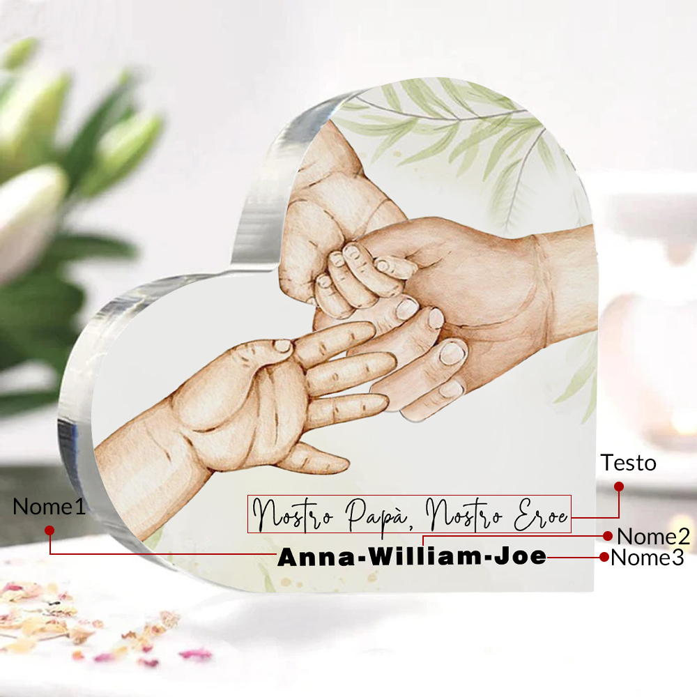 Nostro papà nostro eroe-Deco acrilico cuore mano nella mano per papà 3 nomi e 1 testo personalizzabili