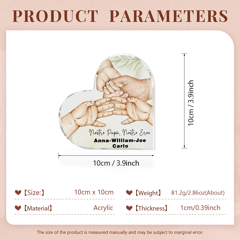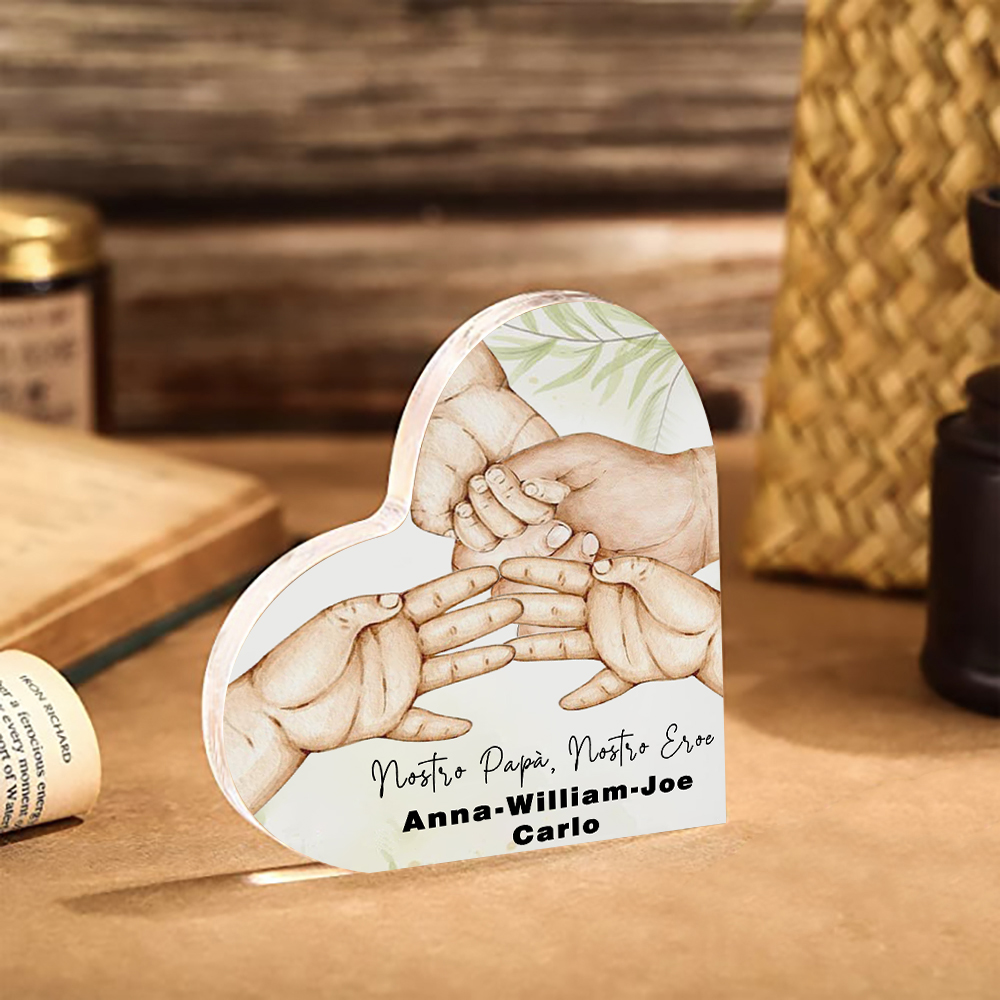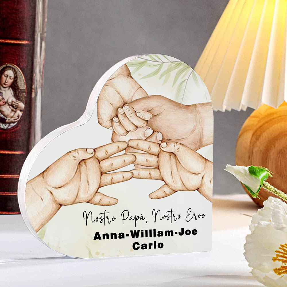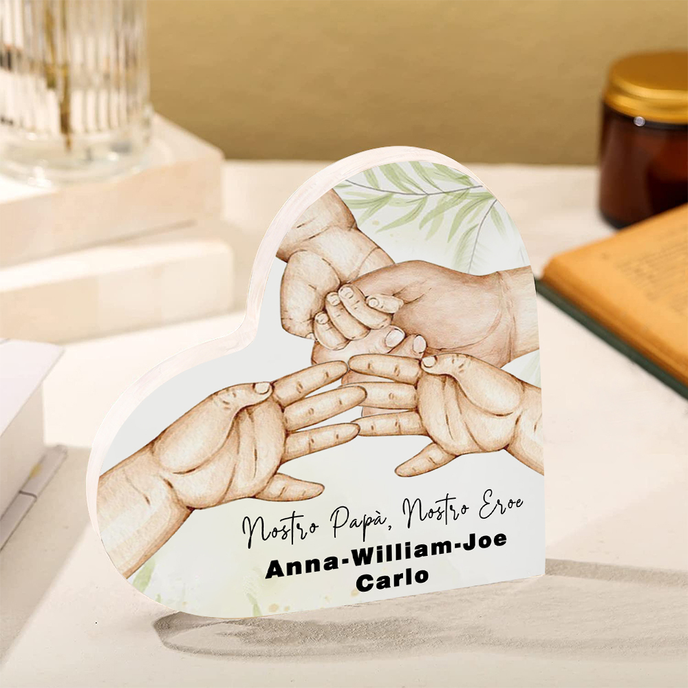 Nostro papà nostro eroe-Deco acrilico cuore mano nella mano per papà 4 nomi e 1 testo personalizzabili