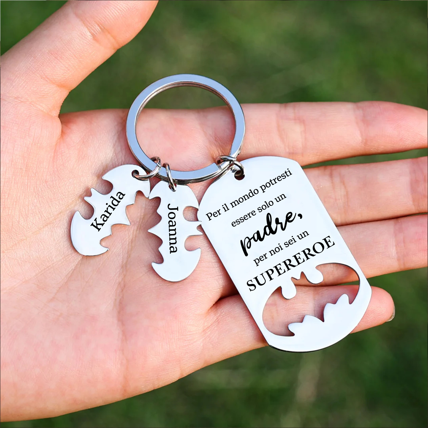 Per noi sei un supereroe-Portachiavi con ciondolo mazza 2 nomi per papà regalo della festa di padre