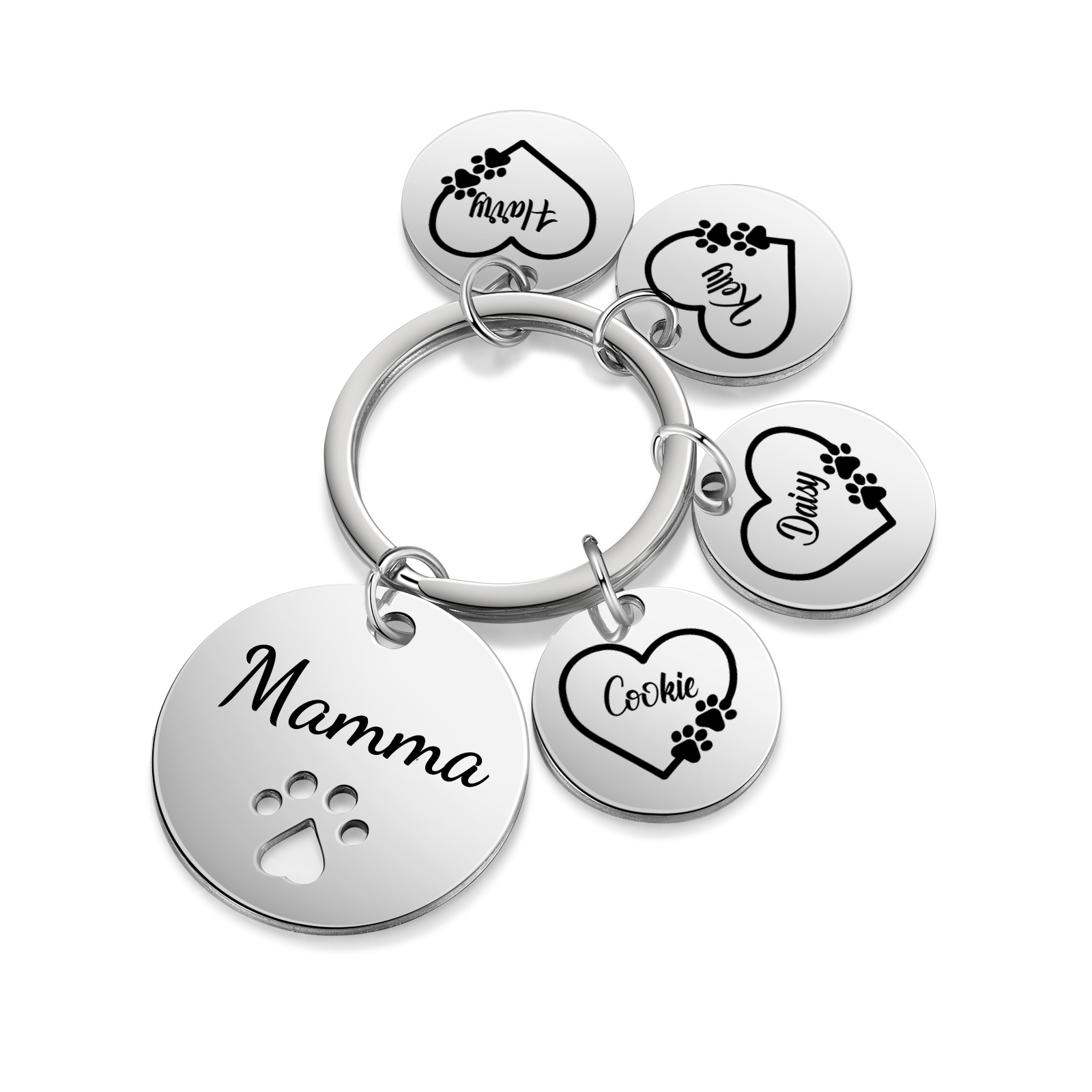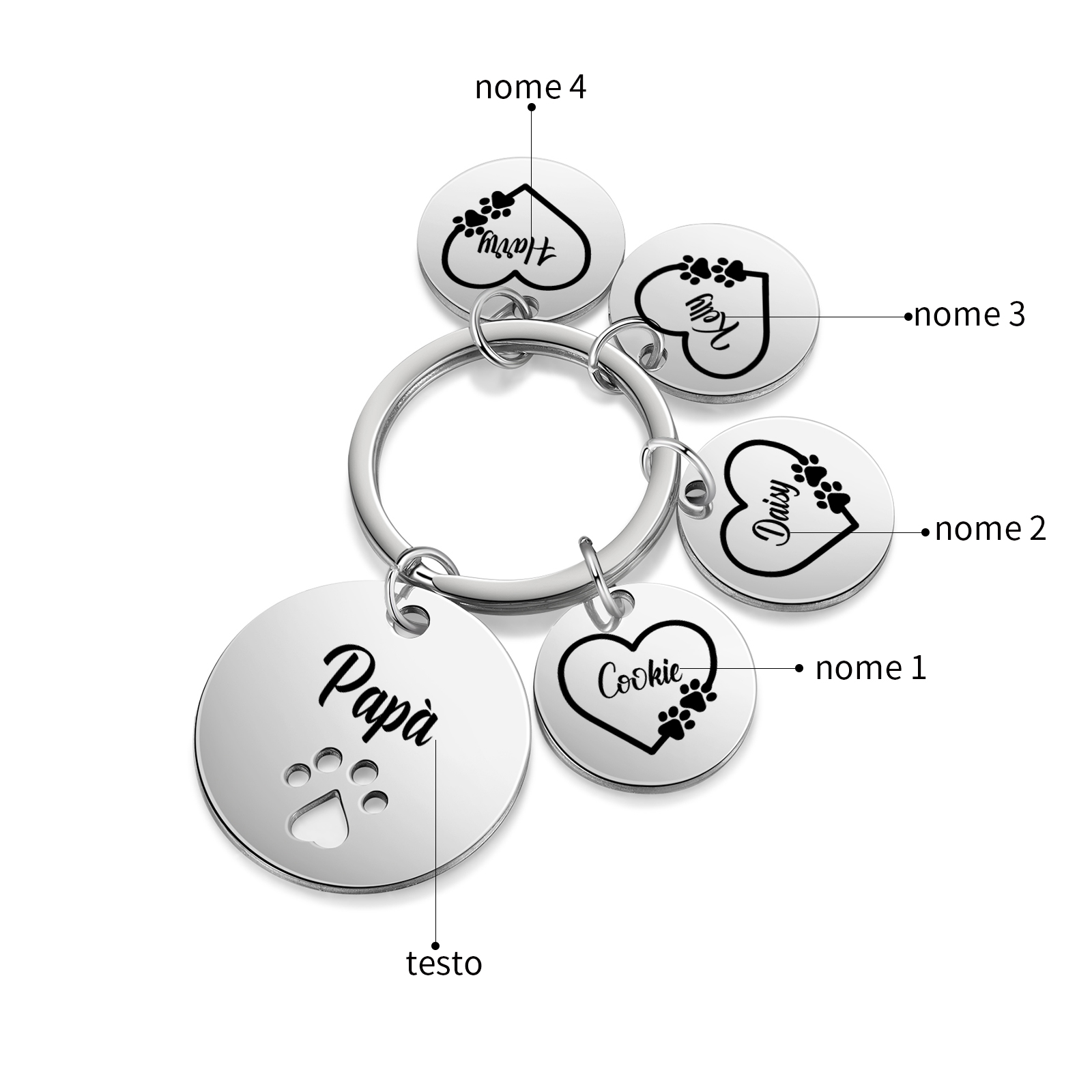 Portachiavi cerchio impronta di zampa con ciondolo di cuore nome 4 nomi e 1 testo personalizzati
