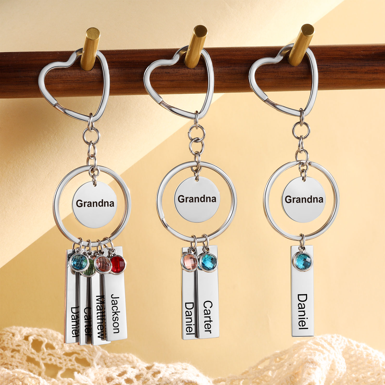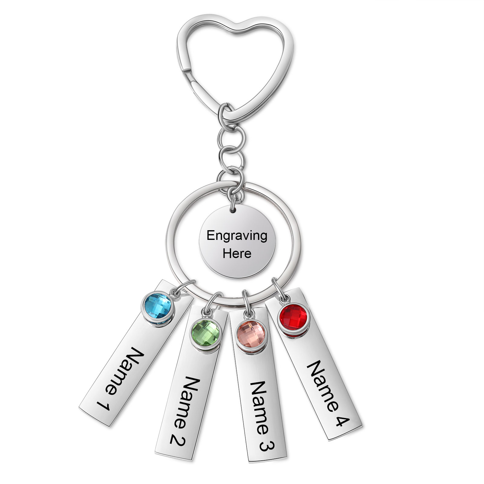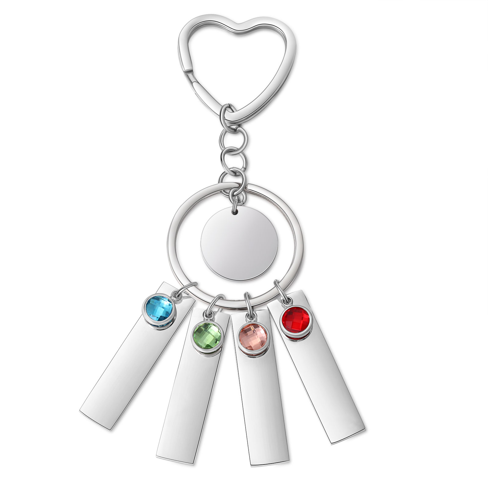 Portachiavi con ciondolo di 4 nomi un cerchio cuore e 4 pietre di nascita e 1 testo personalizzati
