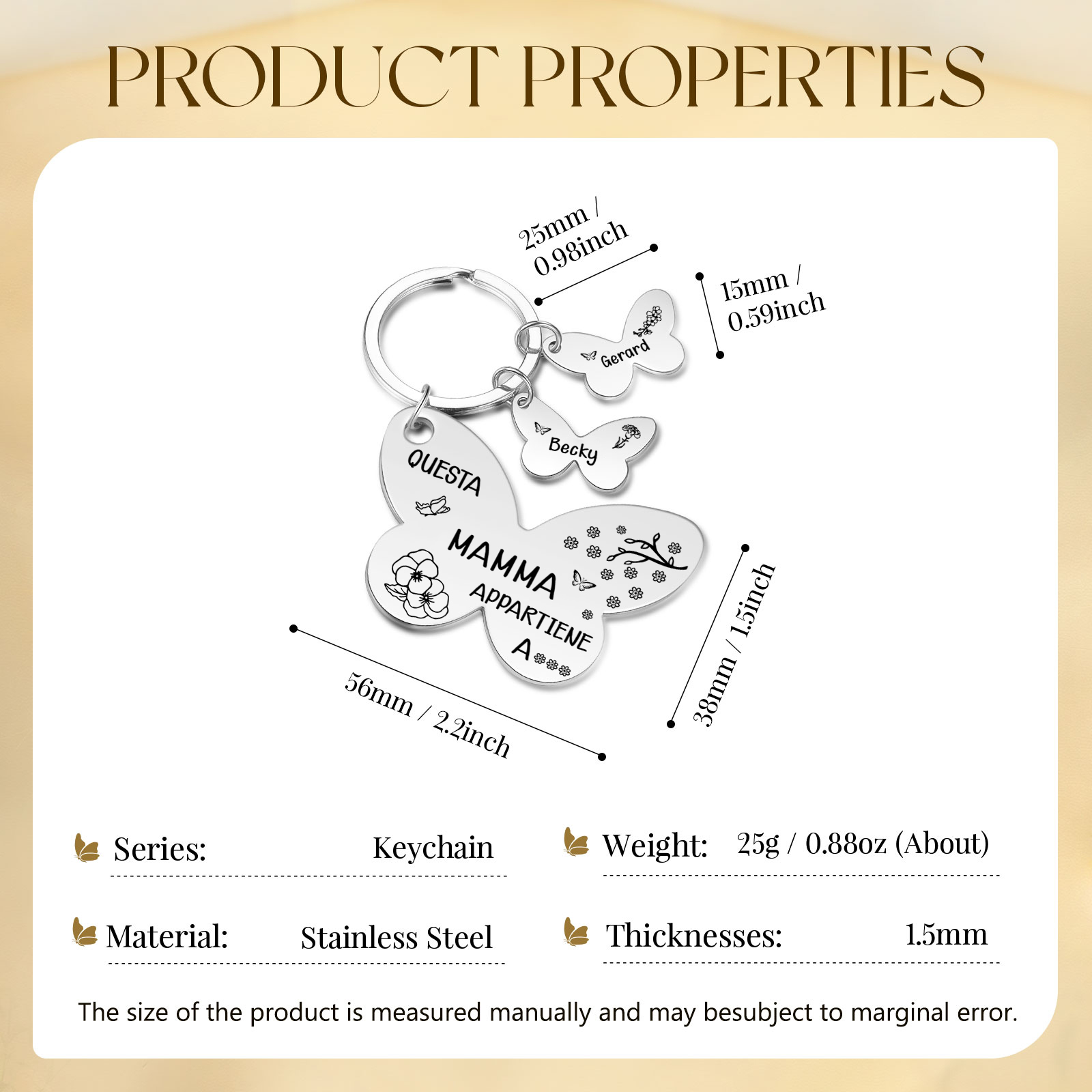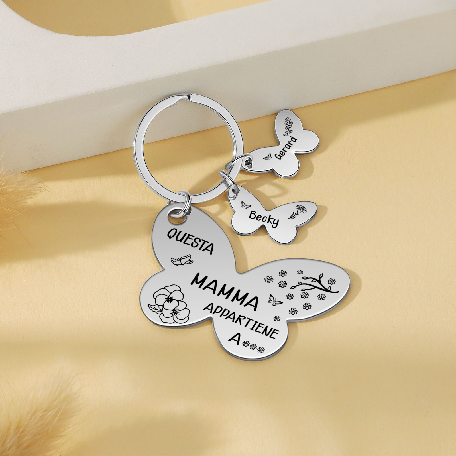 Questa mamma appartiene a-Portachiavi con ciondolo di farfalla con 2 nomi e 2 fiori di nascita e 1 testo personalizzati
