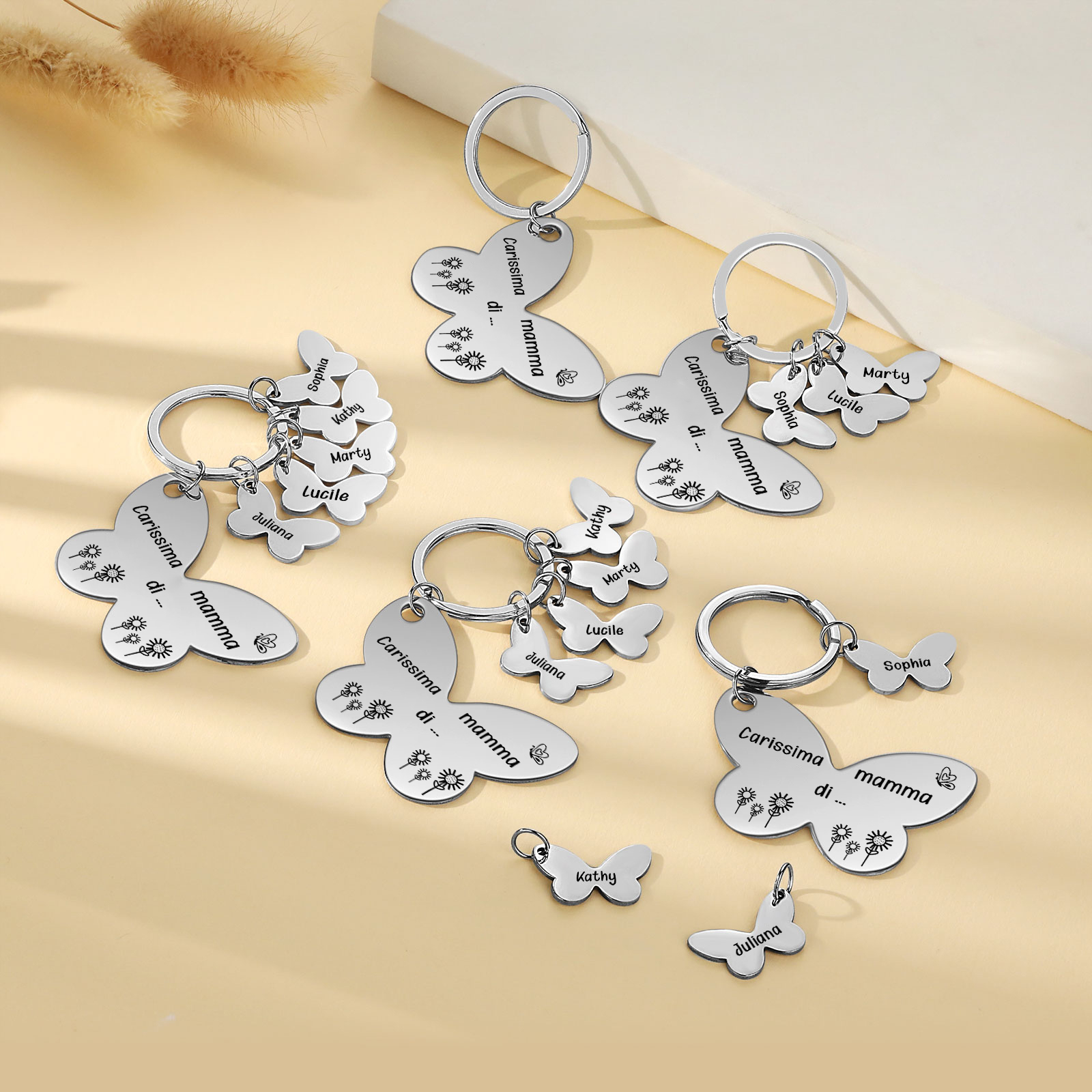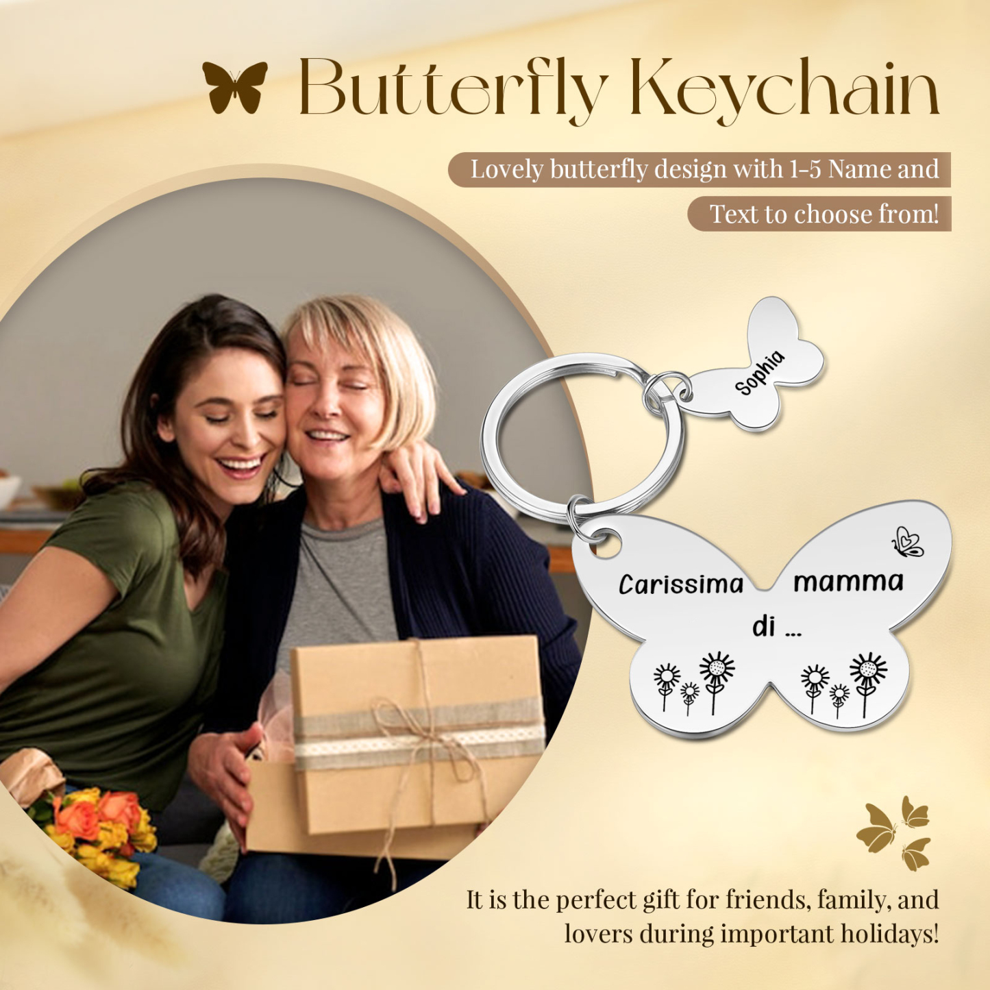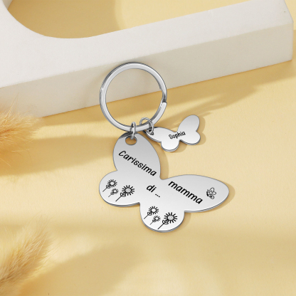 Carissima mamma di-Portachiavi con ciondolo di farfalla e fiori con 1 testo e 1 nome personalizzati