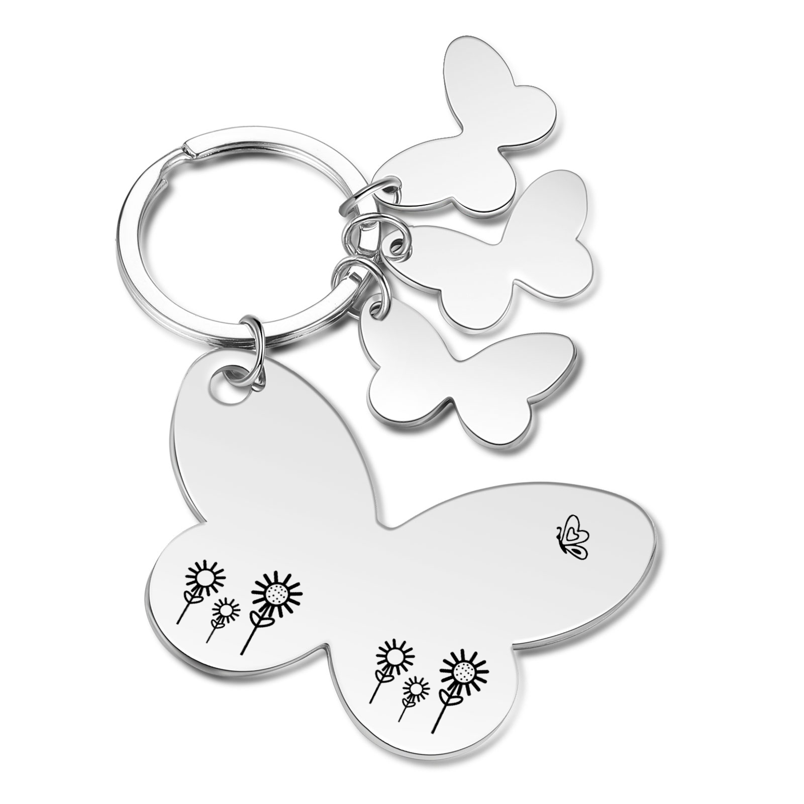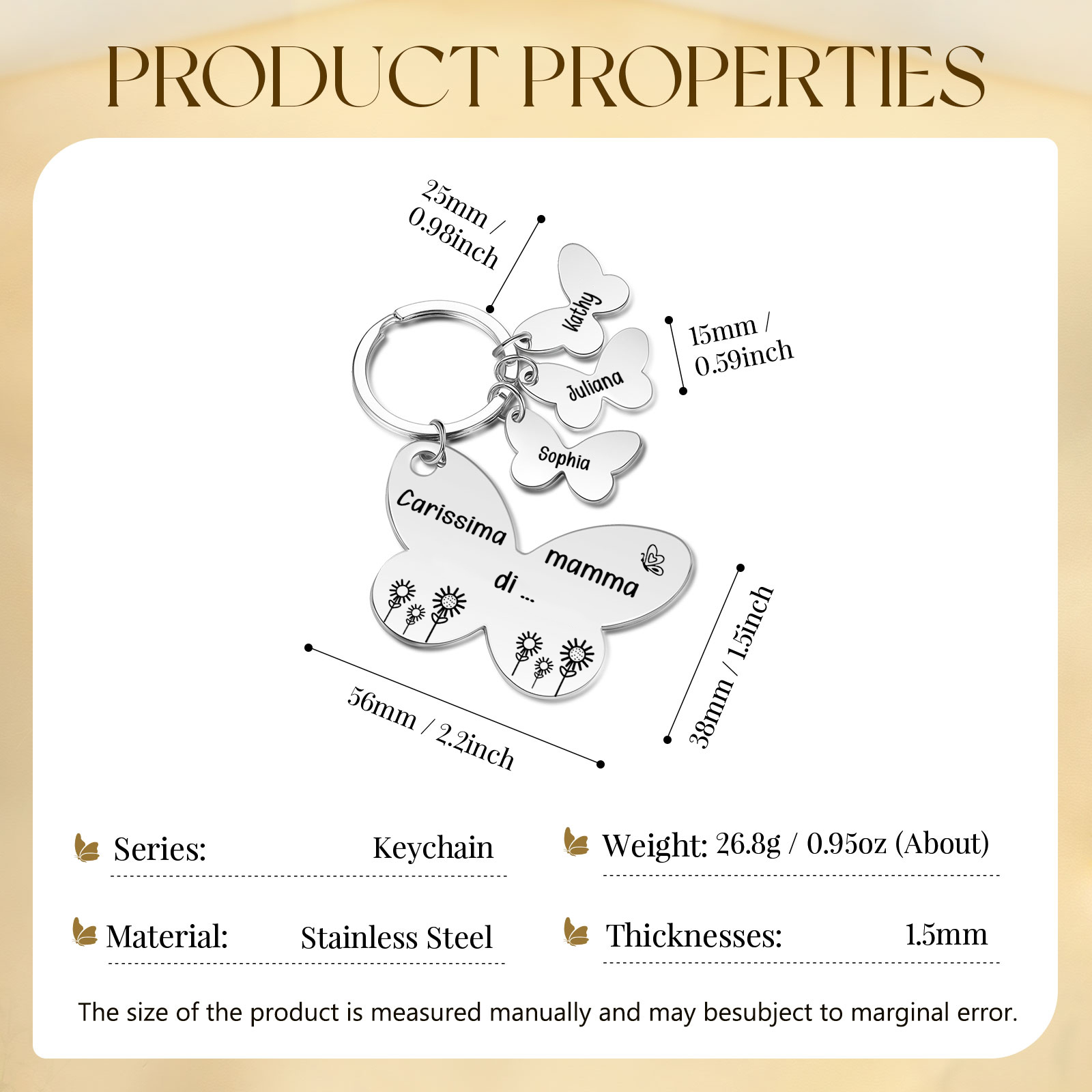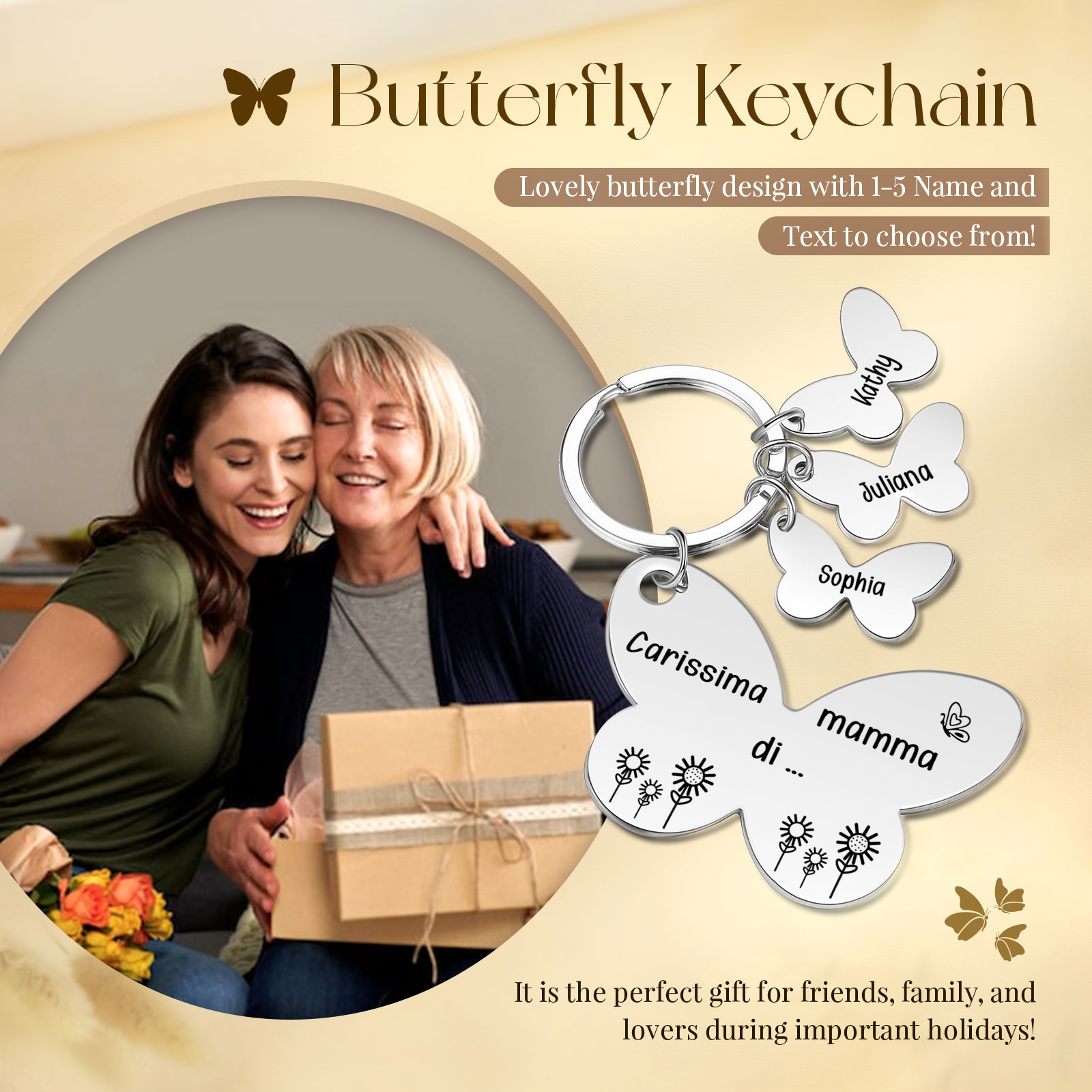 Carissima mamma di-Portachiavi con ciondolo di farfalla e fiori con 1 testo e 3 nomi personalizzati