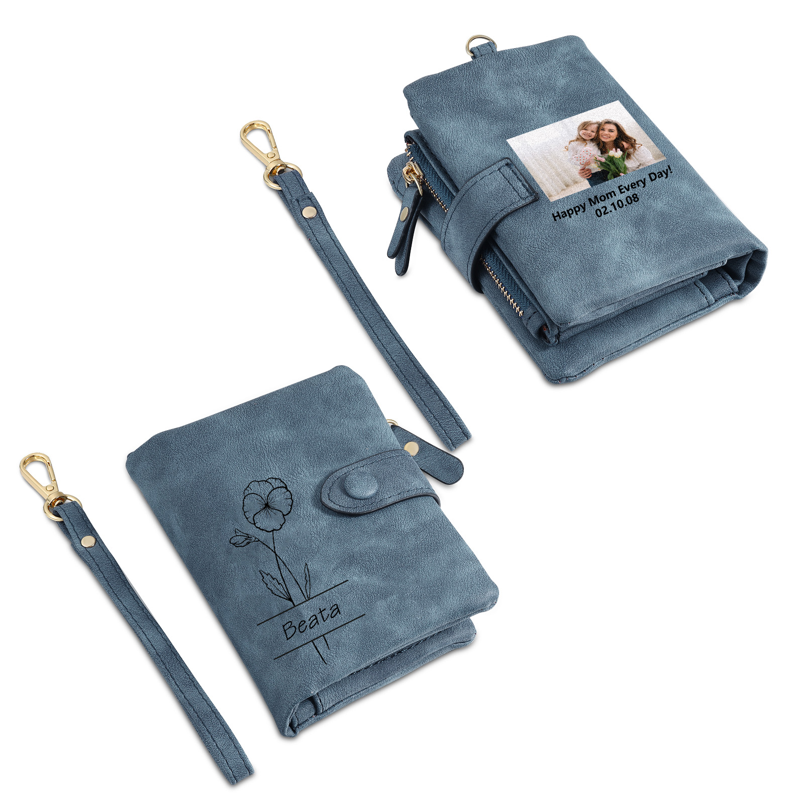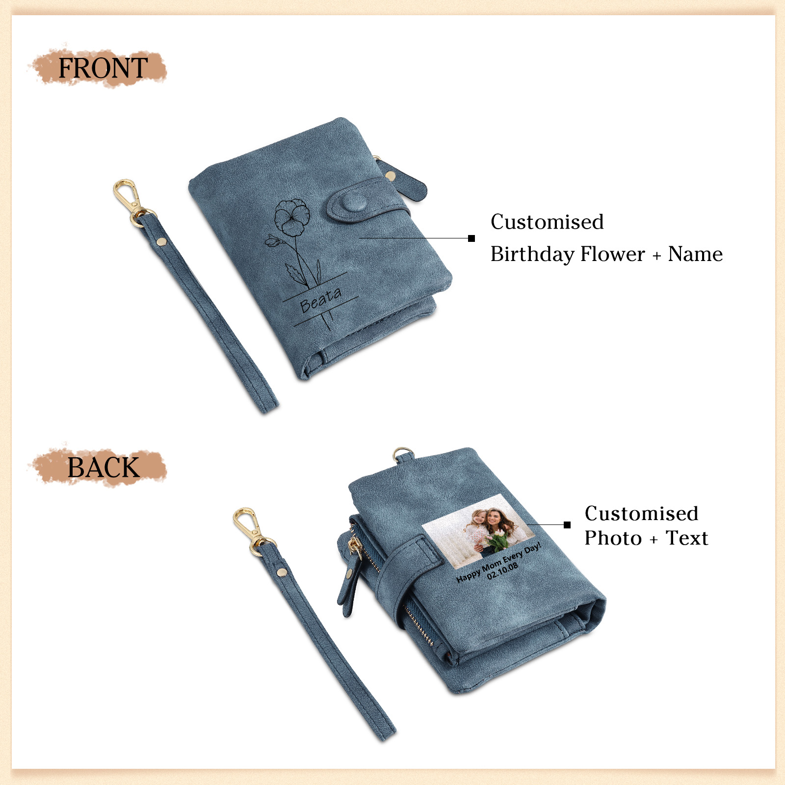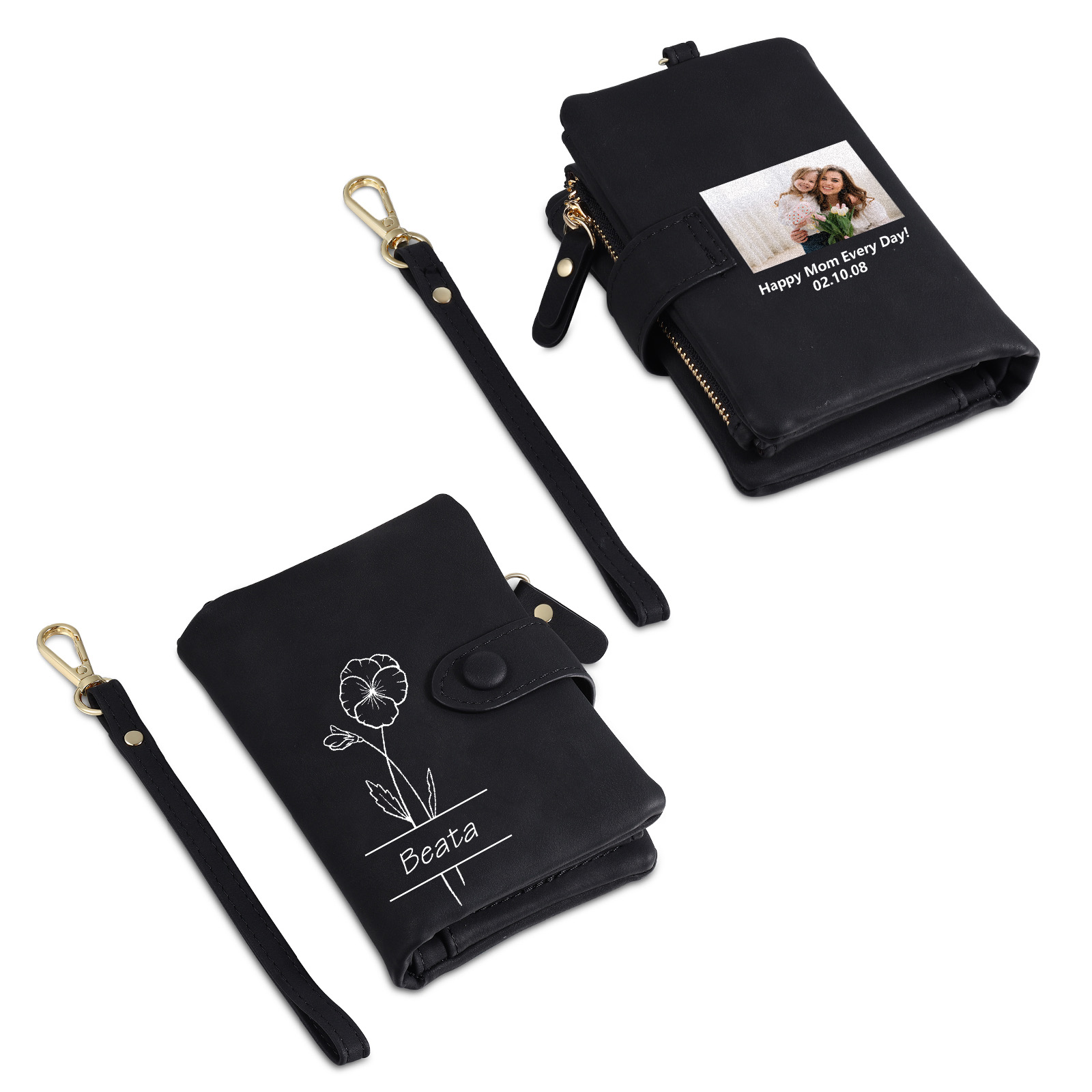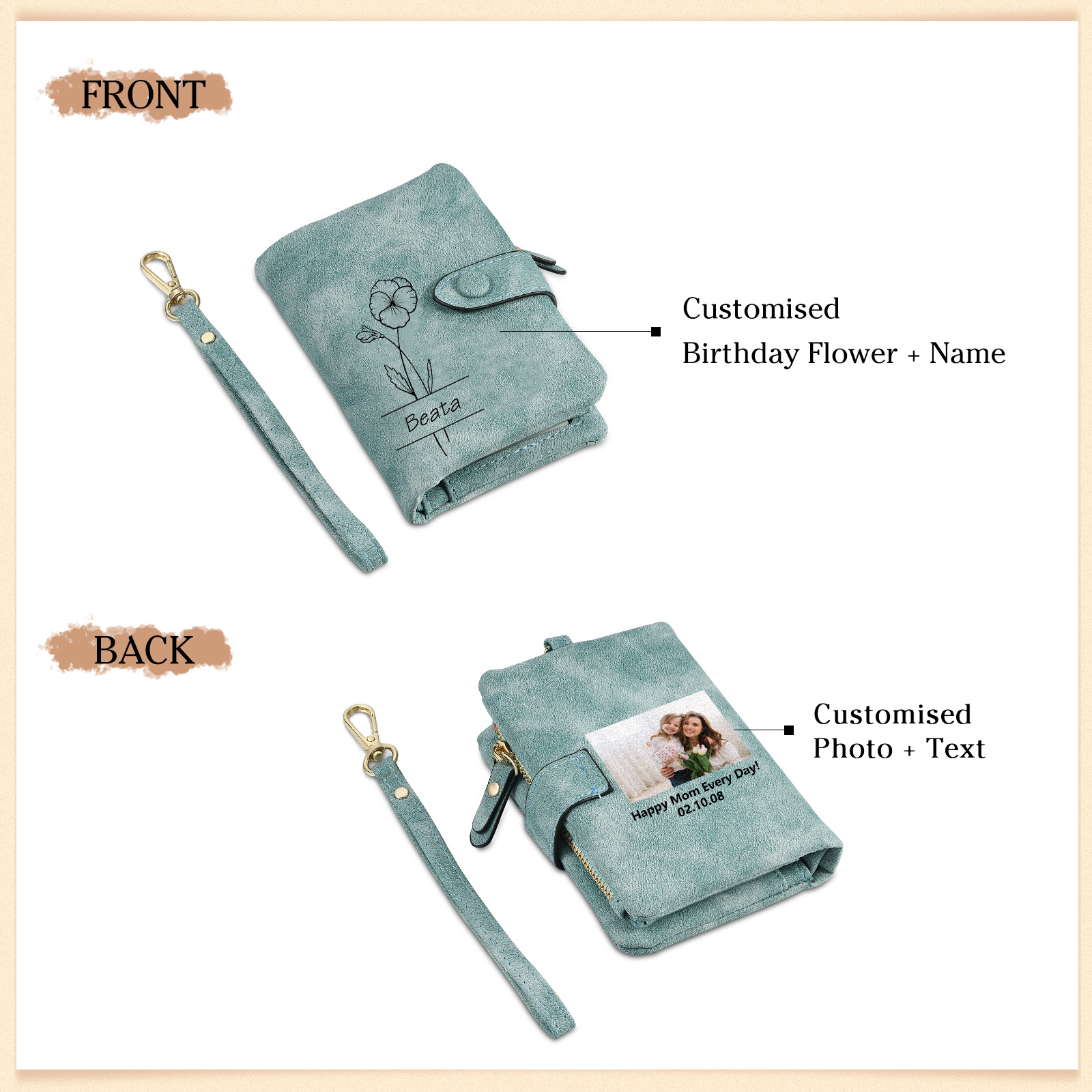 Portafoglio in PU pelle 1 nome,1 foto,1 testo e 1 fiore di nascita regalo personalizzato per donna