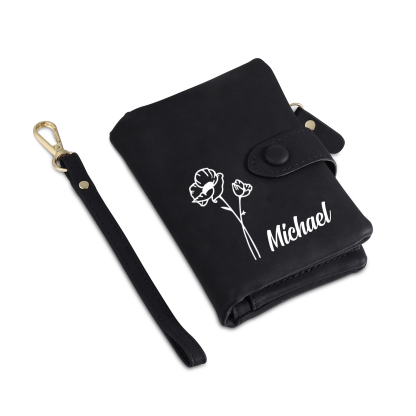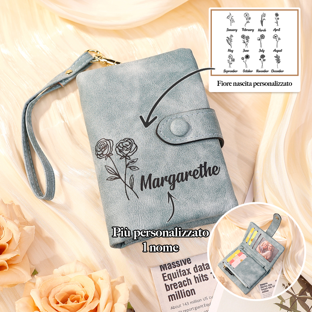 Portafoglio in PU pelle 1 nome e 1 fiore di nascita personalizzabili regalo personalizzato per donna
