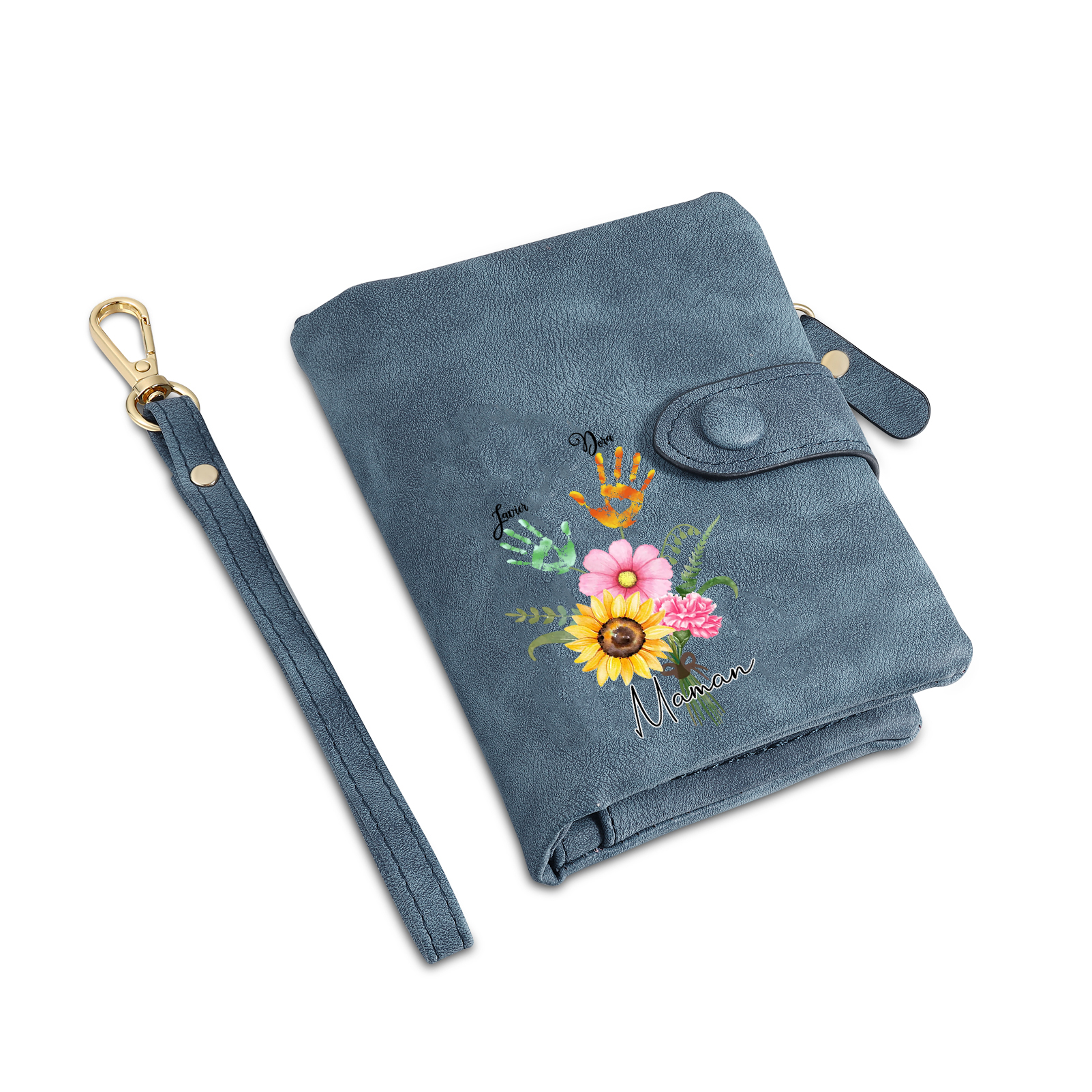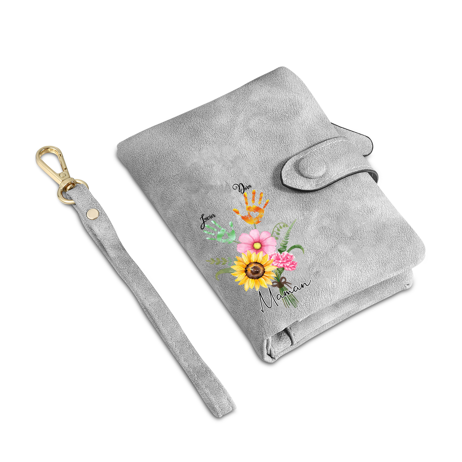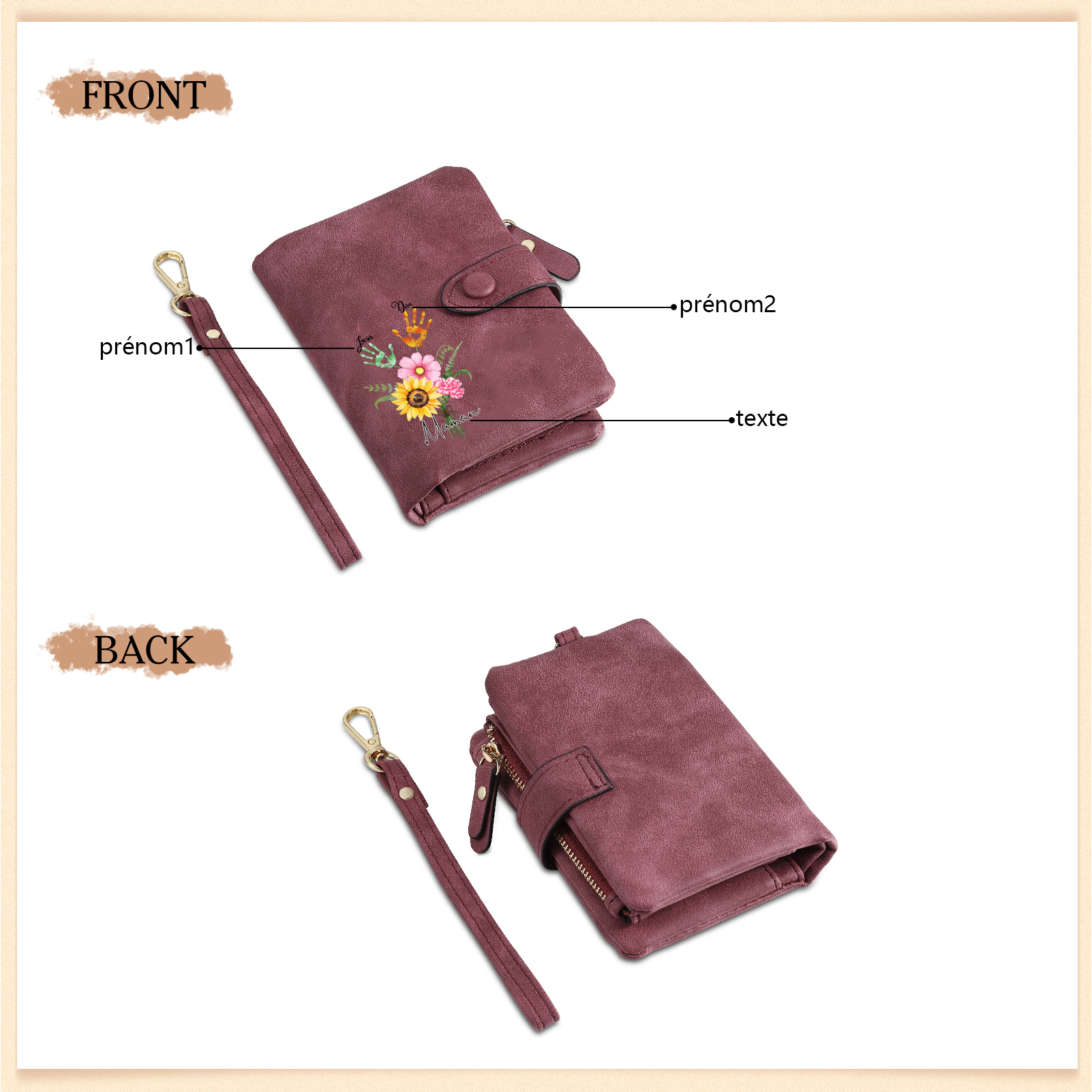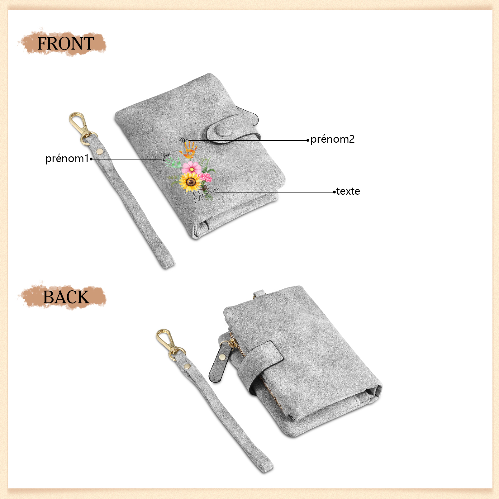 Portafoglio in PU pelle un mazzo di fiori con 2 nomi e 1 testo personalizzati per mamma/nonna