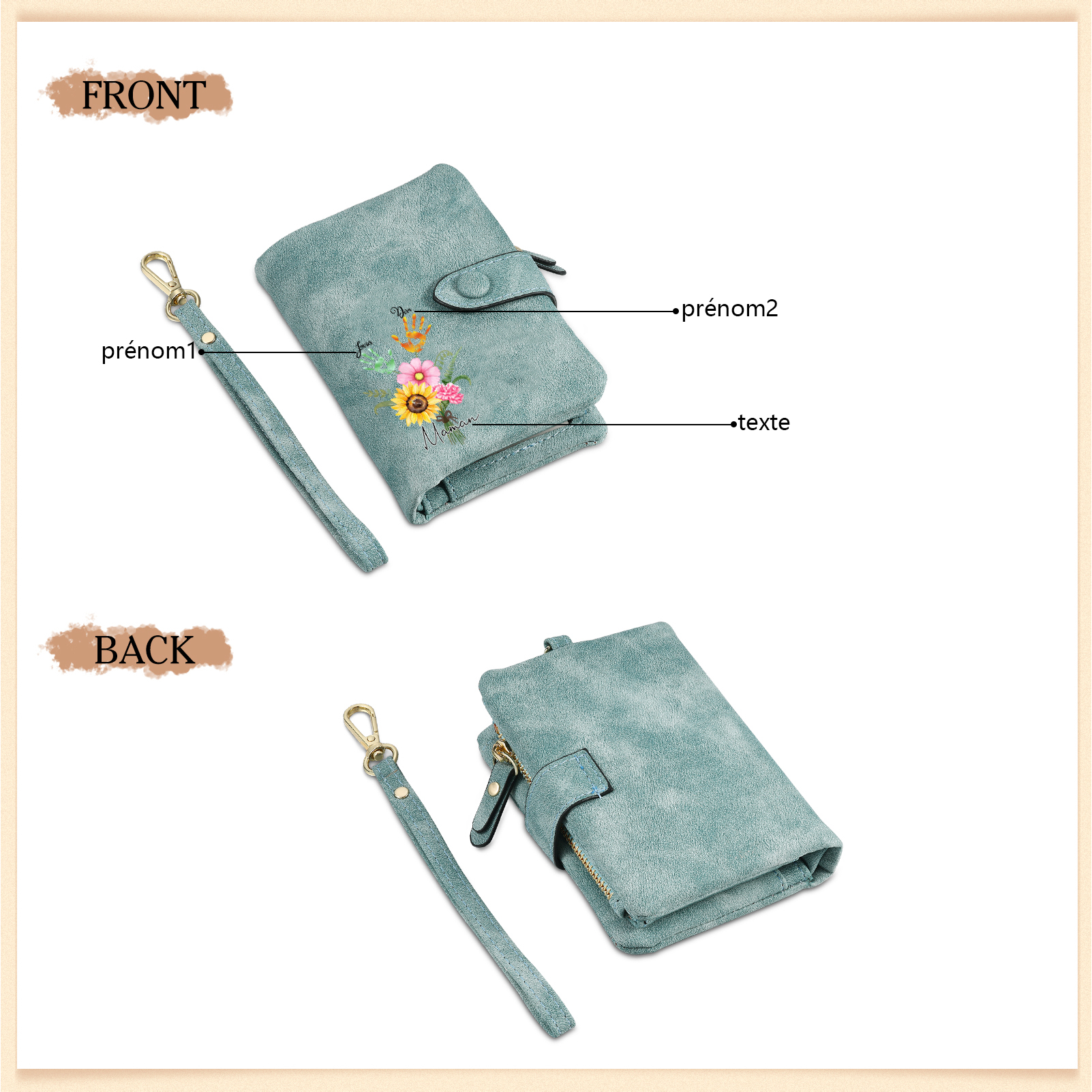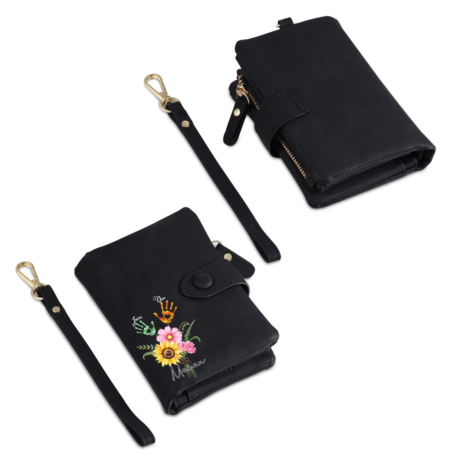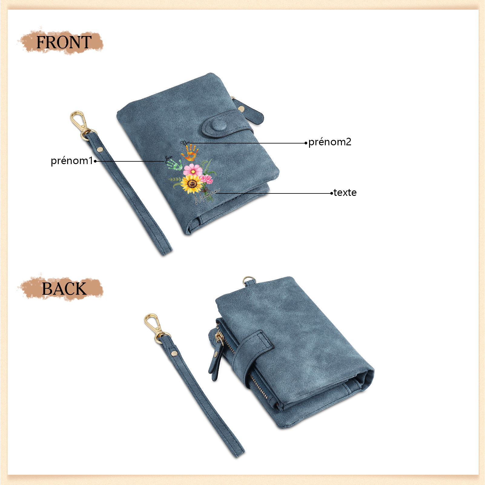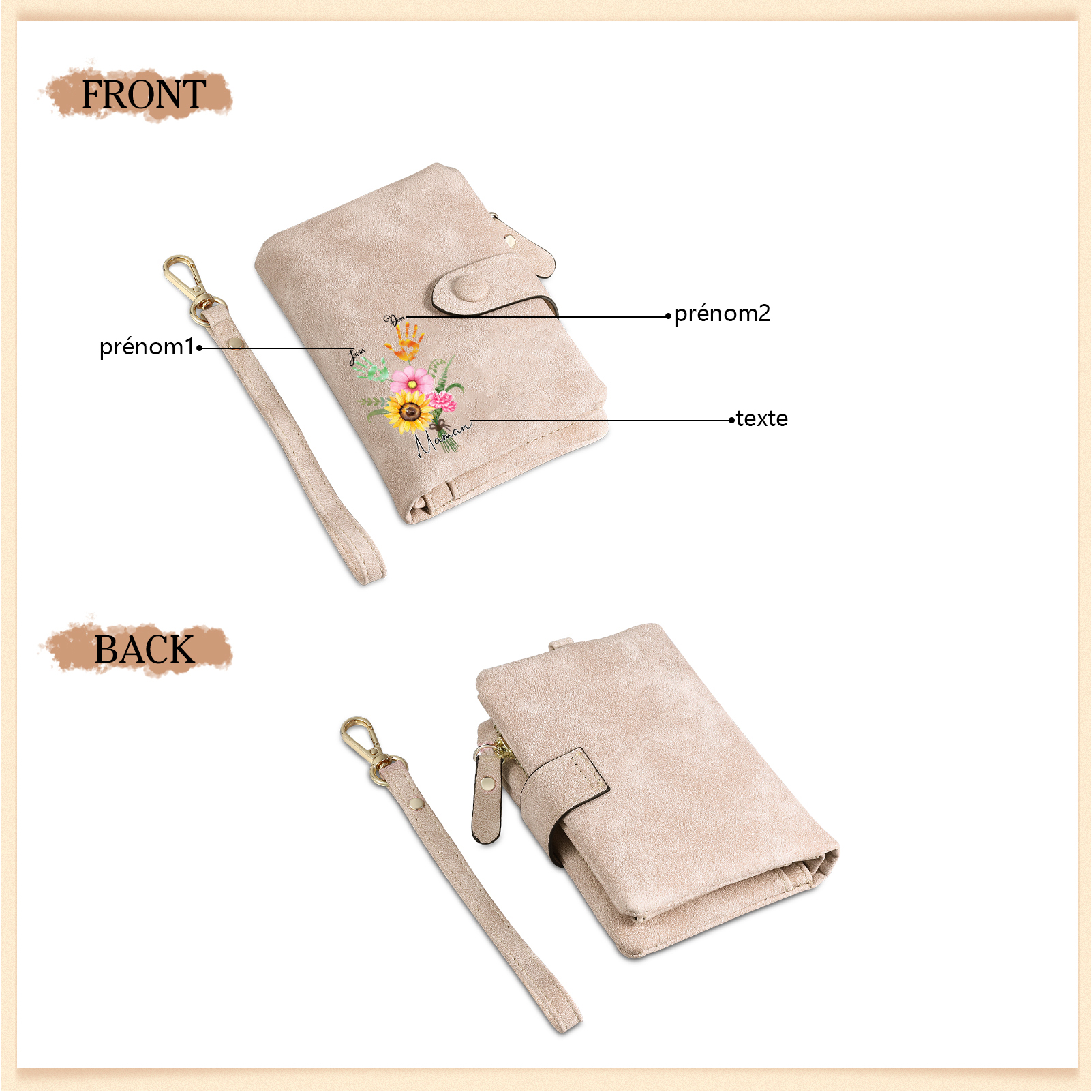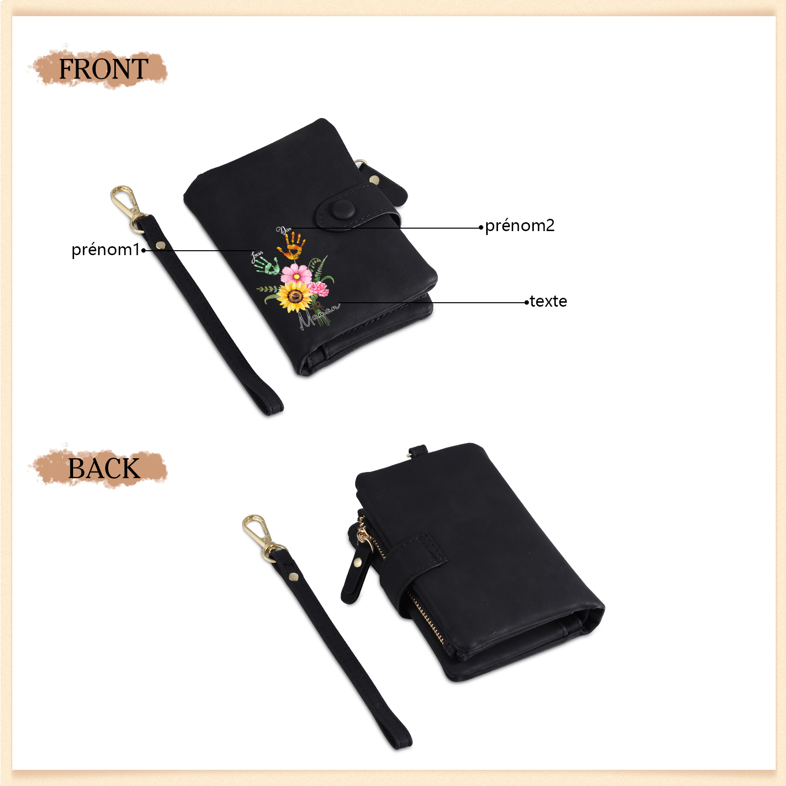 Portafoglio in PU pelle un mazzo di fiori con 2 nomi e 1 testo personalizzati per mamma/nonna