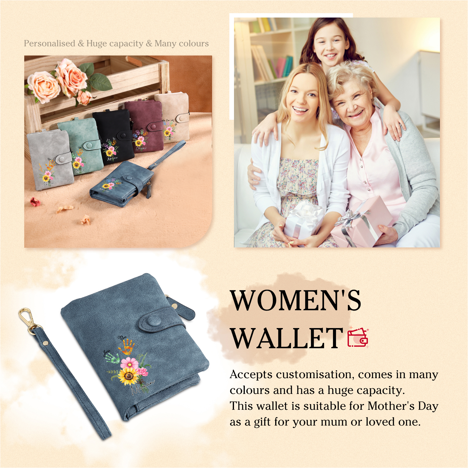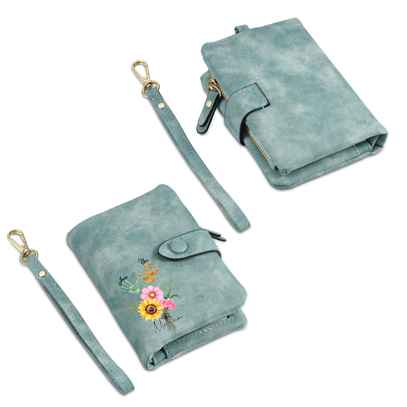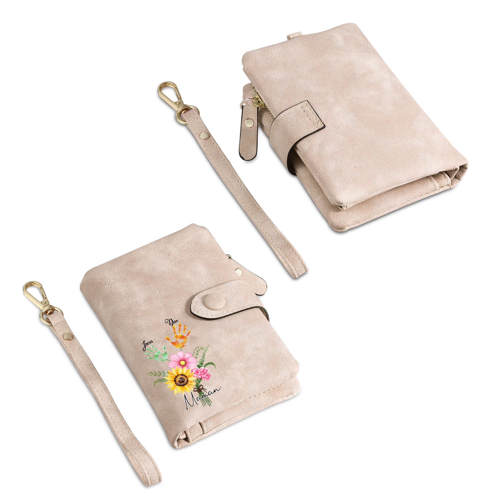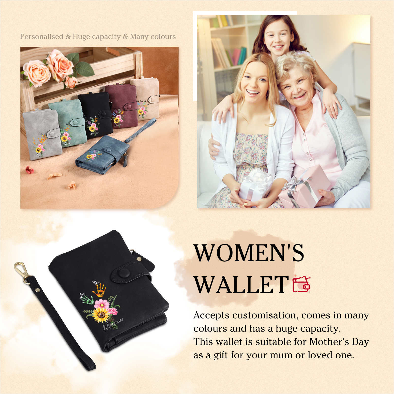 Portafoglio in PU pelle un mazzo di fiori con 2 nomi e 1 testo personalizzati per mamma/nonna