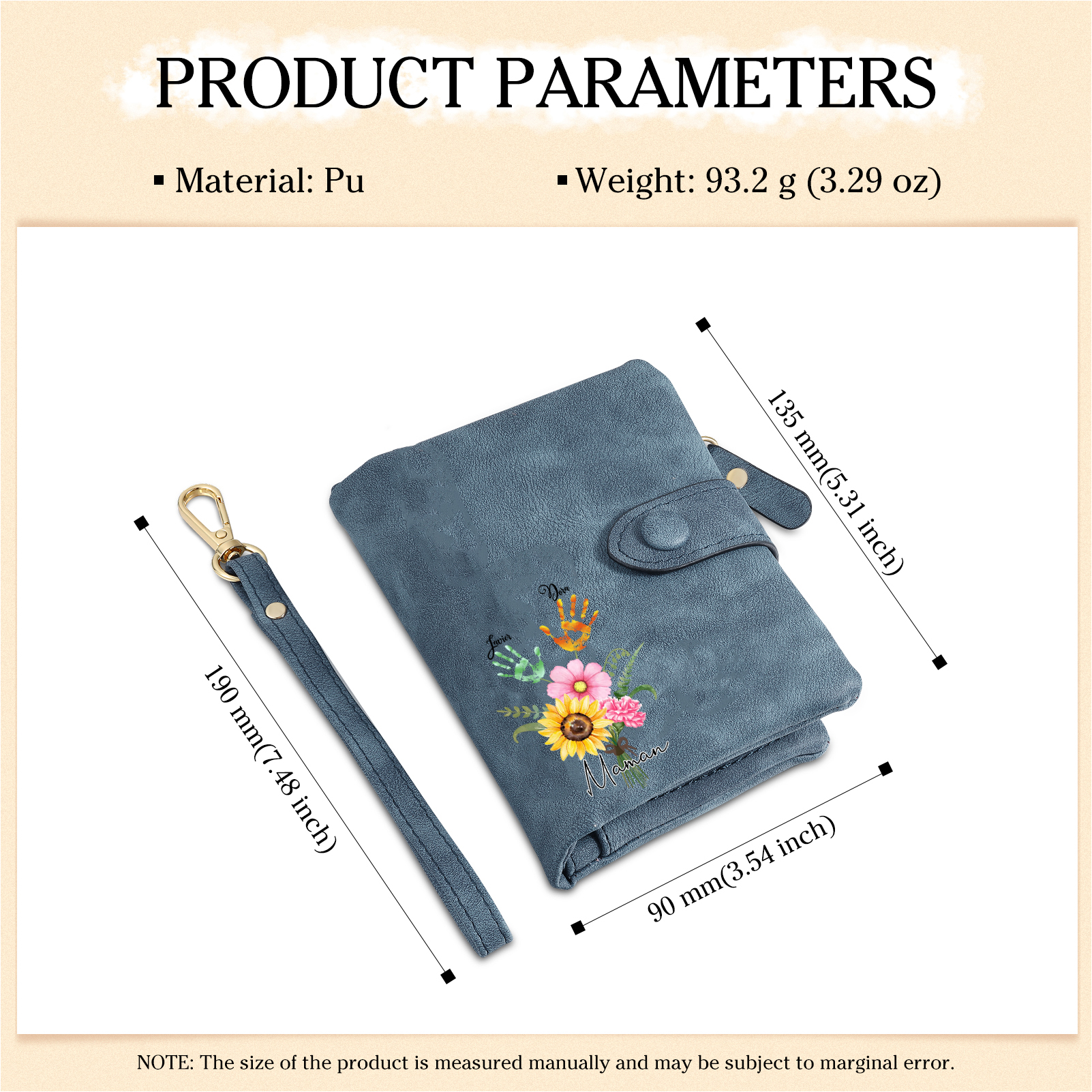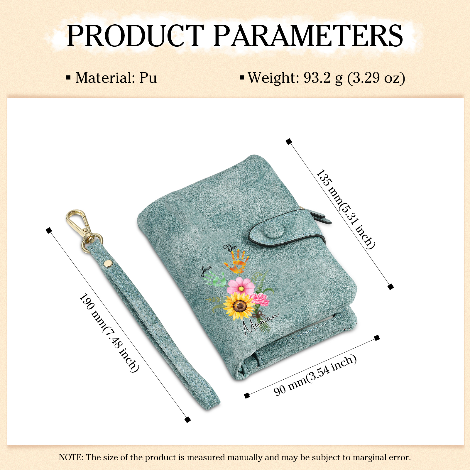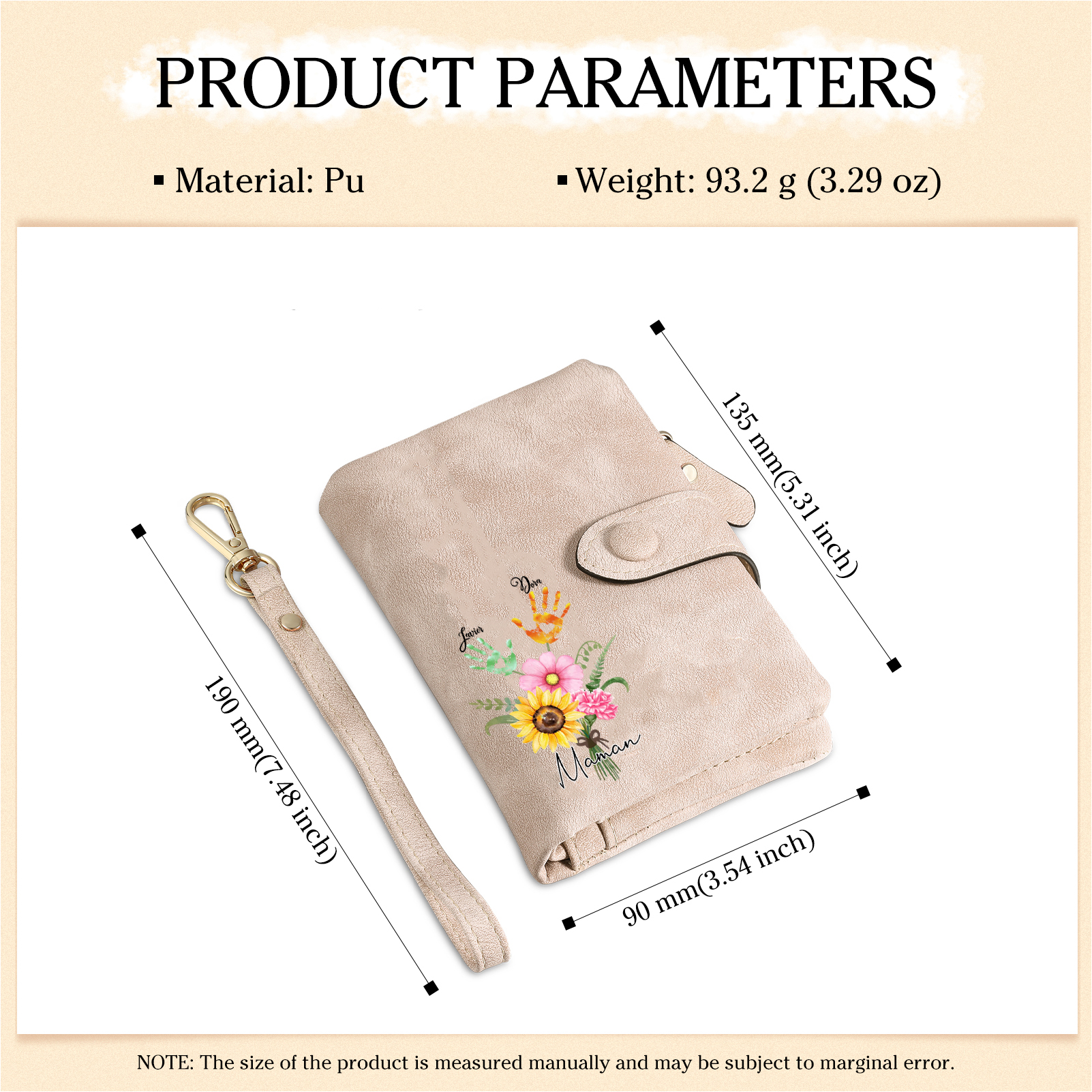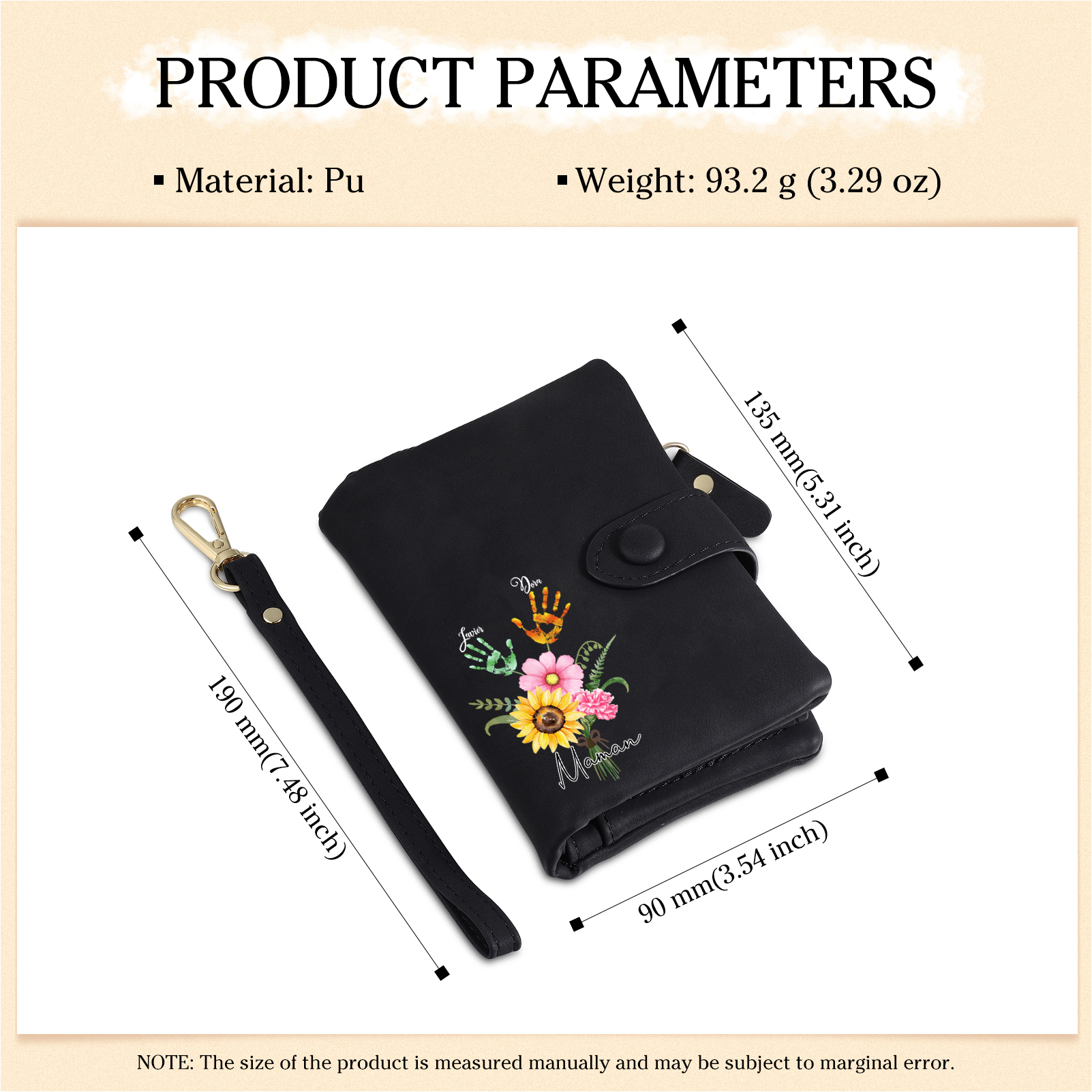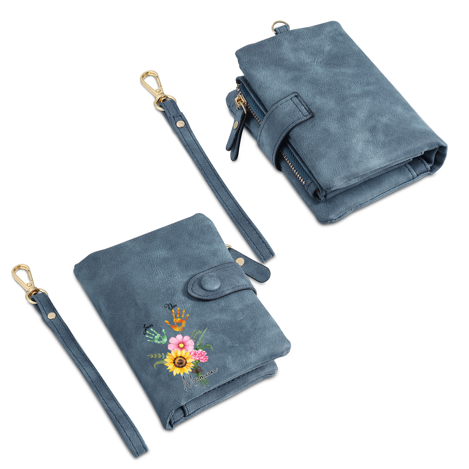 Portafoglio in PU pelle un mazzo di fiori con 2 nomi e 1 testo personalizzati per mamma/nonna