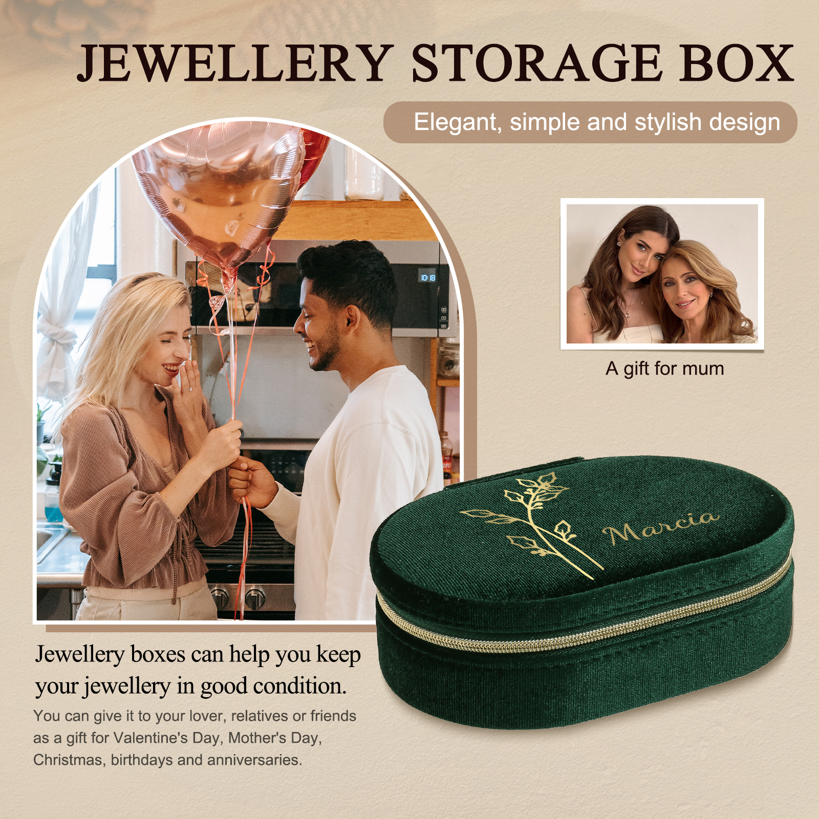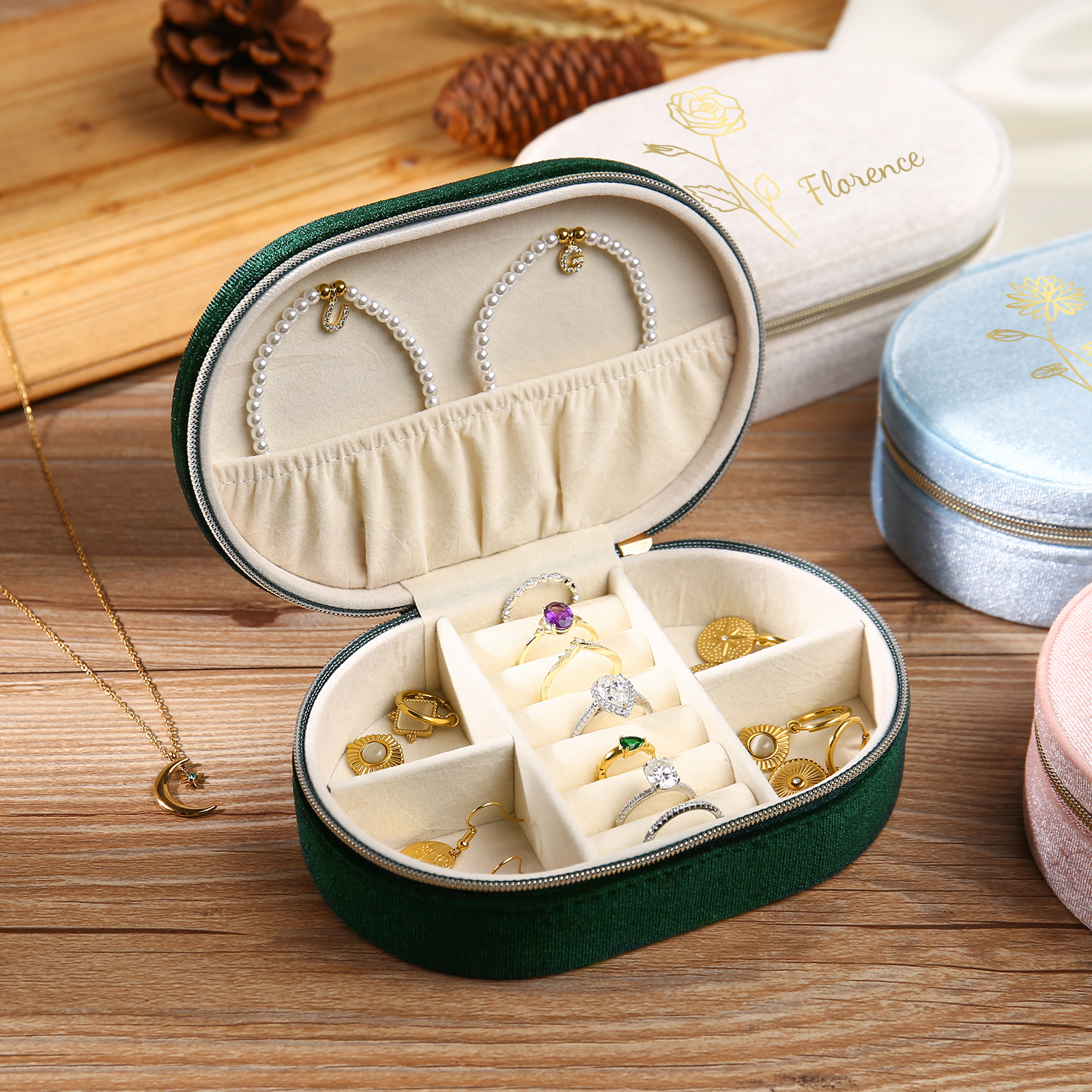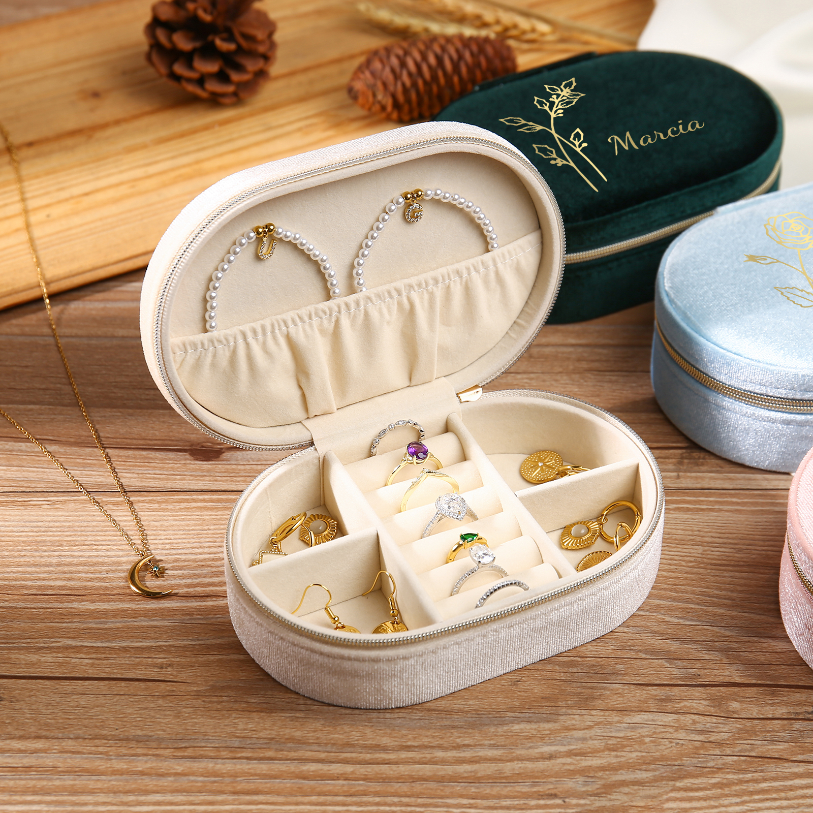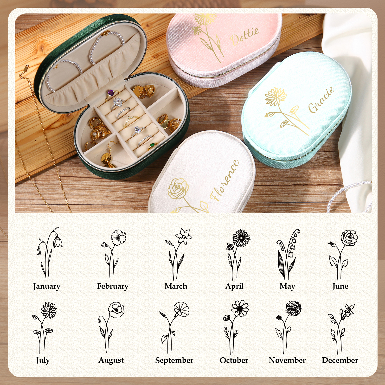 Portagioie in velluto con 1 nome e 1 fiore di nascita personalizzati regalo per donna