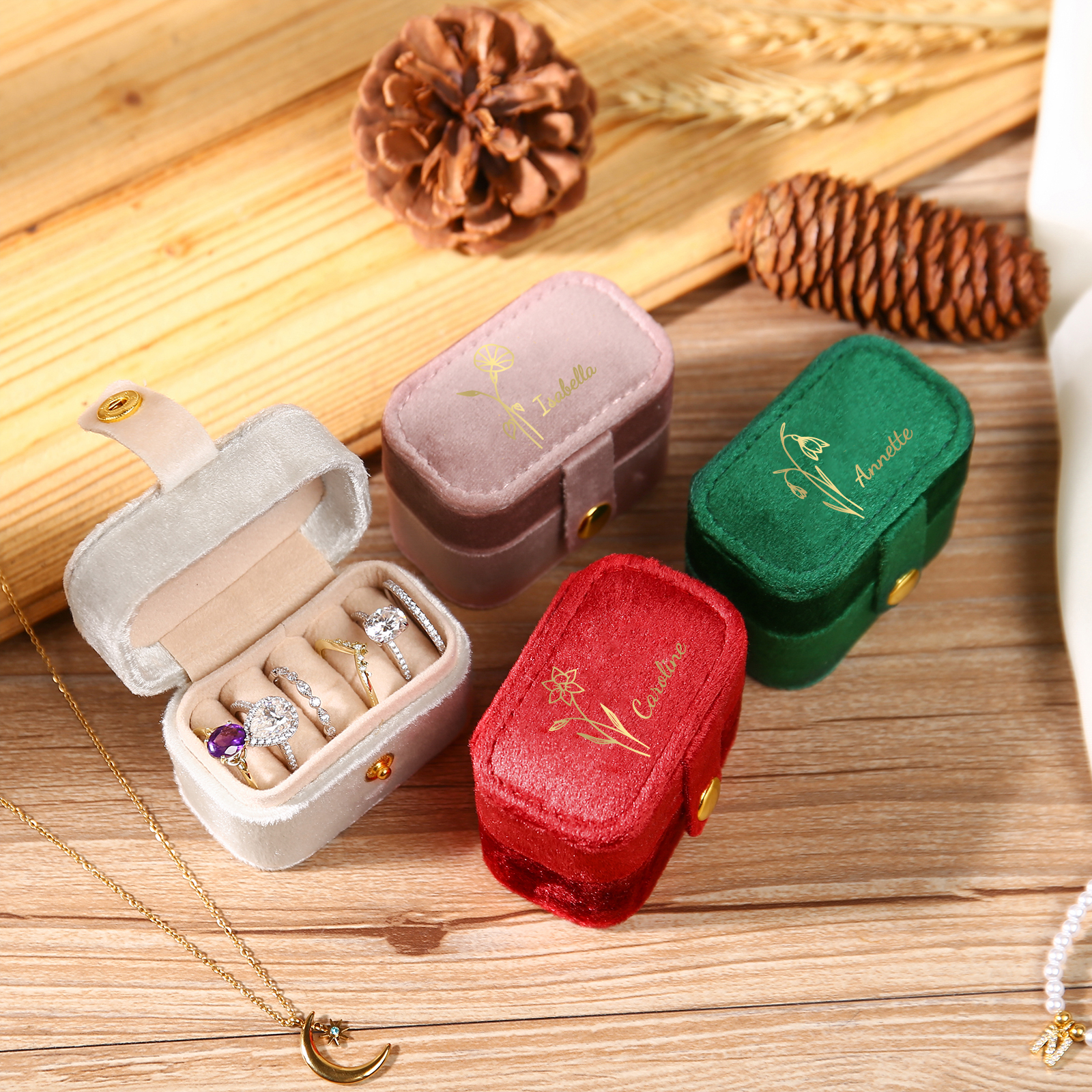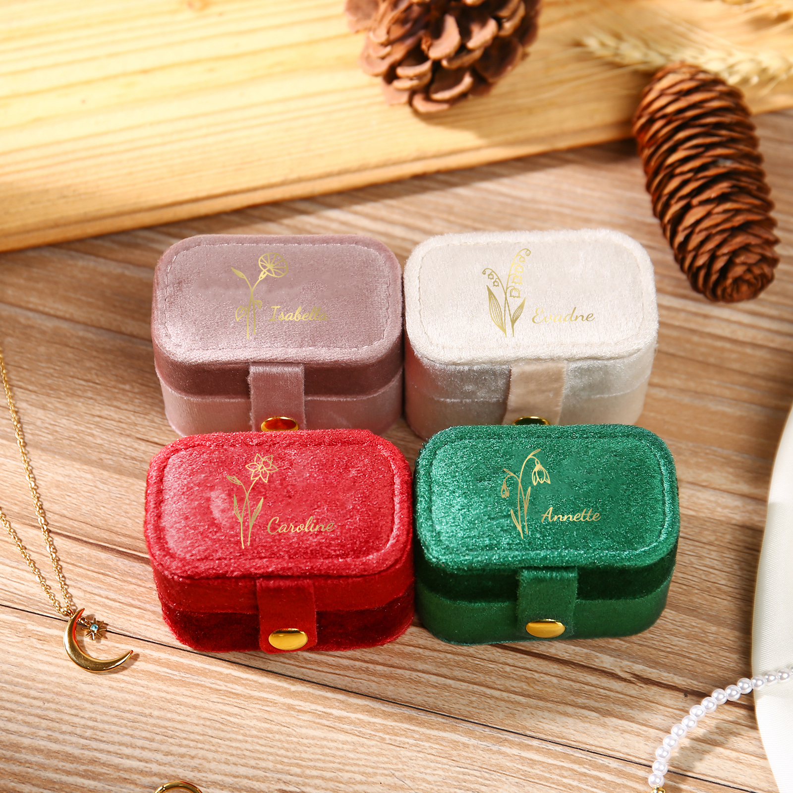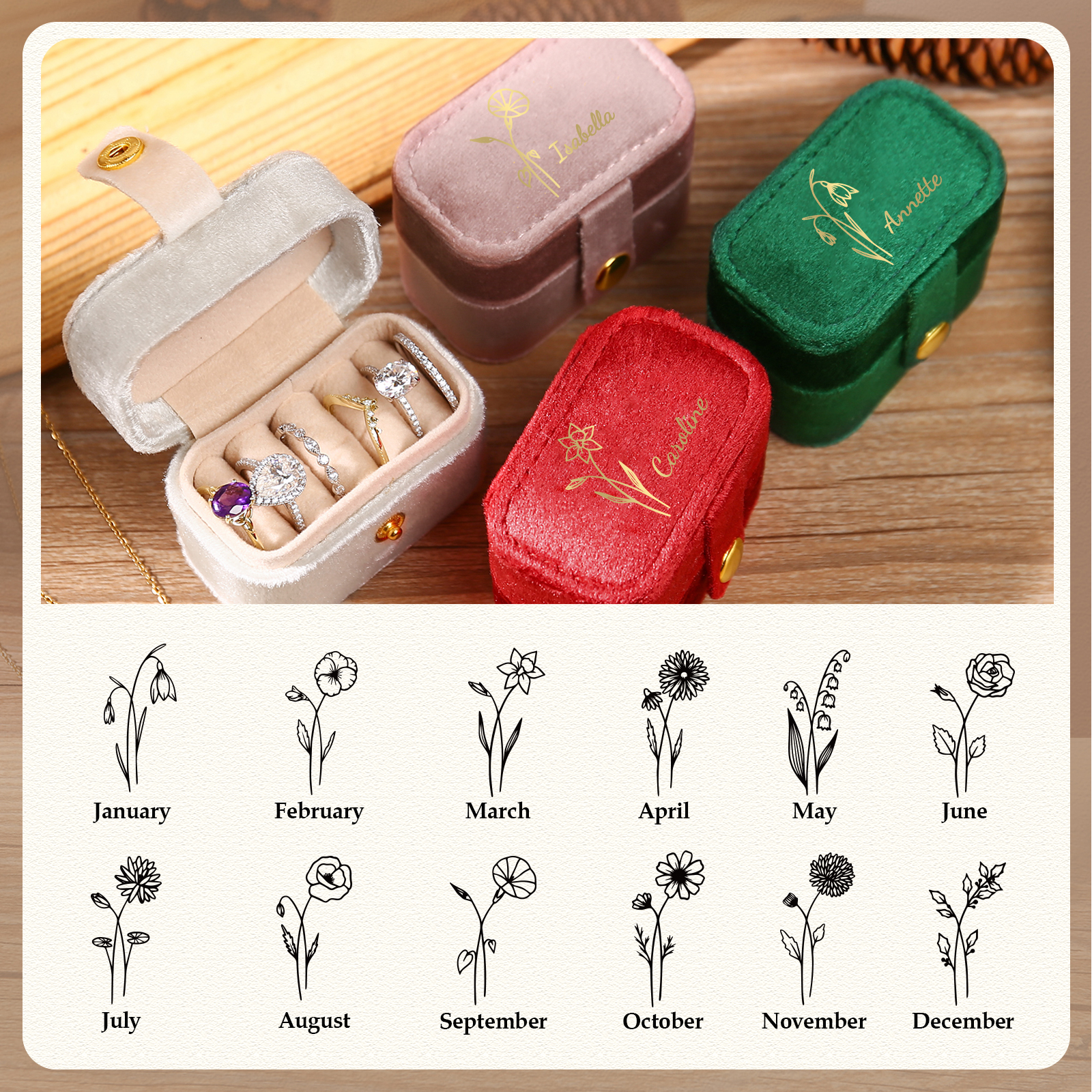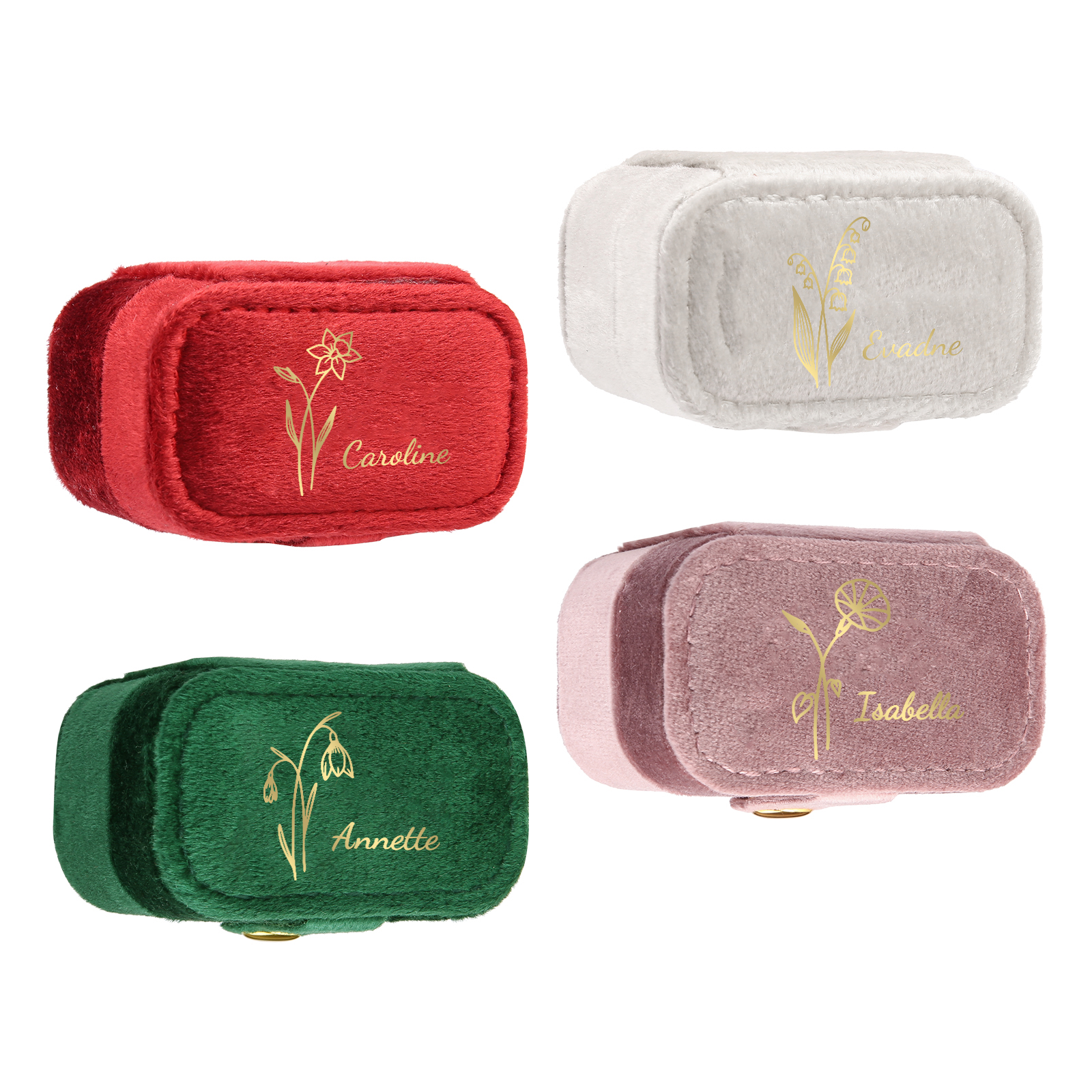 Portagioie in velluto con 1 nome e 1 fiore di nascita personalizzati regalo per donna