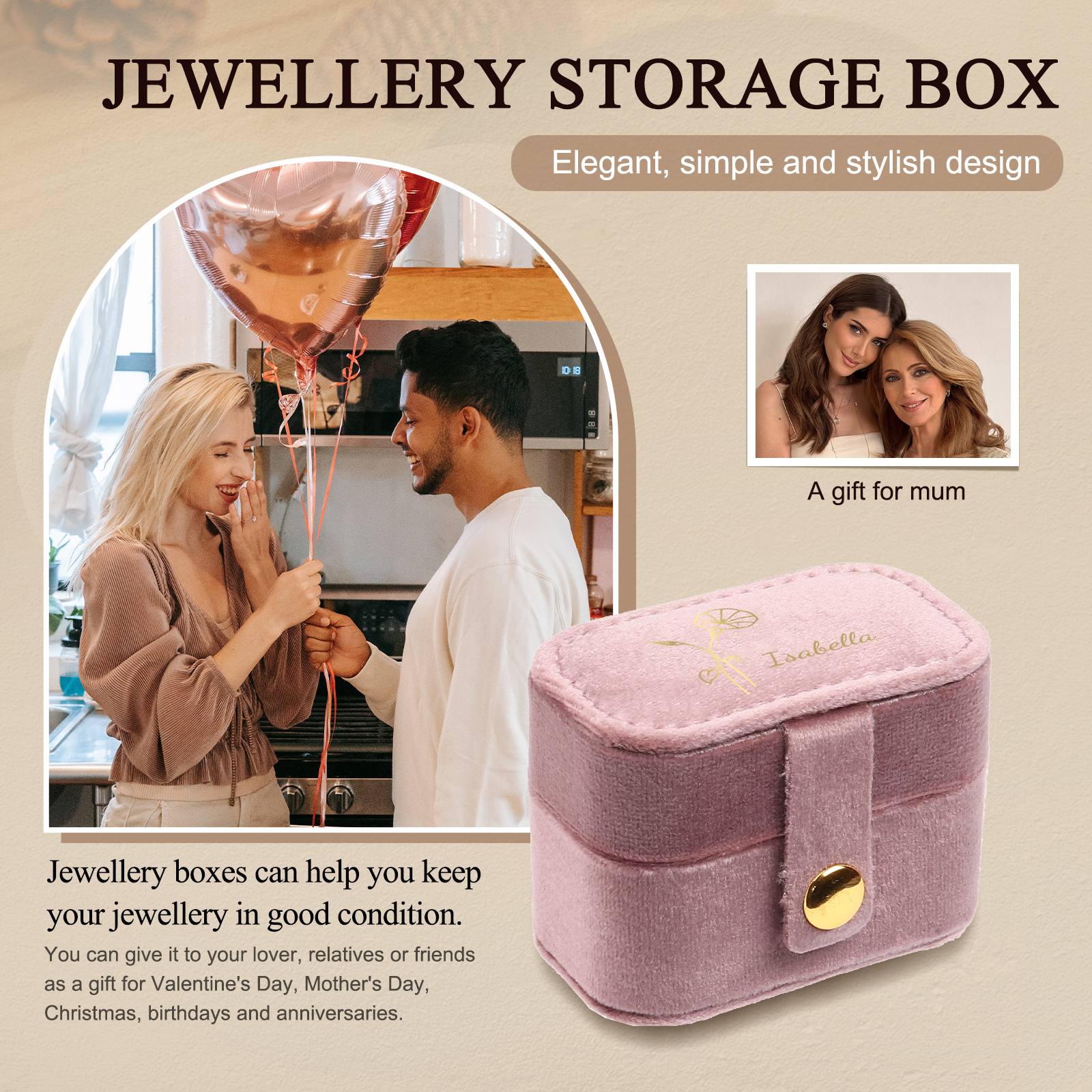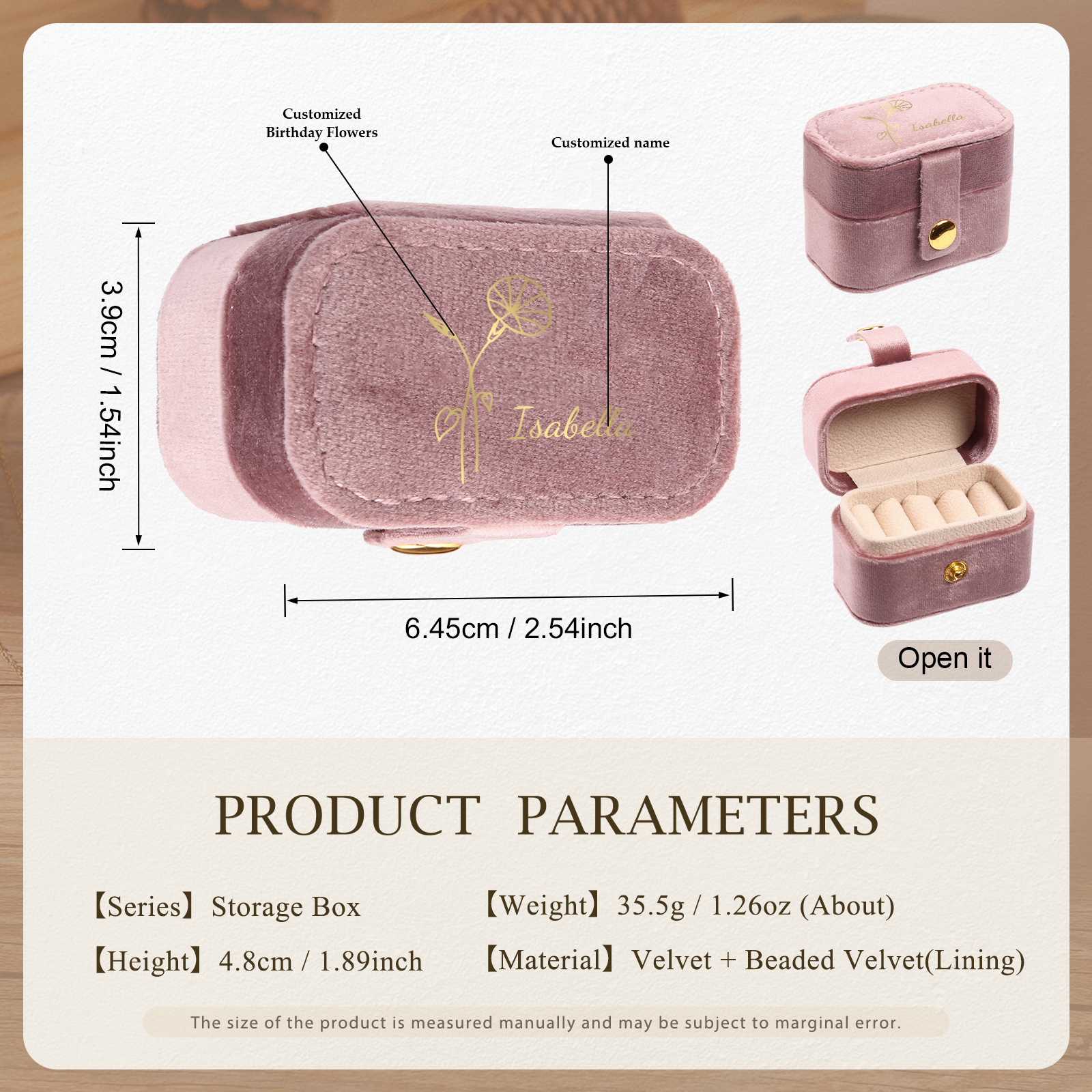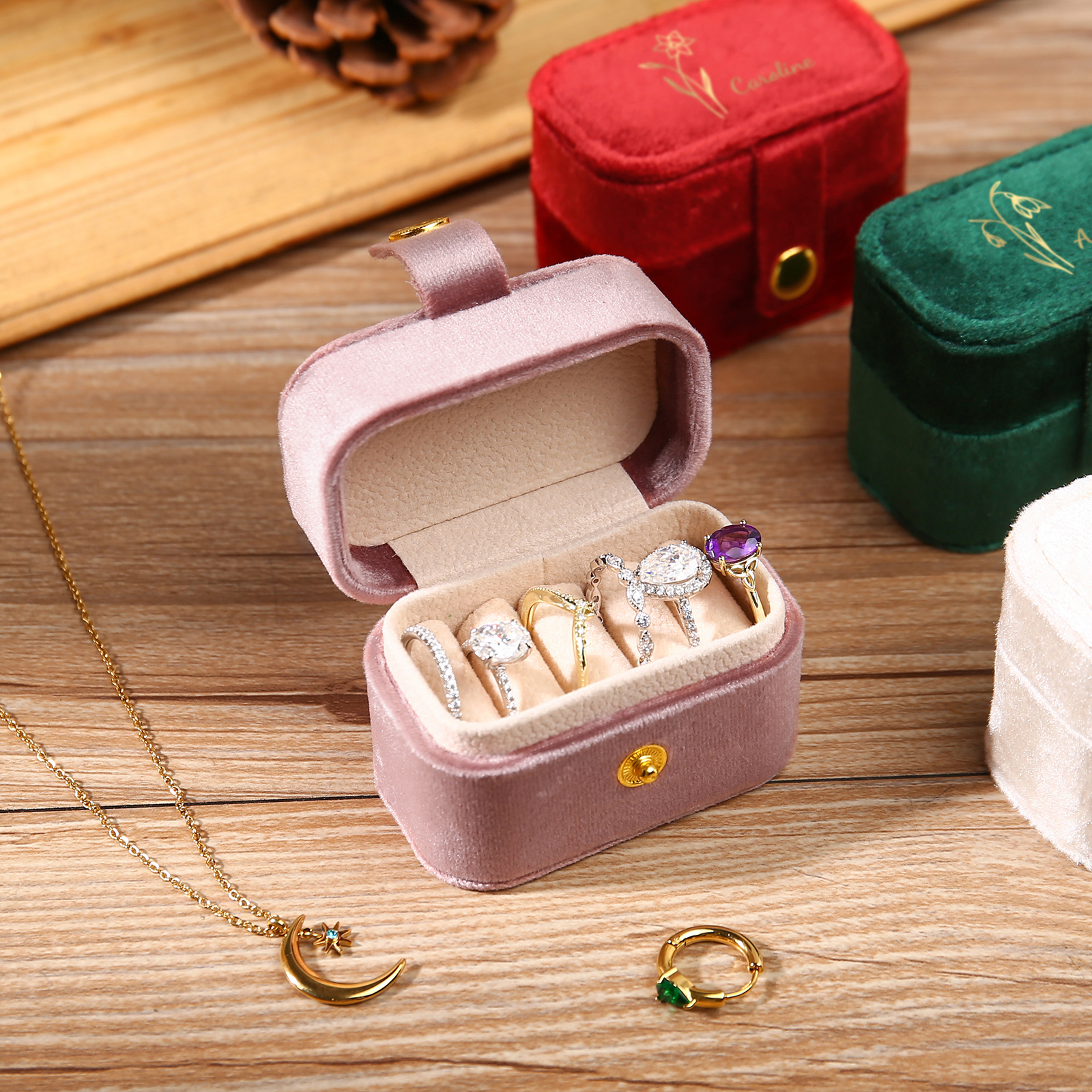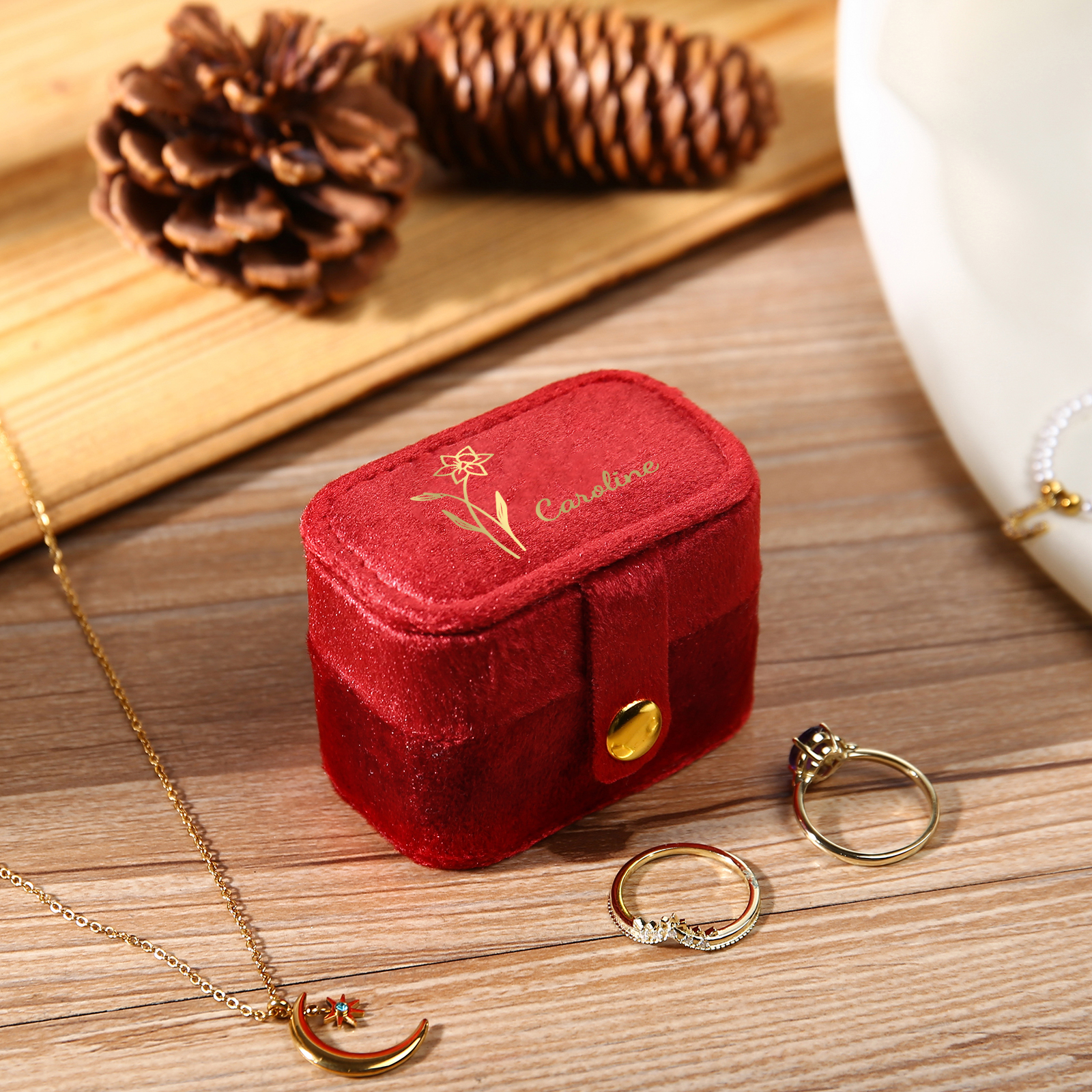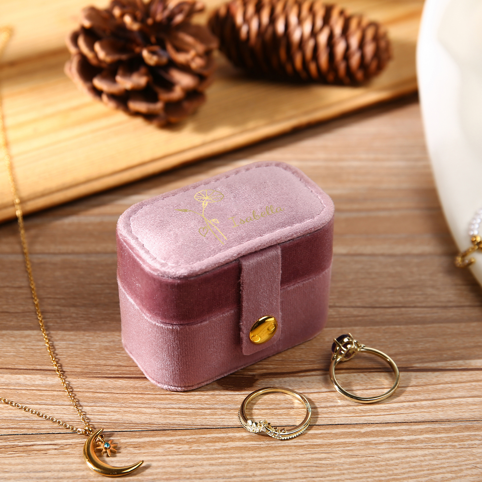 Portagioie in velluto con 1 nome e 1 fiore di nascita personalizzati regalo per donna