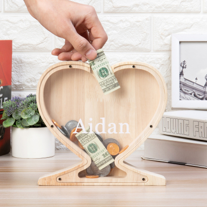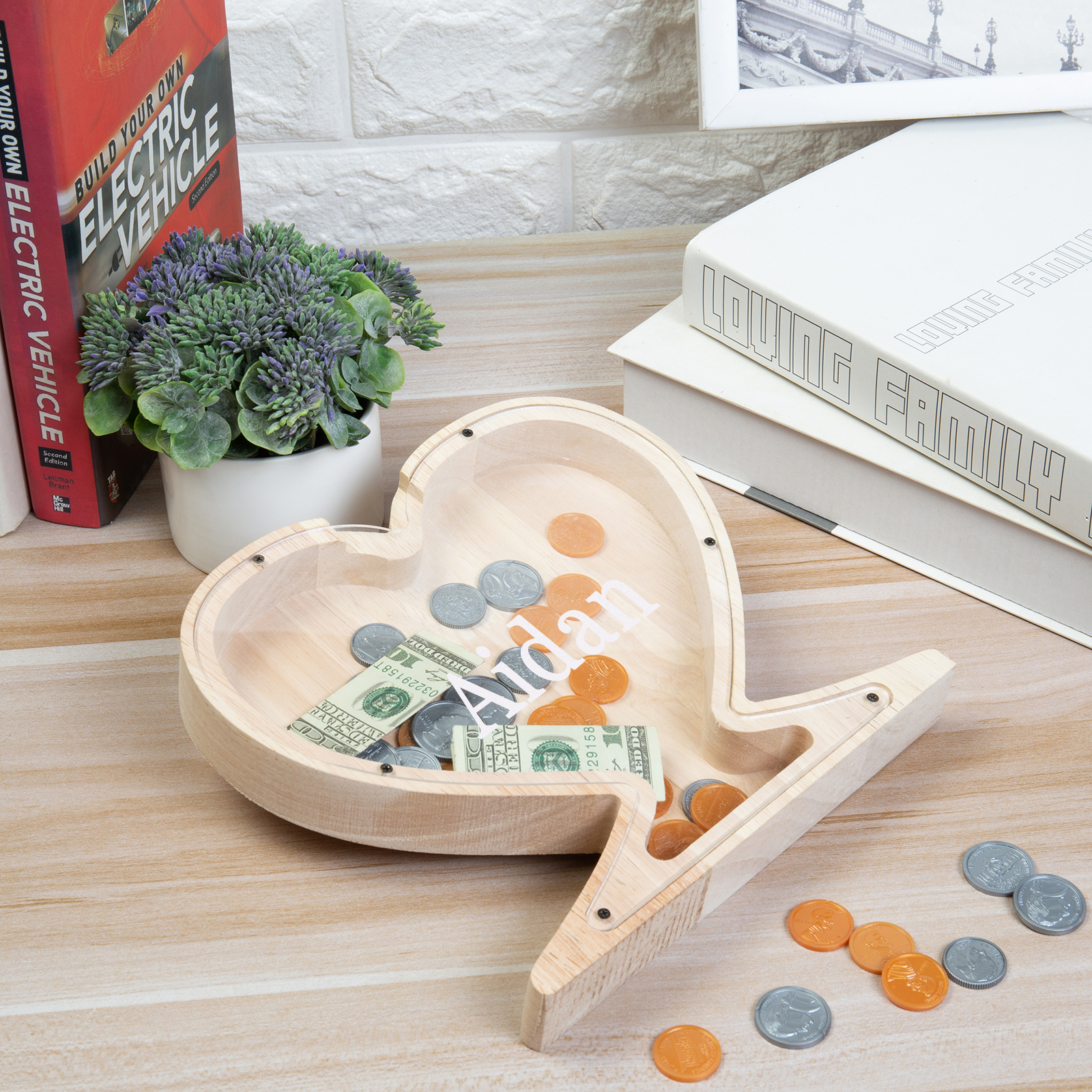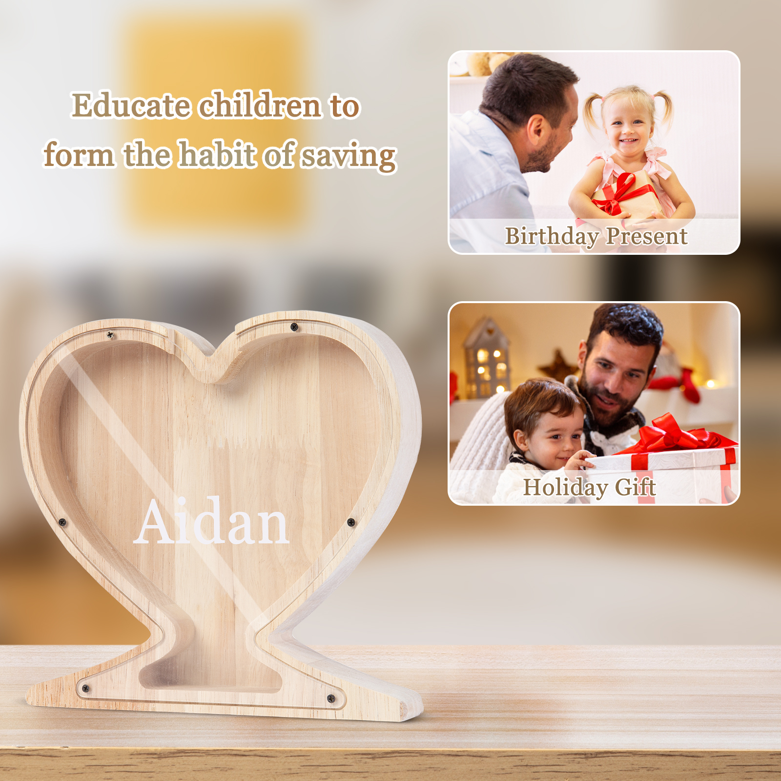 Salvadanaio in legno cuore personalizzato con 1 nome regalo per i bambini